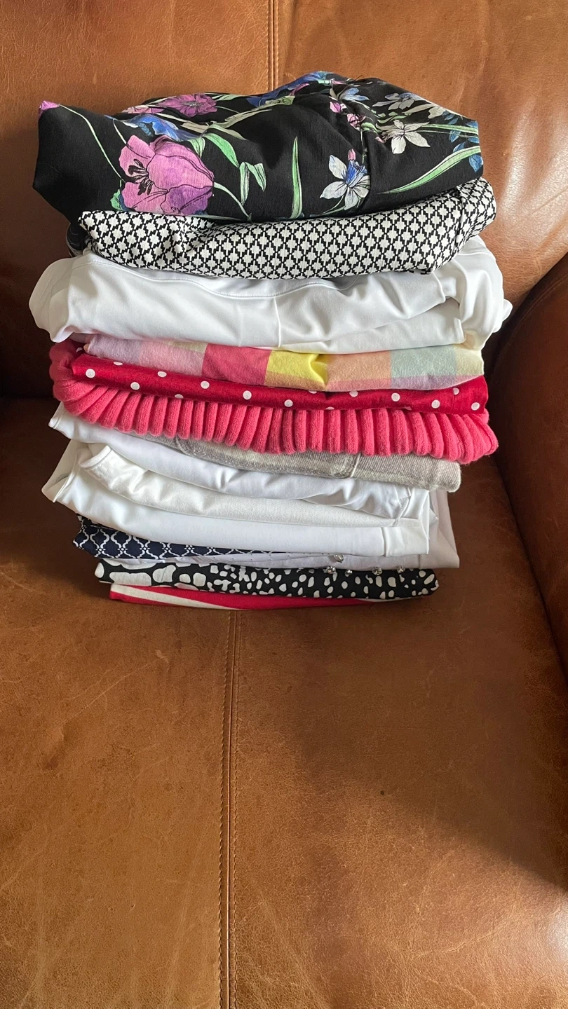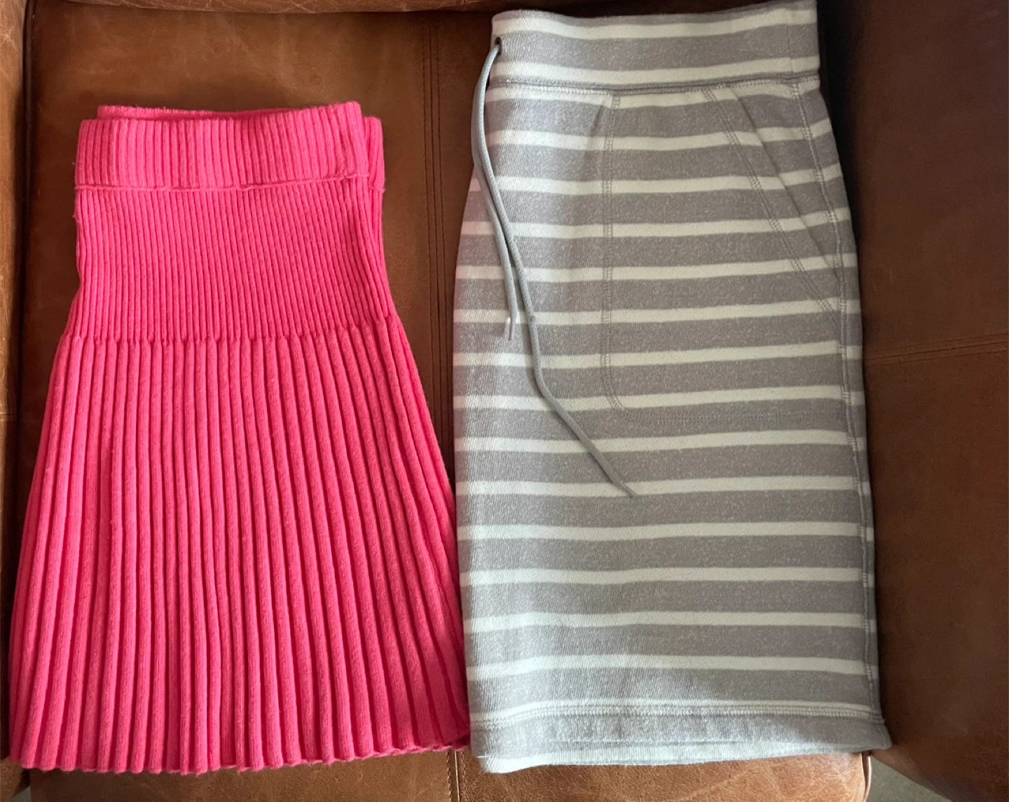 Very good condition… different brands include Roots, puma , etc. Collection of 14 skirts featuring diverse prints and colours. Includes striped, floral, plaid, polka dot, and geometric designs. Various materials for different styles. Size: Large and Medium
