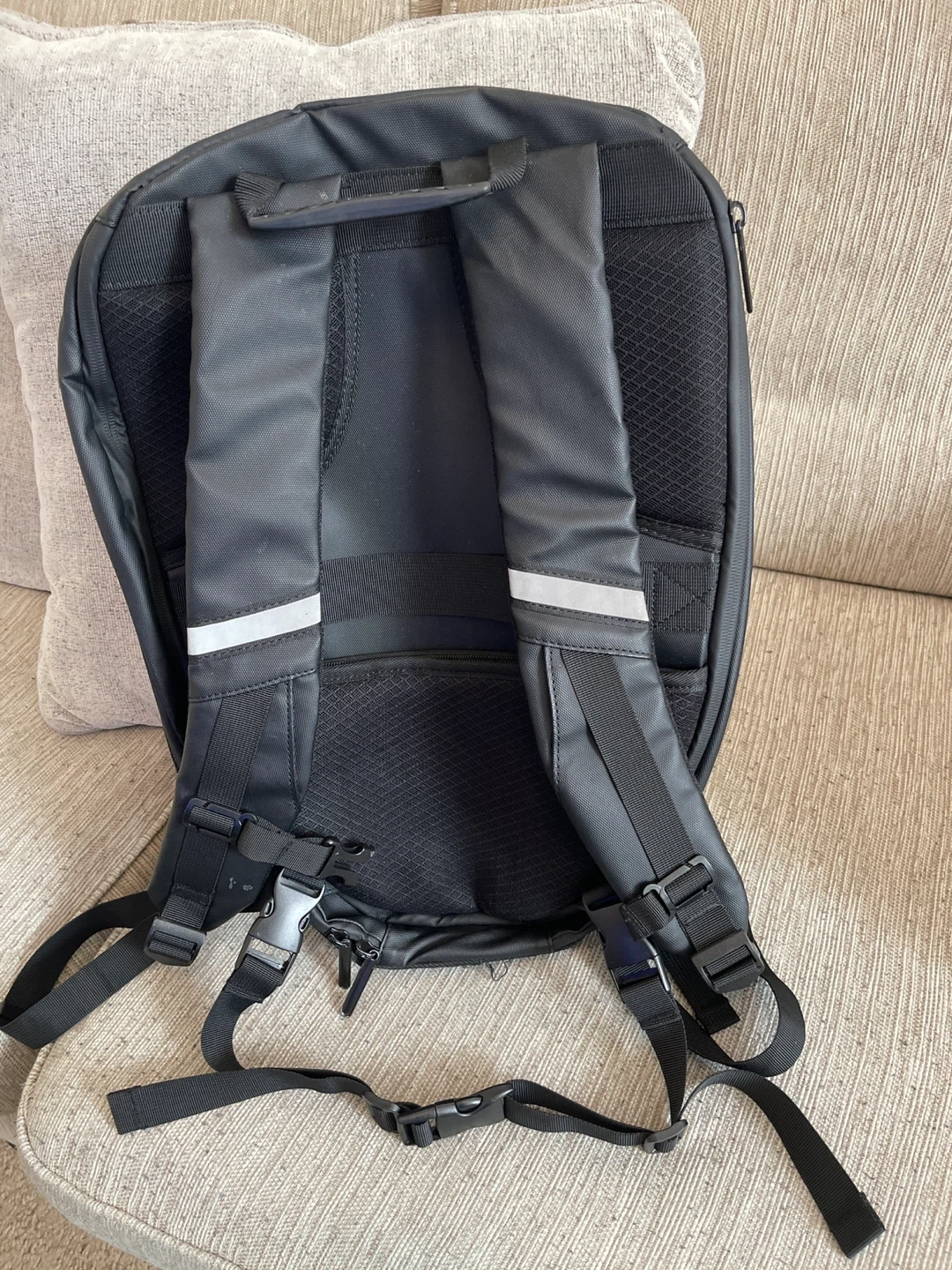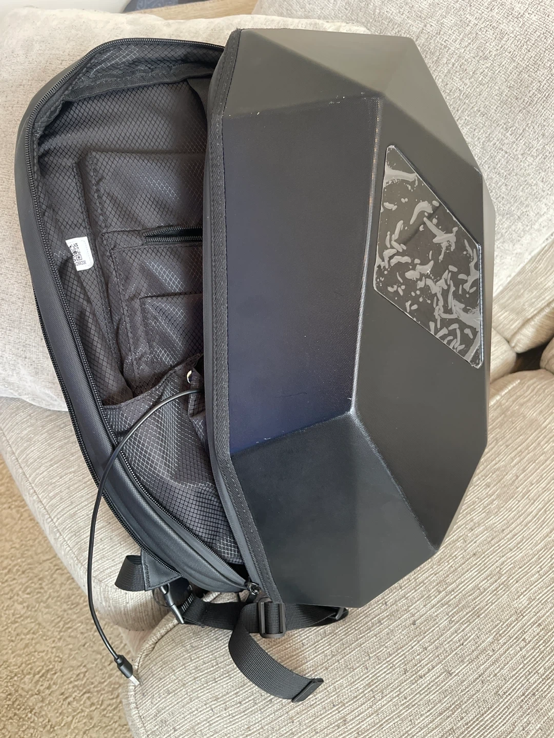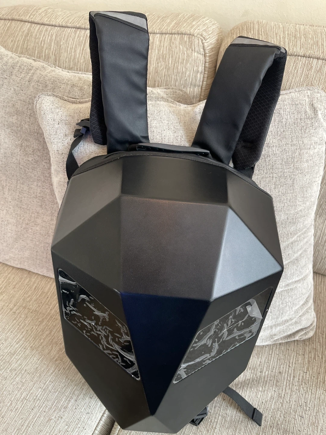 This black geometric backpack features a unique hard-shell design with a clear panel that can display LED patterns. It has a spacious interior with compartments for organization and padded straps for comfort. Integrated USB charging port available.