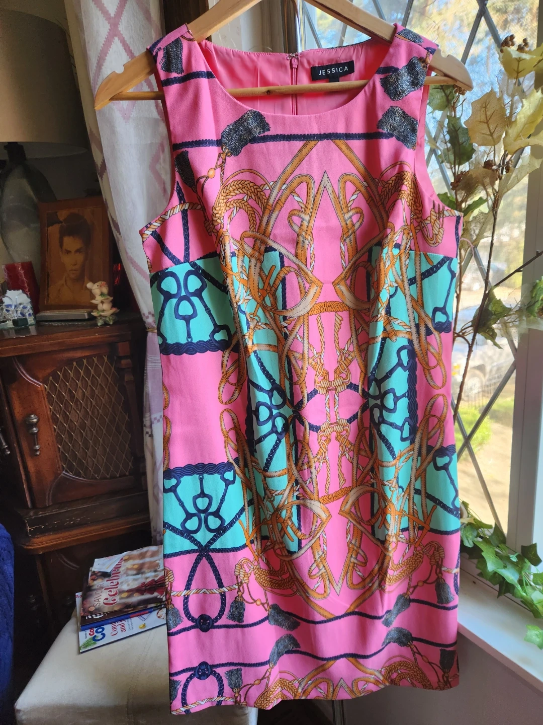 This is a sleeveless dress from Jessica. It features a vibrant pink background with a bold rope and equestrian-inspired print in gold, teal, and navy. The dress has a simple, classic silhouette.