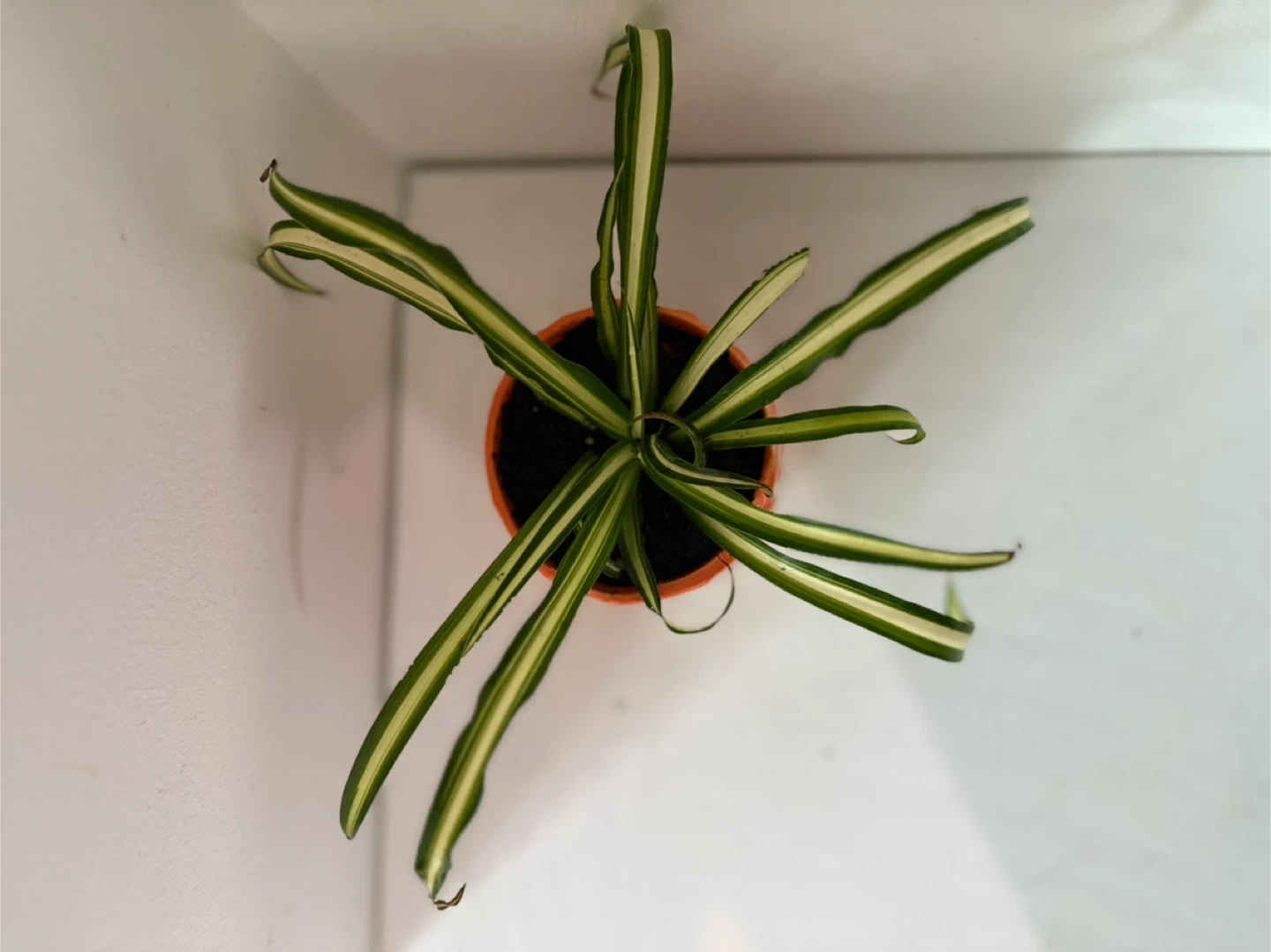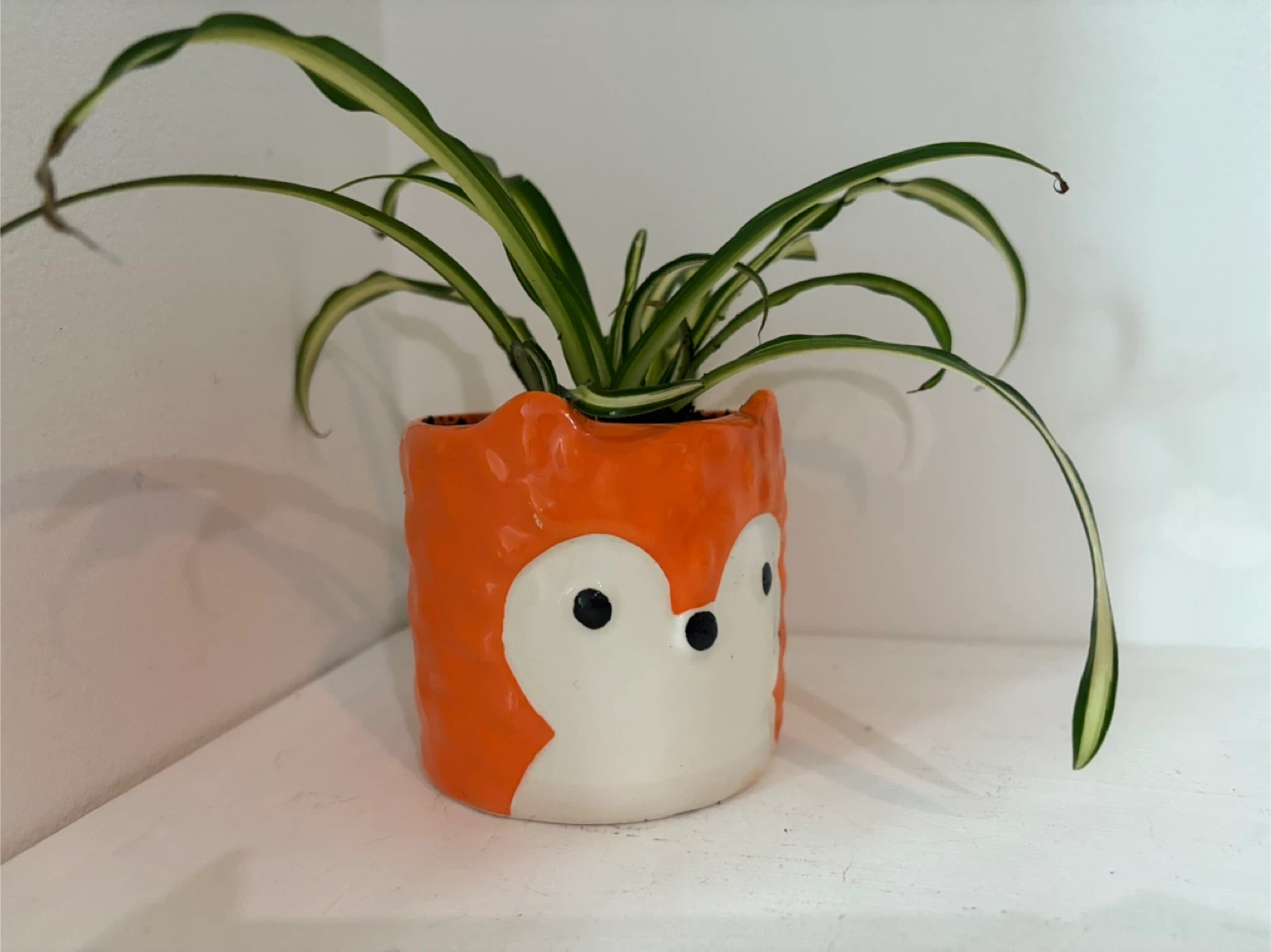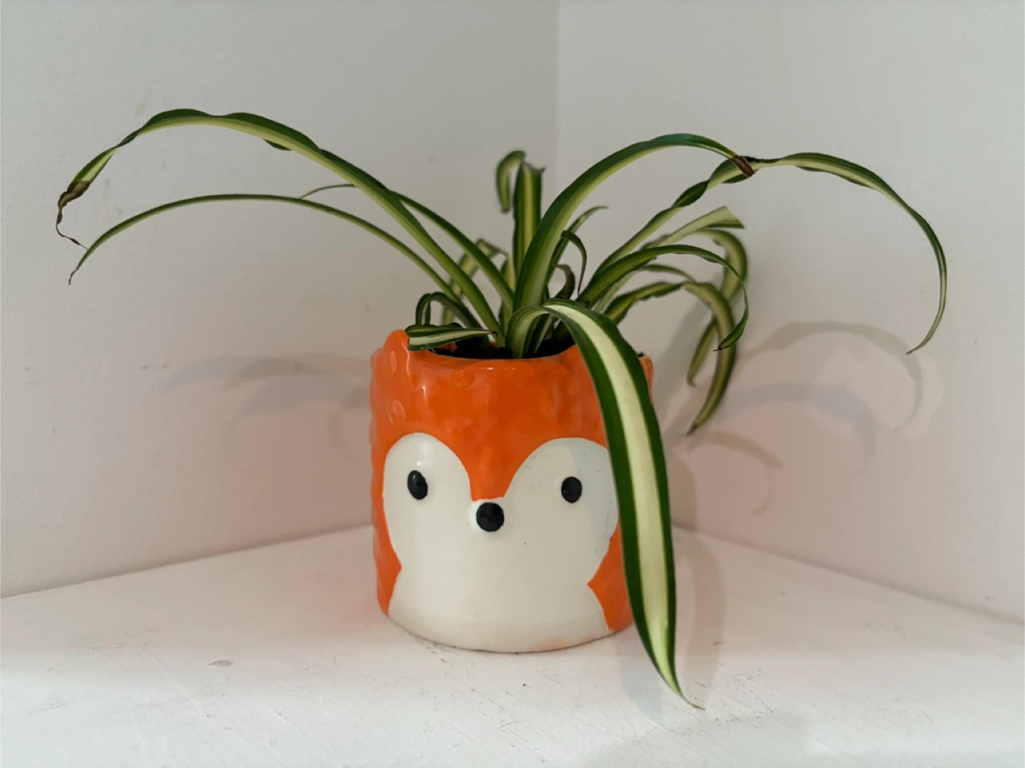 🦊This is a spider plant in a cute fox-themed planter. It's a lovely addition to any home decor! This plant thrives in bright, indirect light.