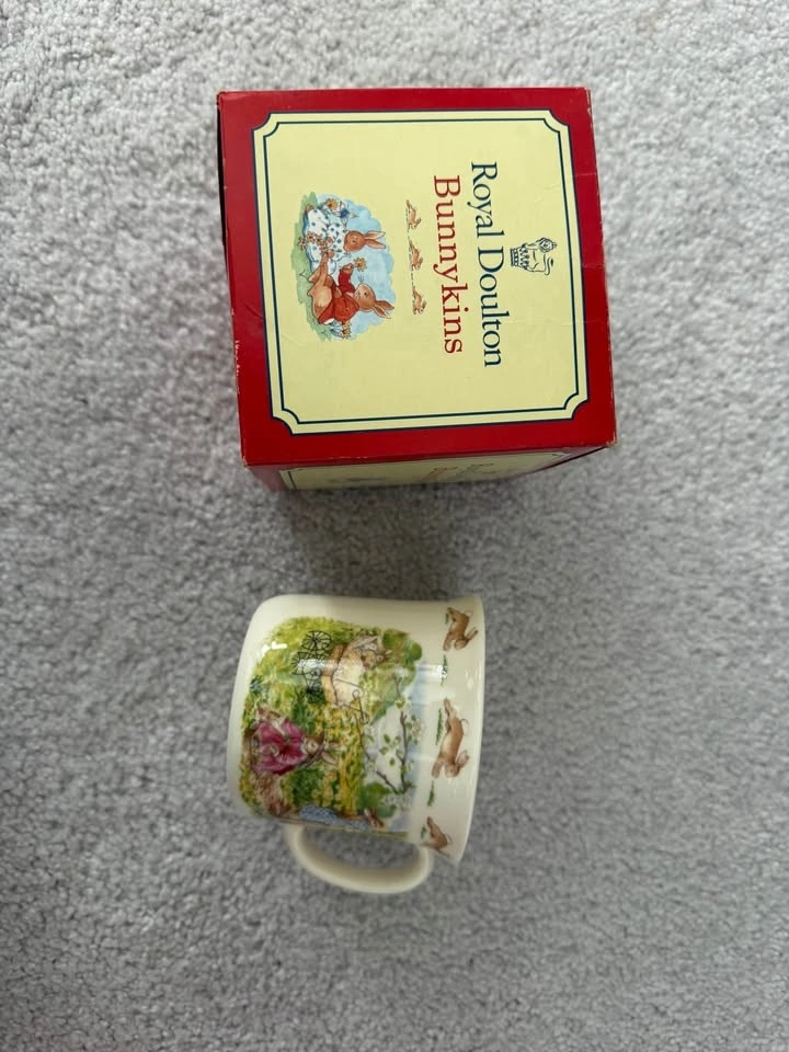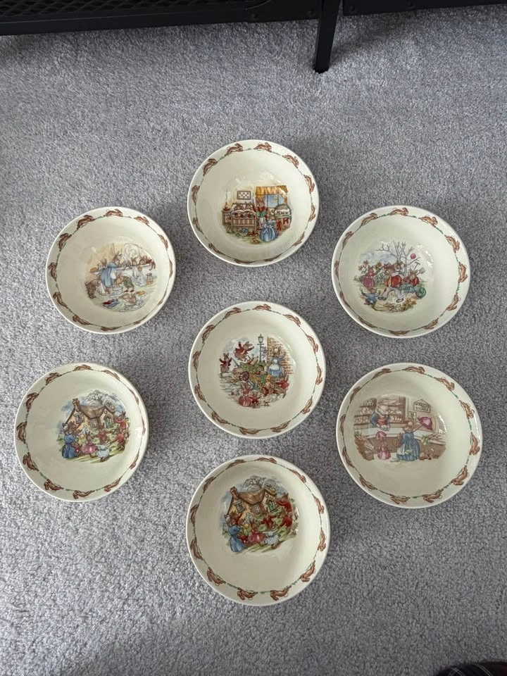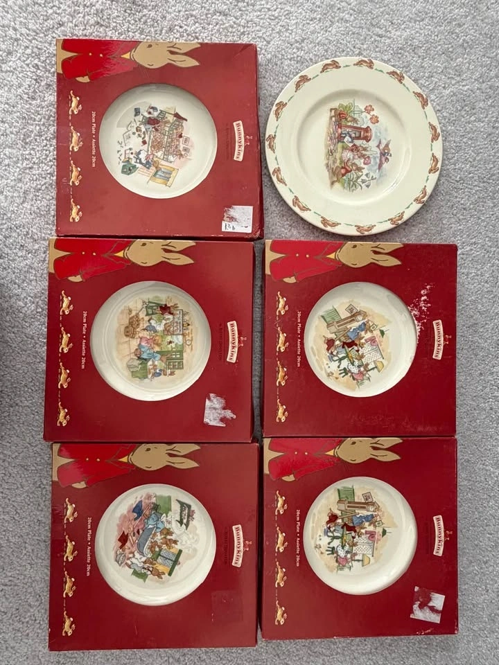Beautiful Royal Doulton Bunnykins collection featuring classic vintage illustrations. Includes 15 pieces total: 7 Bunnykins bowls, 6 Bunnykins plates (5 with original boxes), 1 Bunnykins mug (with original box), and 1 Bunnykins two-handle baby cup. Several pieces come with their original boxes, making this a wonderful set for collectors or as baby gifts. Bunnykins is one of the most beloved children’s china lines made by Royal Doulton England. Perfect for collectors, baby shower gifts, nursery décor, or vintage English china lovers. Selling as a complete collection.