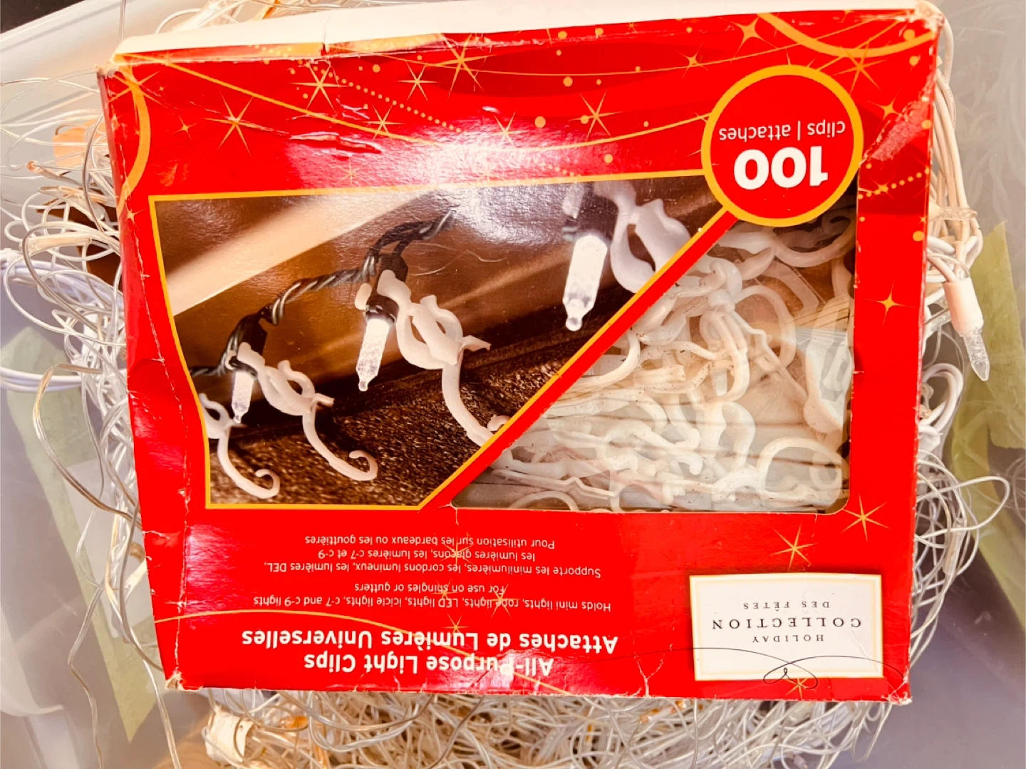 Holiday Collection All-Purpose Light Clips come in a pack of 100. They're designed to hold mini lights, icicle lights, C7, and C9 lights. These clips are useful for securing your holiday lights to various surfaces.