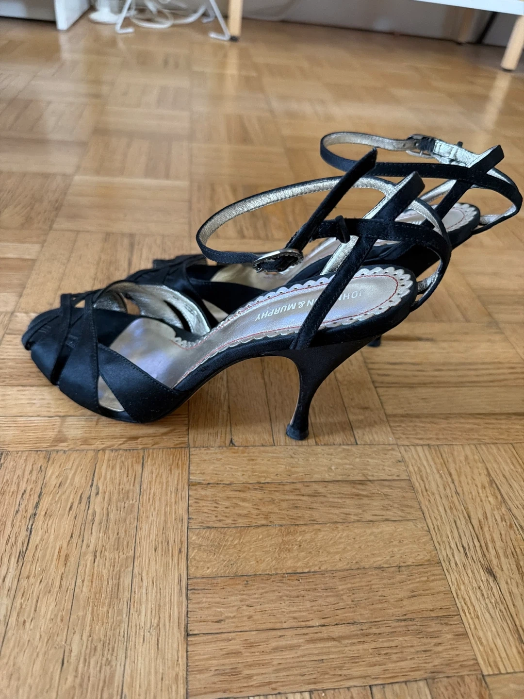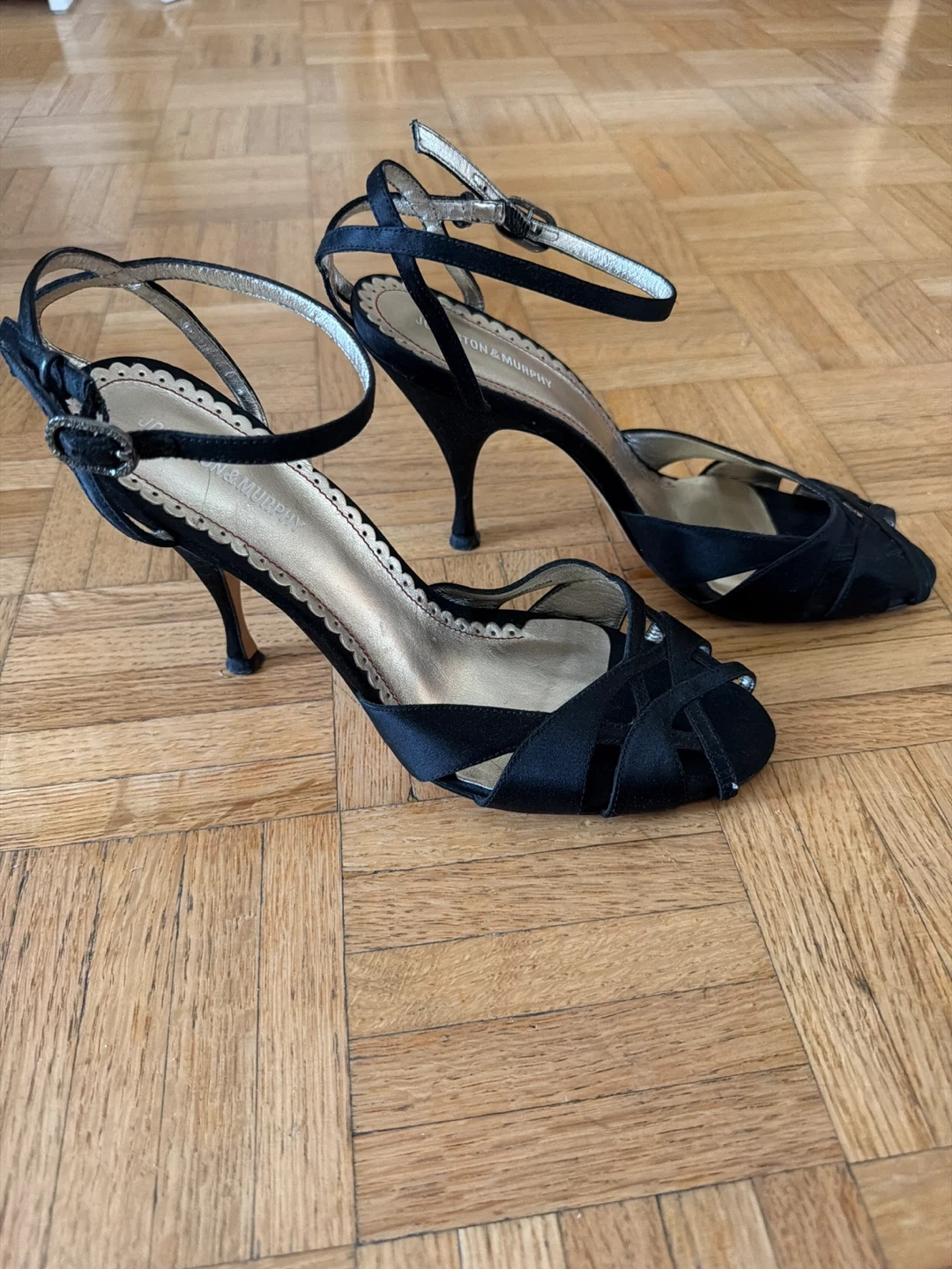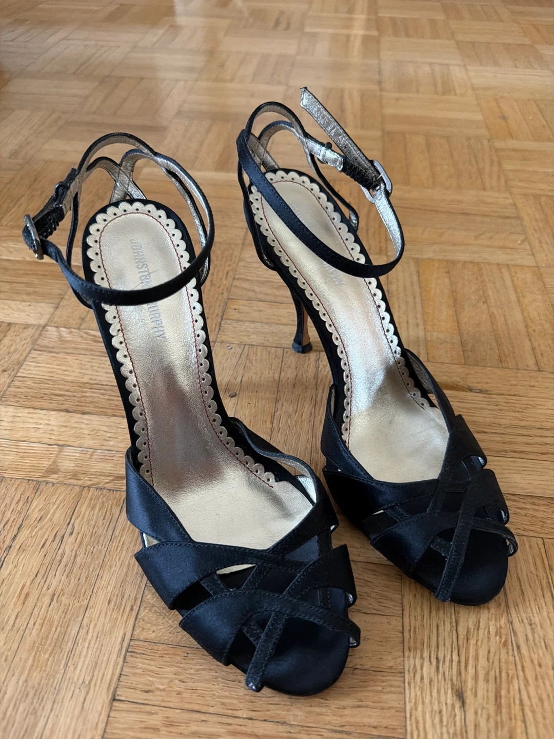 Elegant black satin heels from Jonathon & Murphy. These strappy sandals feature a delicate ankle strap with a buckle closure and a classic stiletto heel. Perfect for dressing up any outfit for a special occasion!