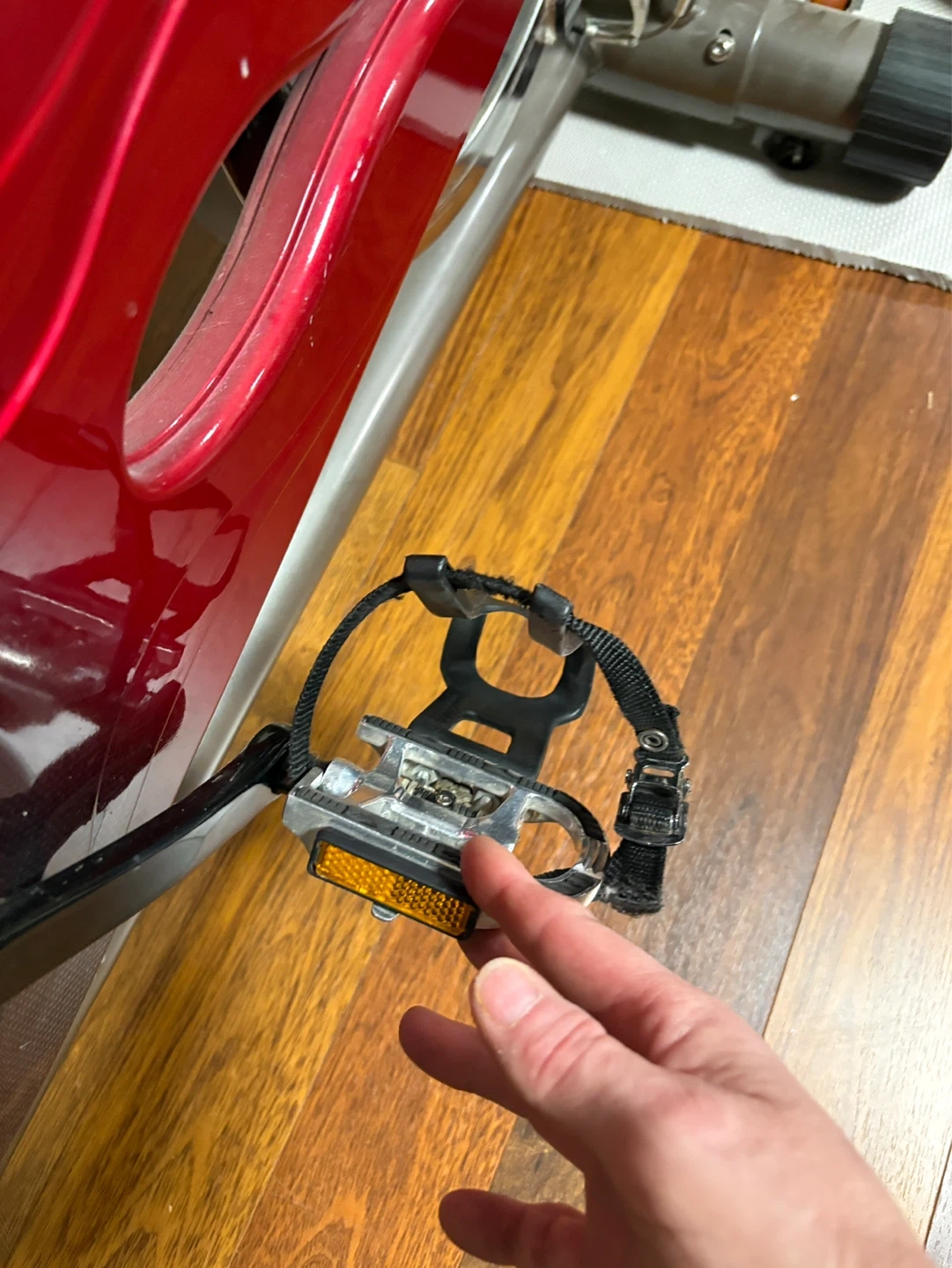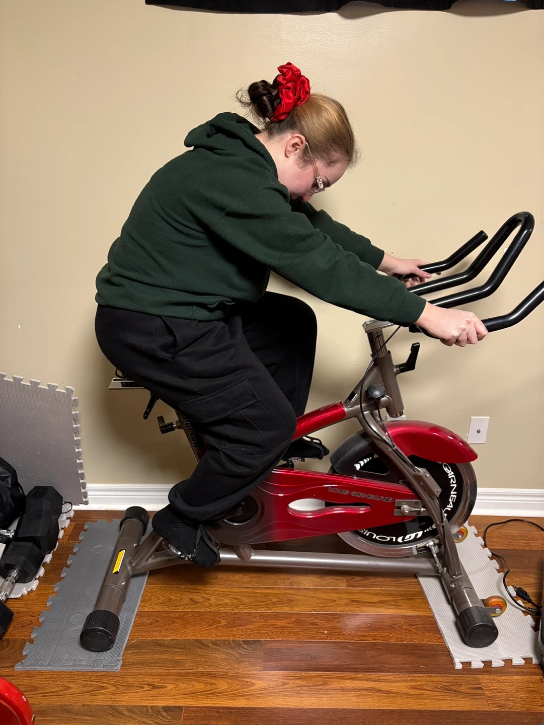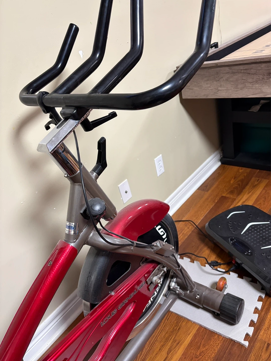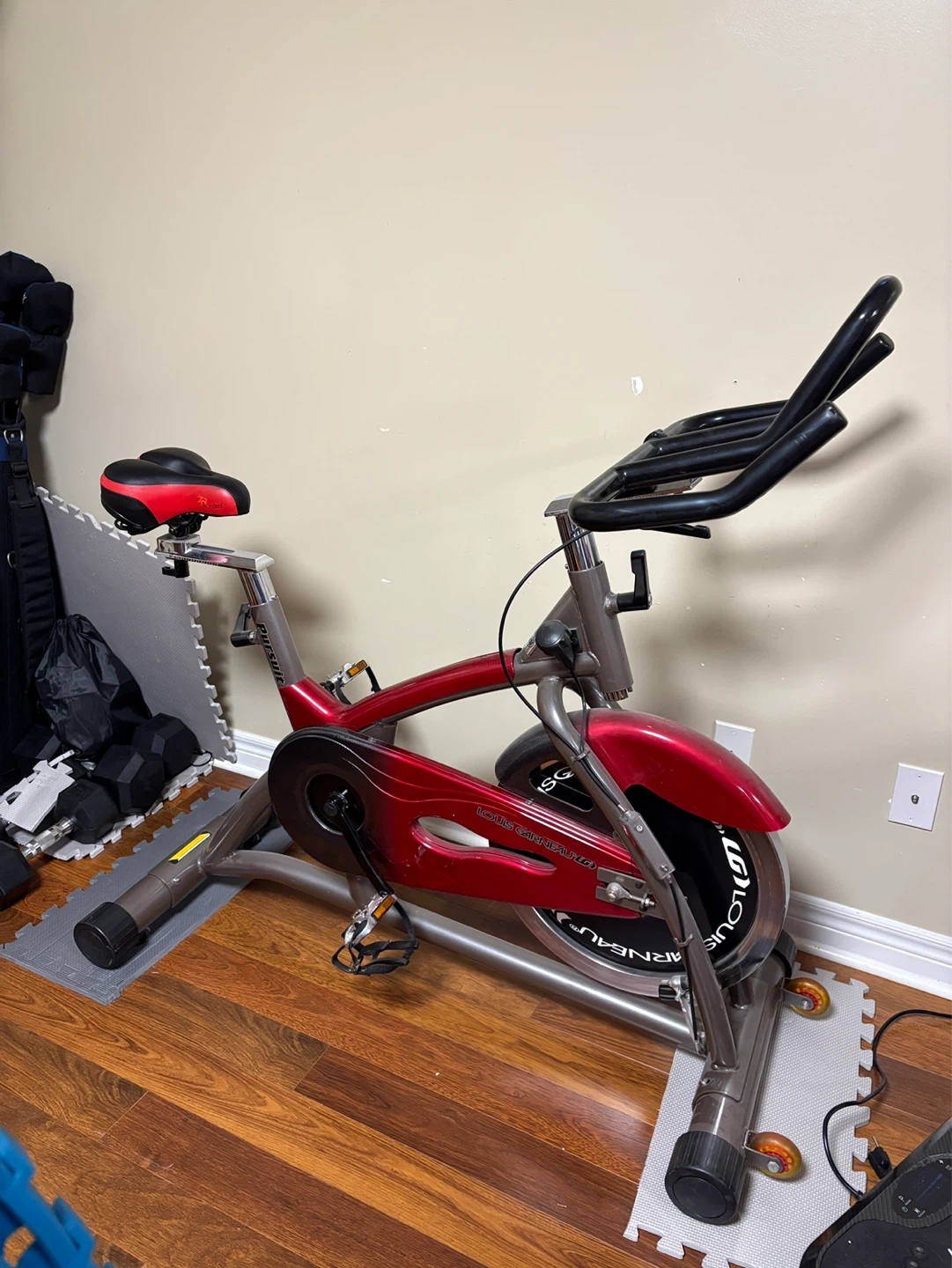 This is a Louis Garneau CS-2 indoor cycle. It has a red and silver frame with a black and red seat. Pedals include toe straps and reflectors. Suitable for home workouts! An excellent condition.