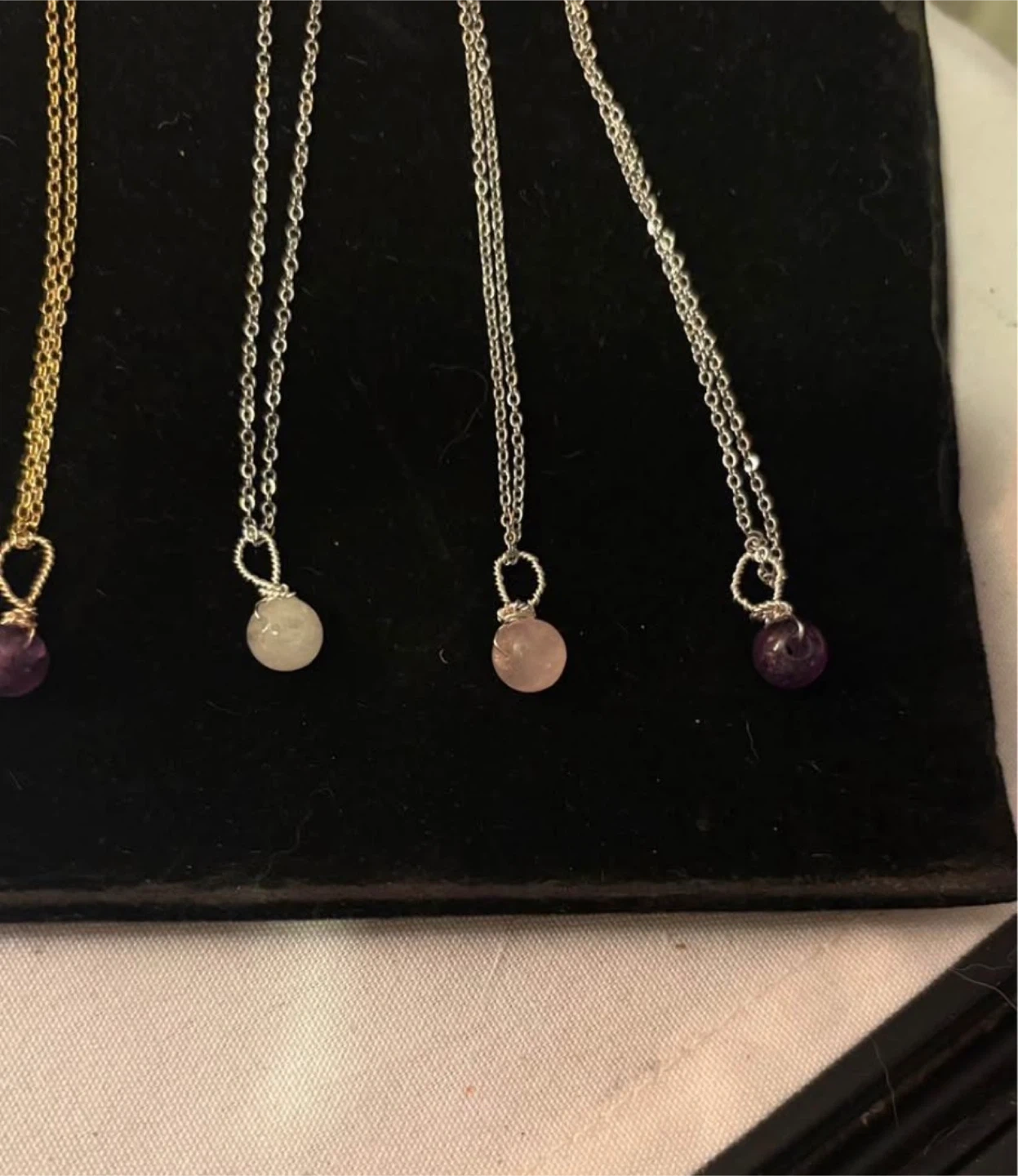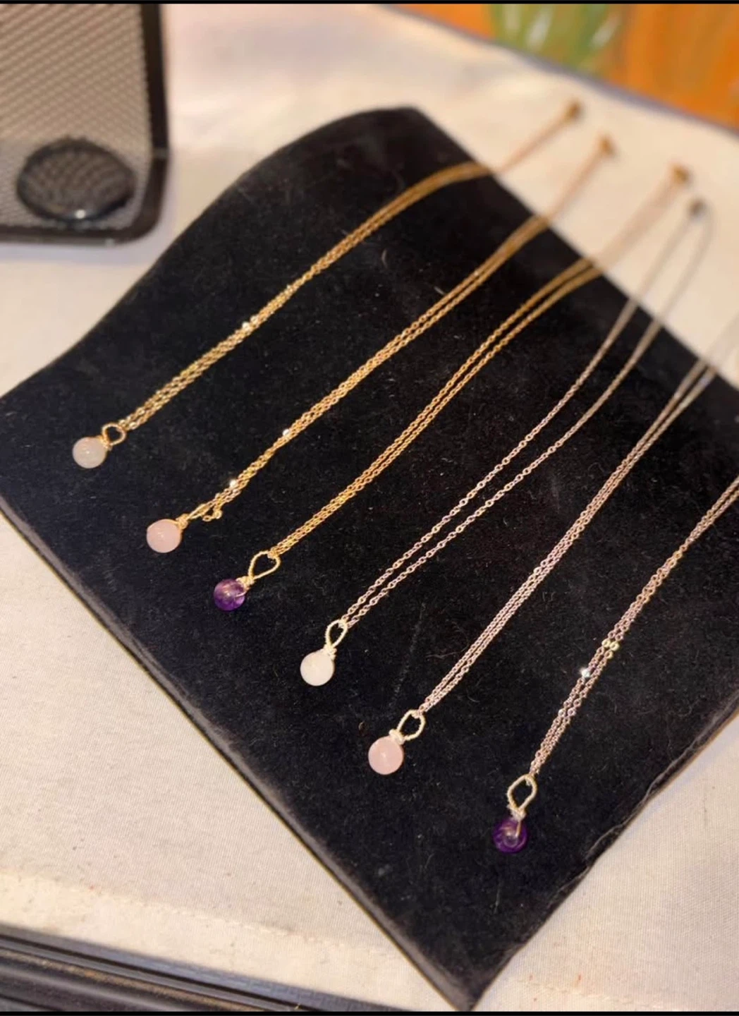 dainty necklaces, gold-toned and silver-toned, each featuring a unique crystal charm like amethyst and rose quartz. These necklaces are perfect for adding a subtle touch of natural beauty to any outfit.