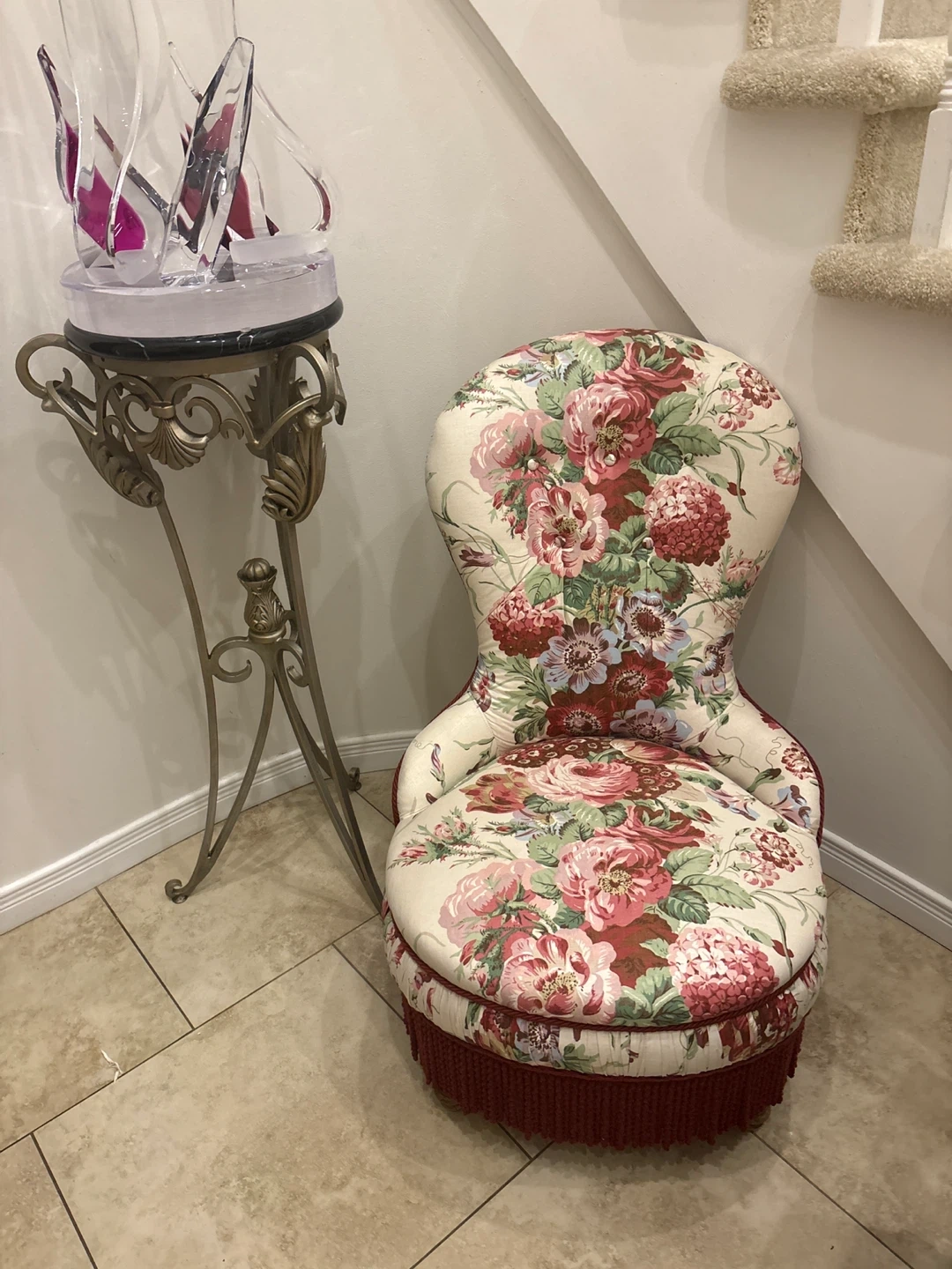 This charming accent chair features a beautiful vintage floral fabric. It has a rounded back and seat with a decorative red tassel skirt along the bottom. It's a lovely piece for adding a touch of old-fashioned style to any room.