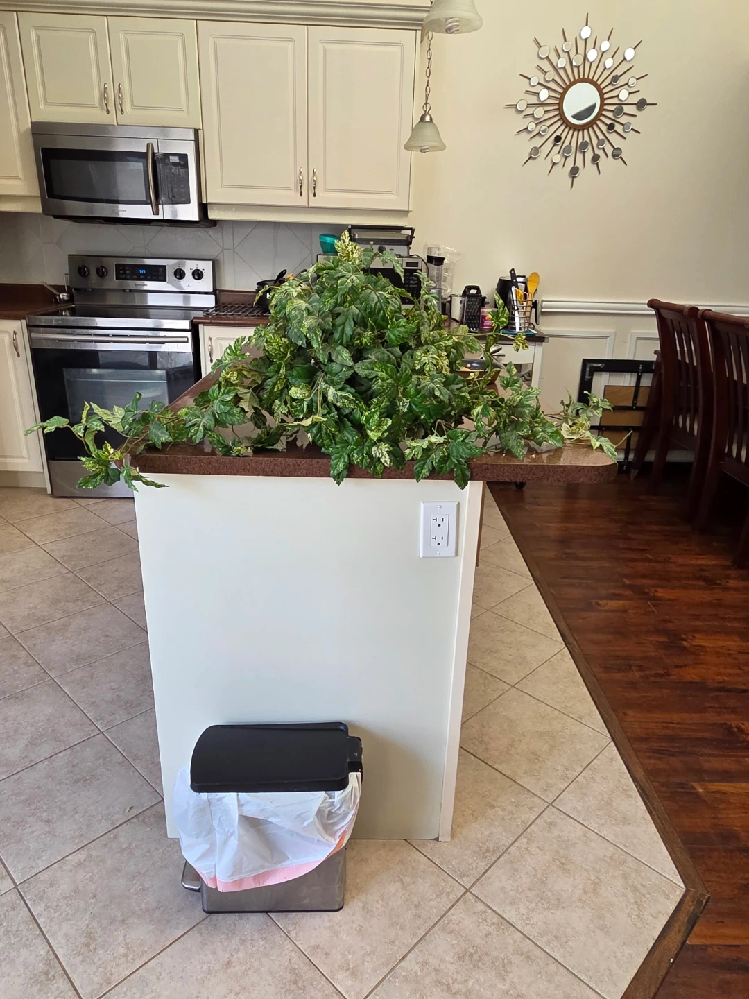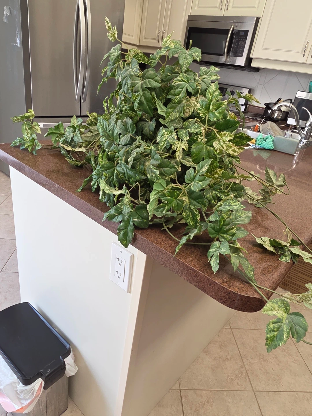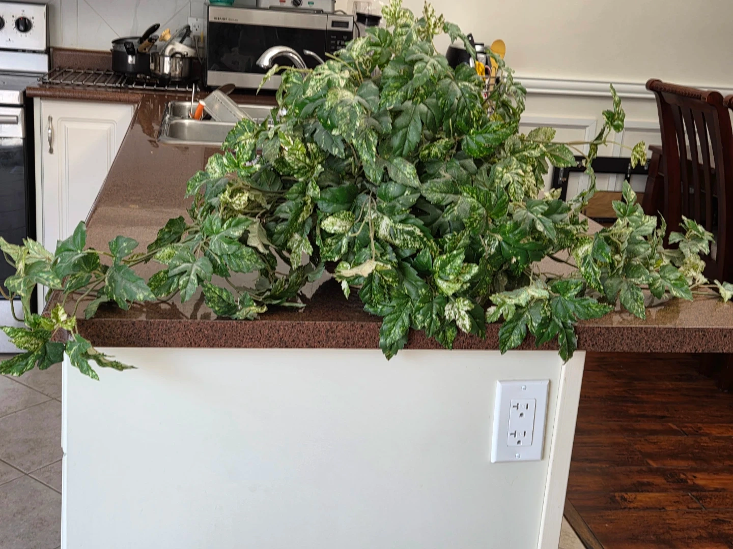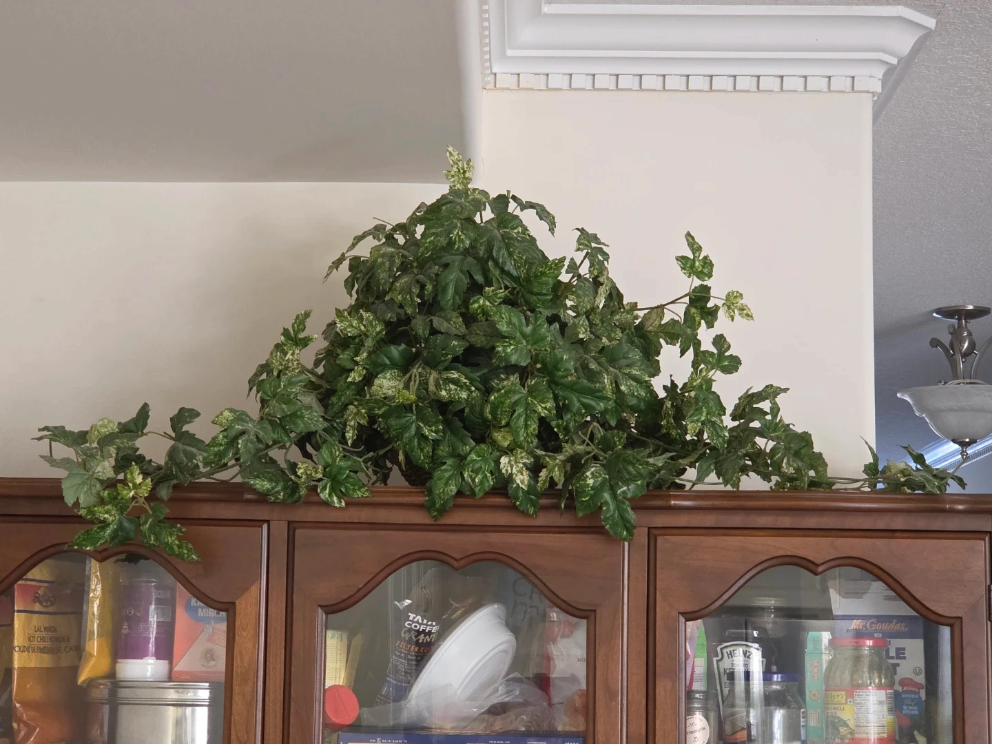 A lush artificial pothos plant with variegated green and white leaves. It's a generous size, perfect for draping over cabinets or shelves. Adds a touch of green to any room without the upkeep!