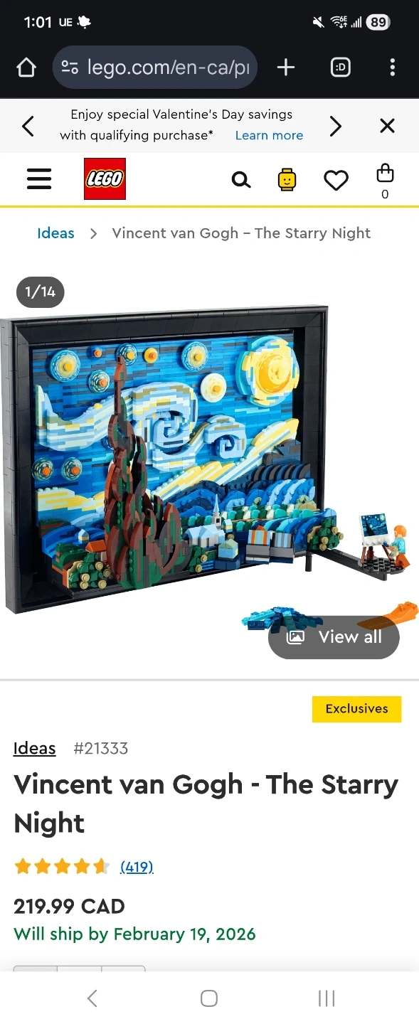 -This LEGO Ideas set recreates Vincent van Gogh's famous painting, "The Starry Night." It's a display piece with 2316 pieces. The set includes a minifigure of Van Gogh holding a paintbrush and palette.