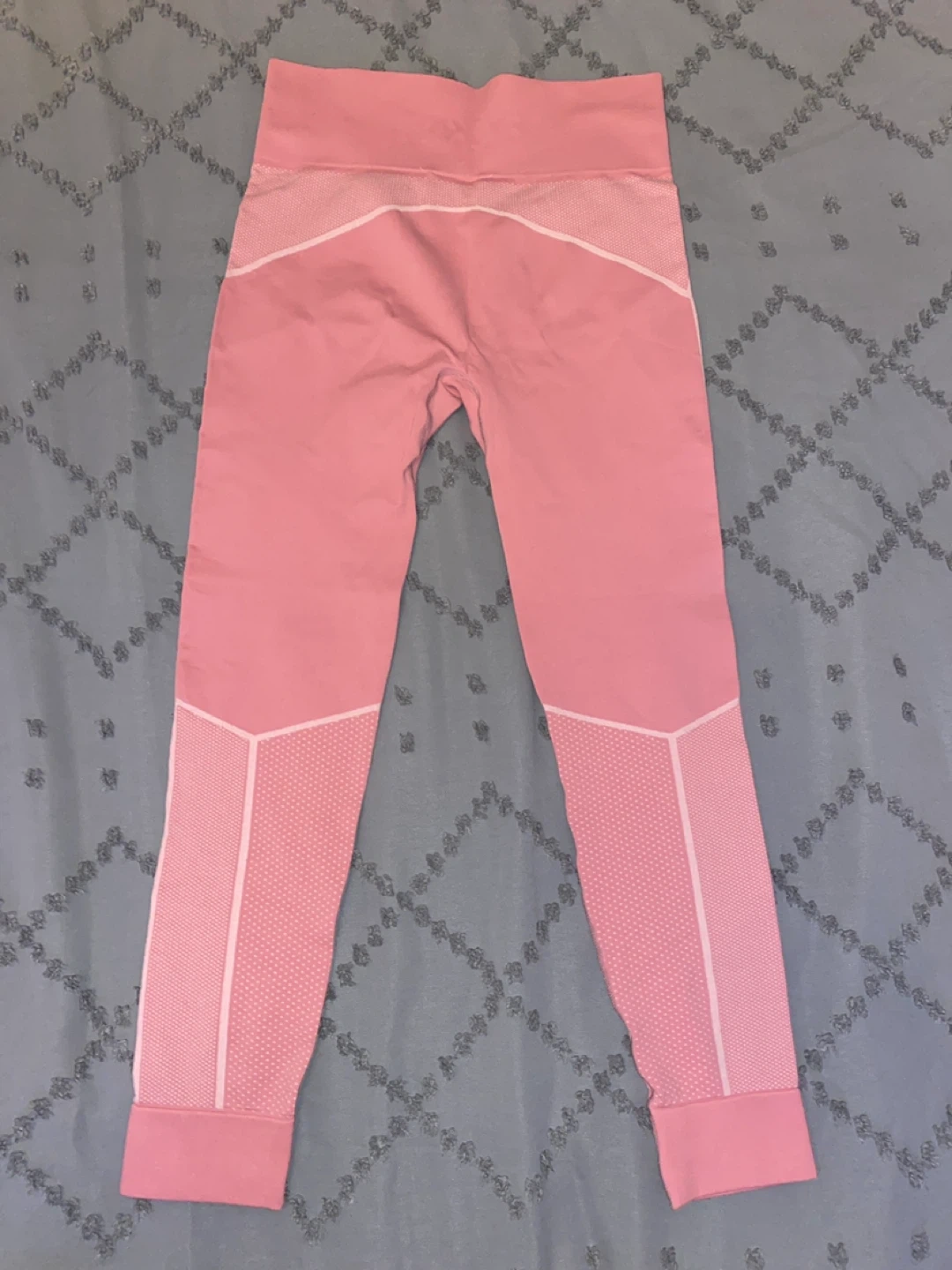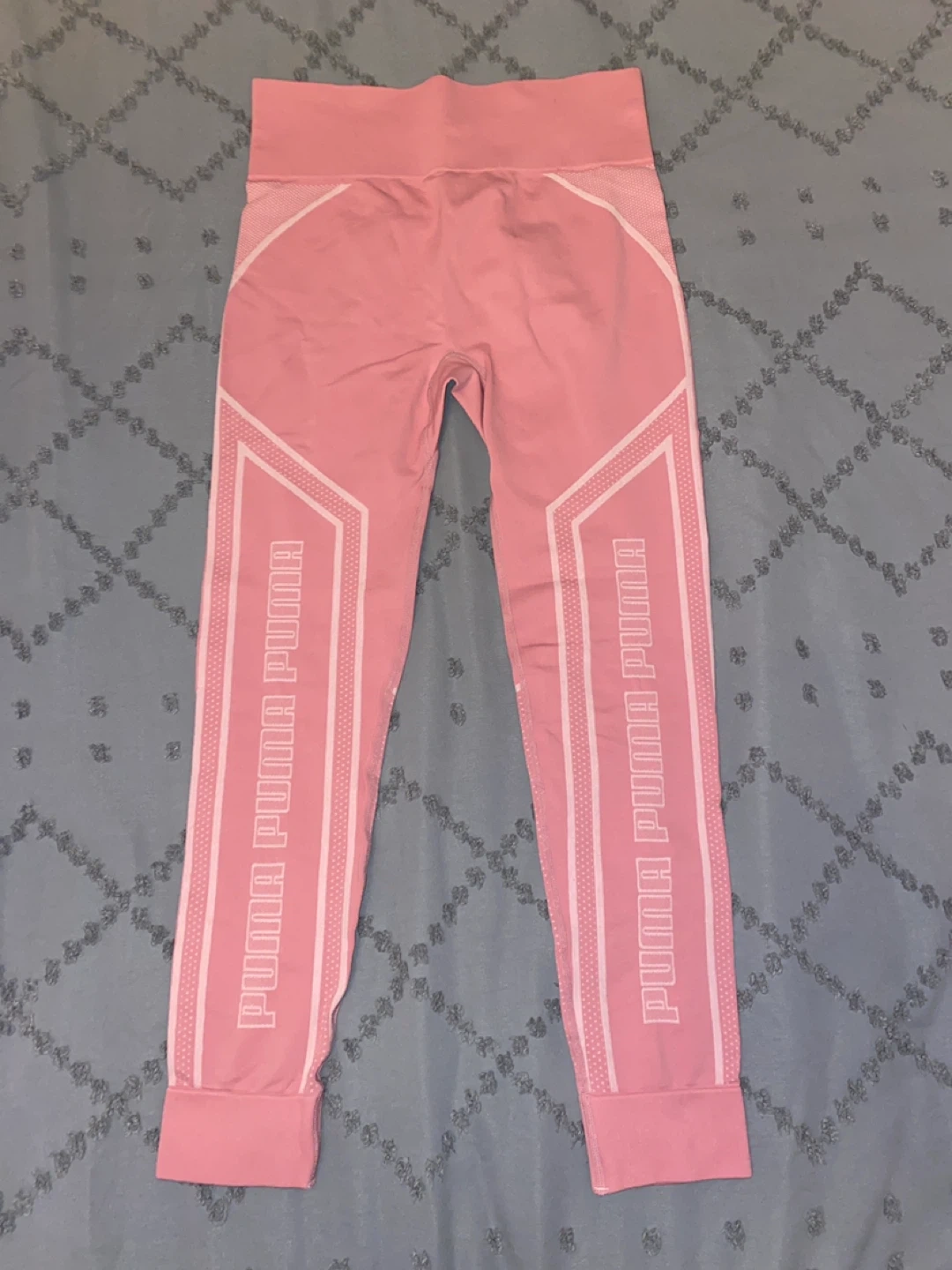 Selling a pair of Puma leggings in a lovely pink colour. They are a size medium and in great condition. The Puma logo is featured on the side of the legs!