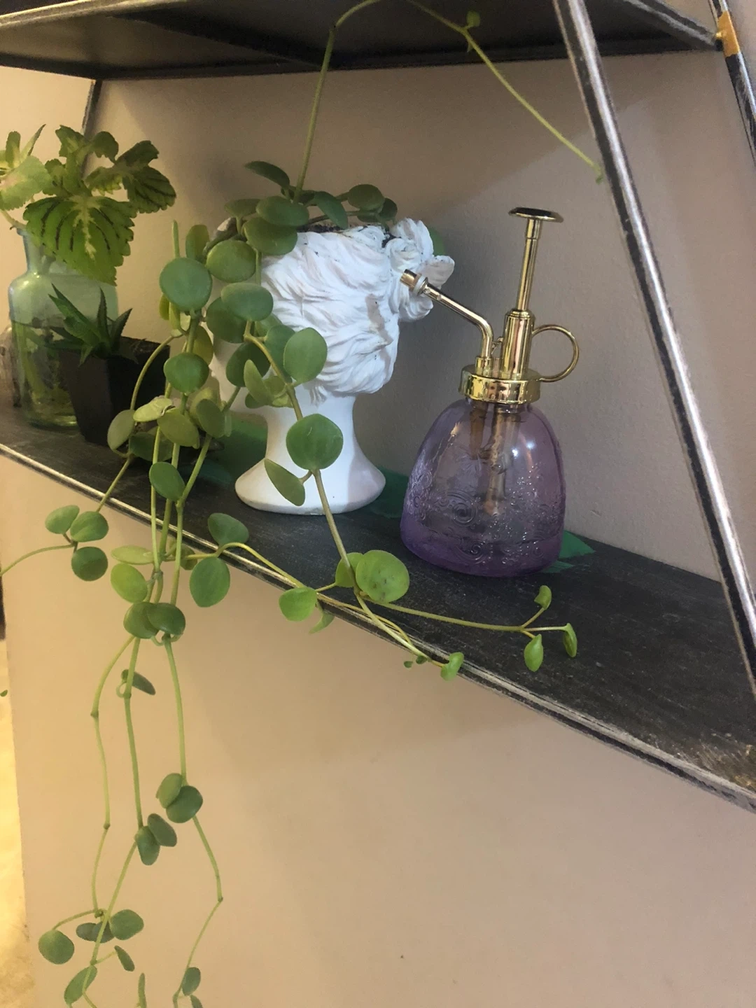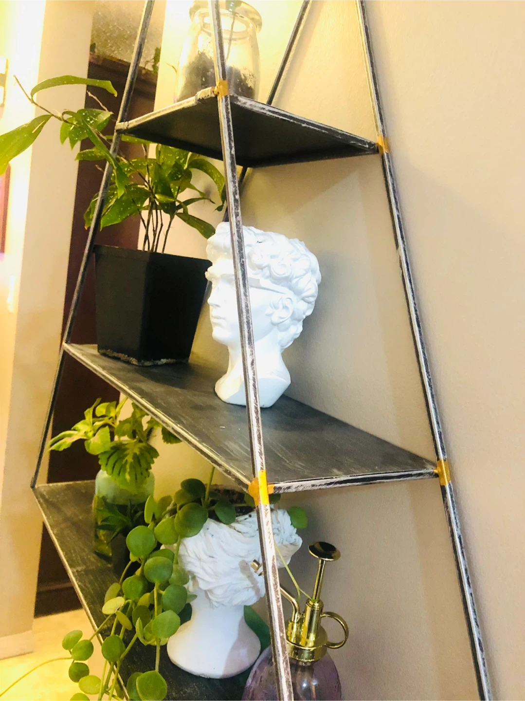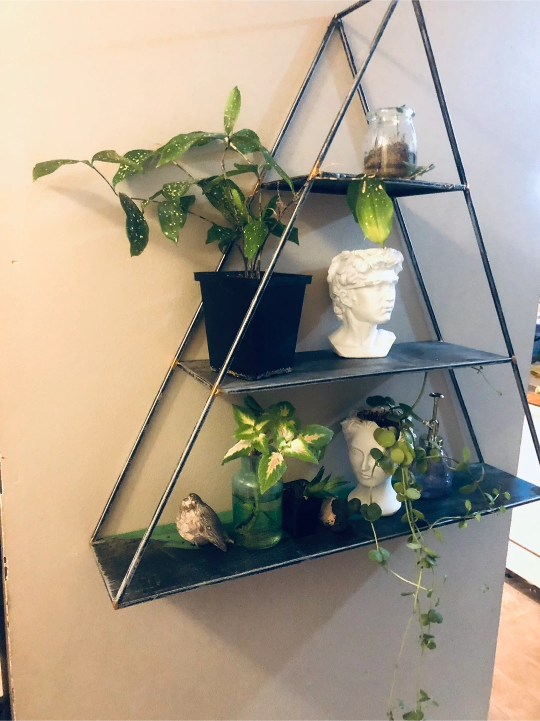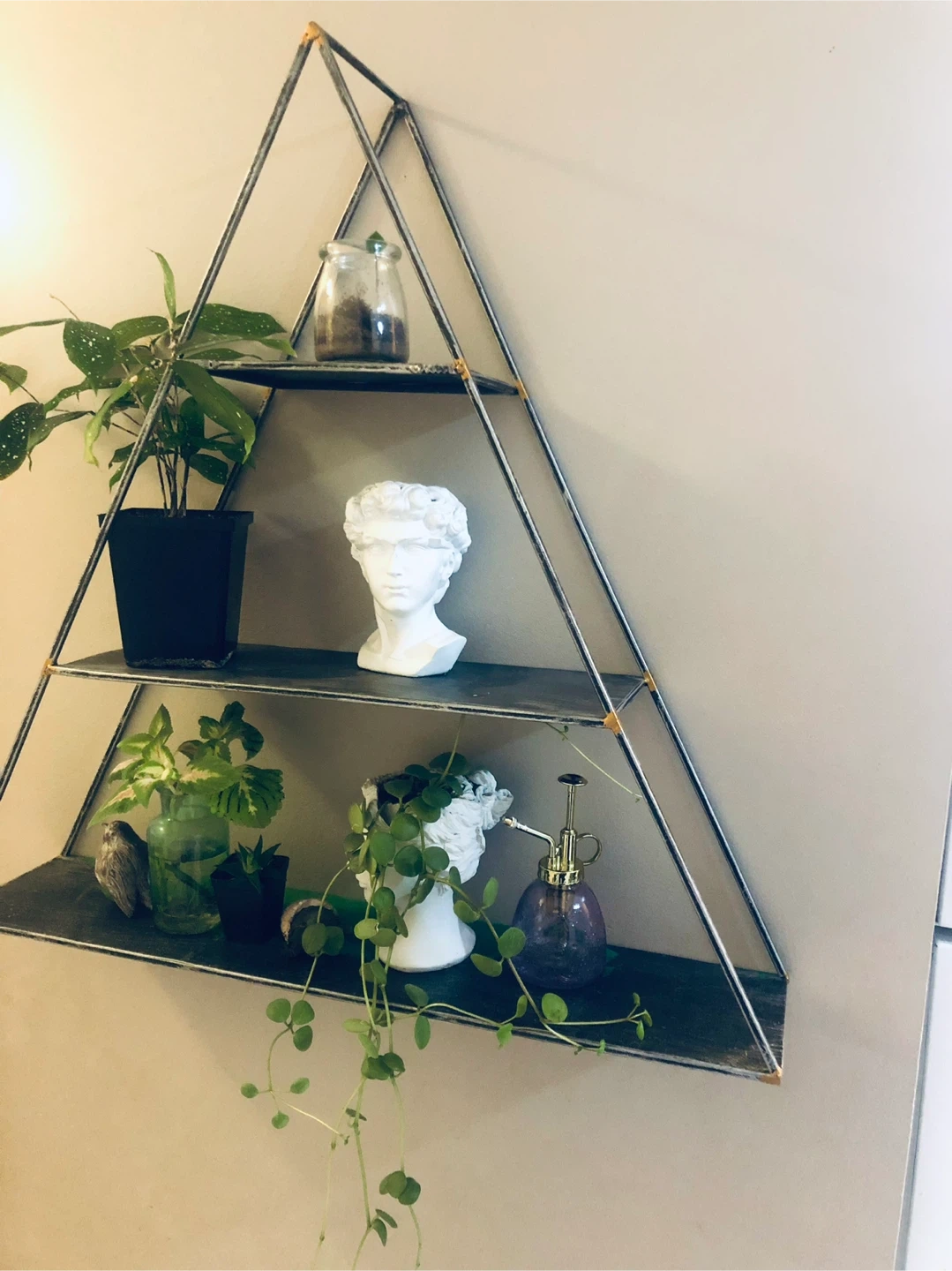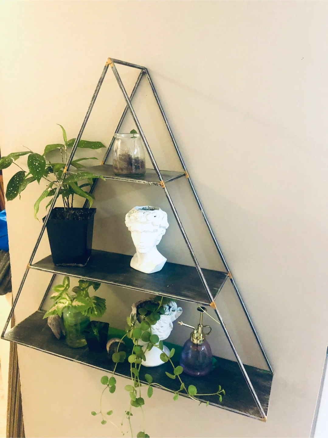 ✨🌿ONLY $12!!!🌟This is a triangular floating wall shelf unit with three tiers. It's constructed from metal with a rustic finish. (Black and silver) Perfect for displaying plants or decor!