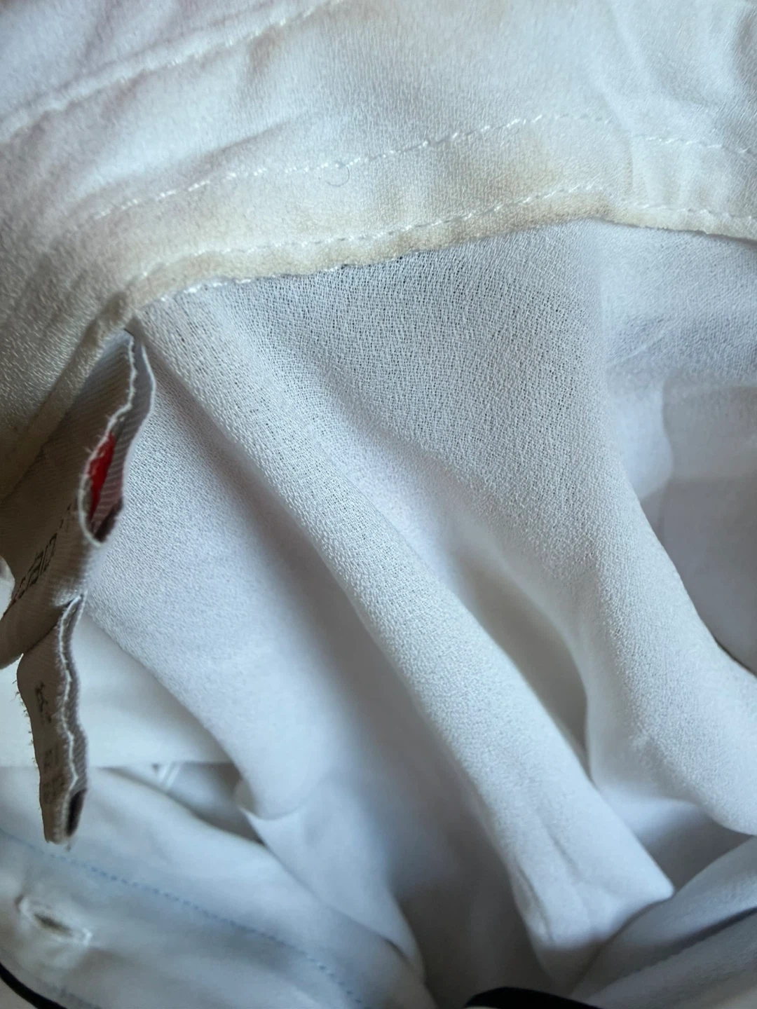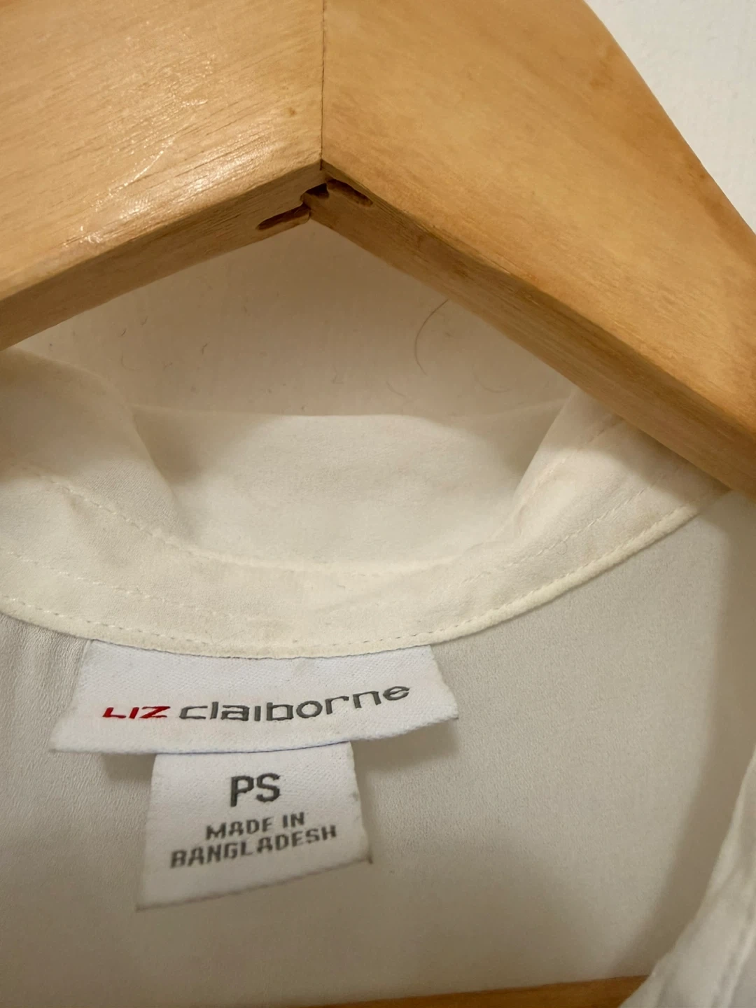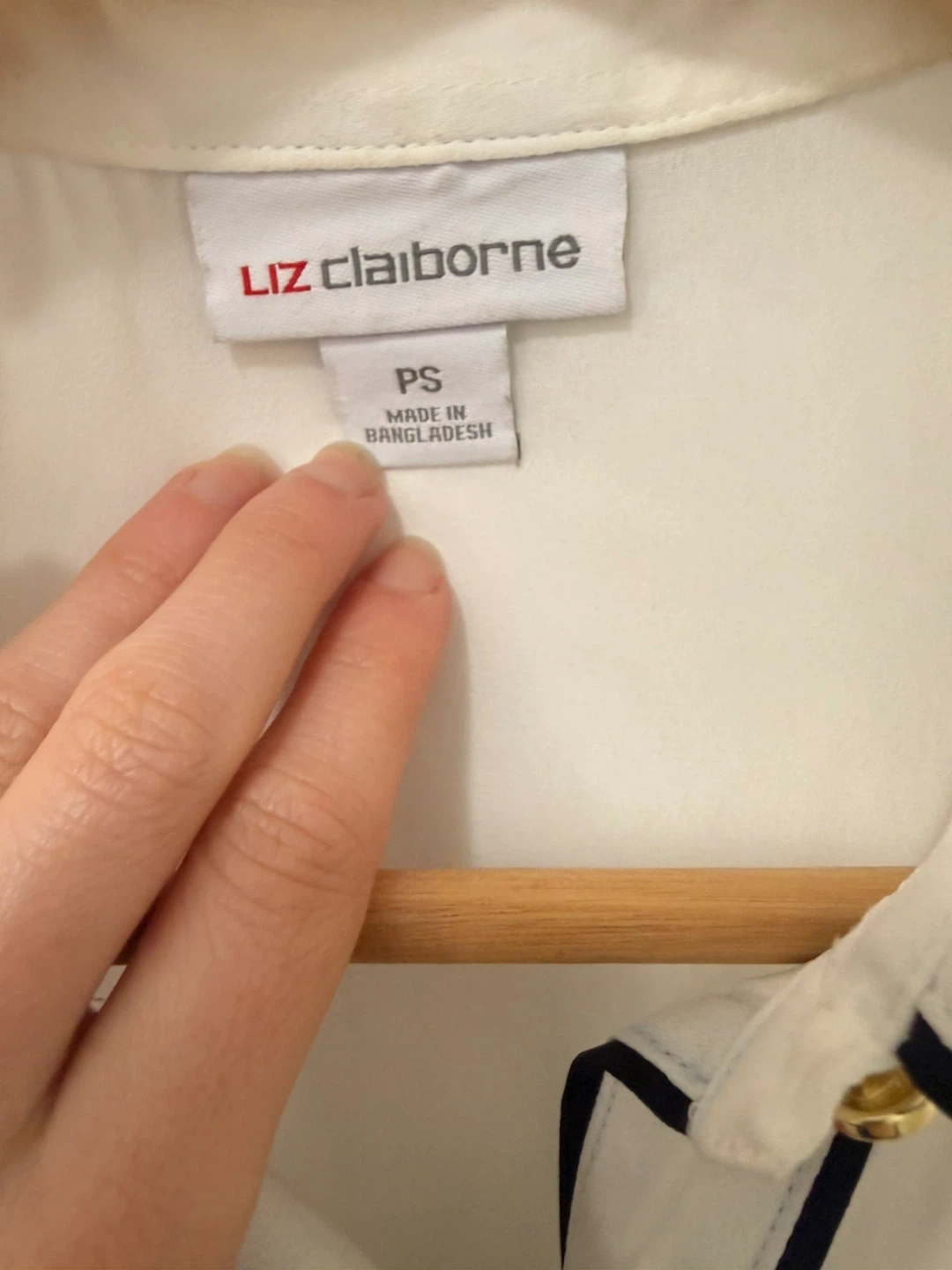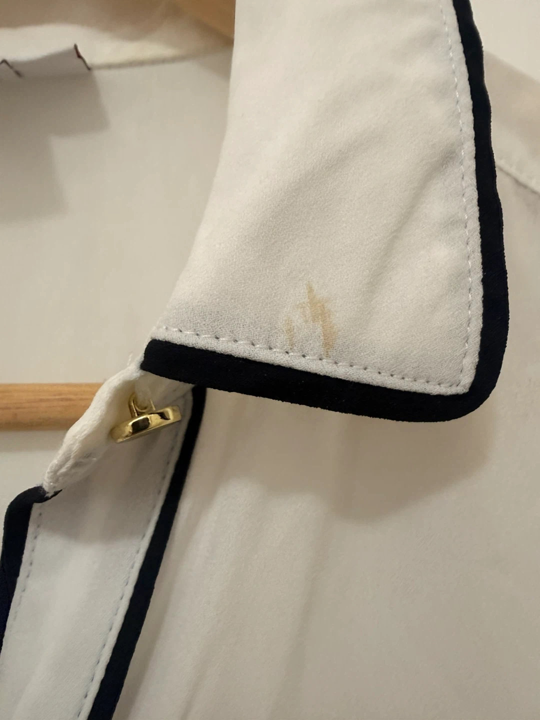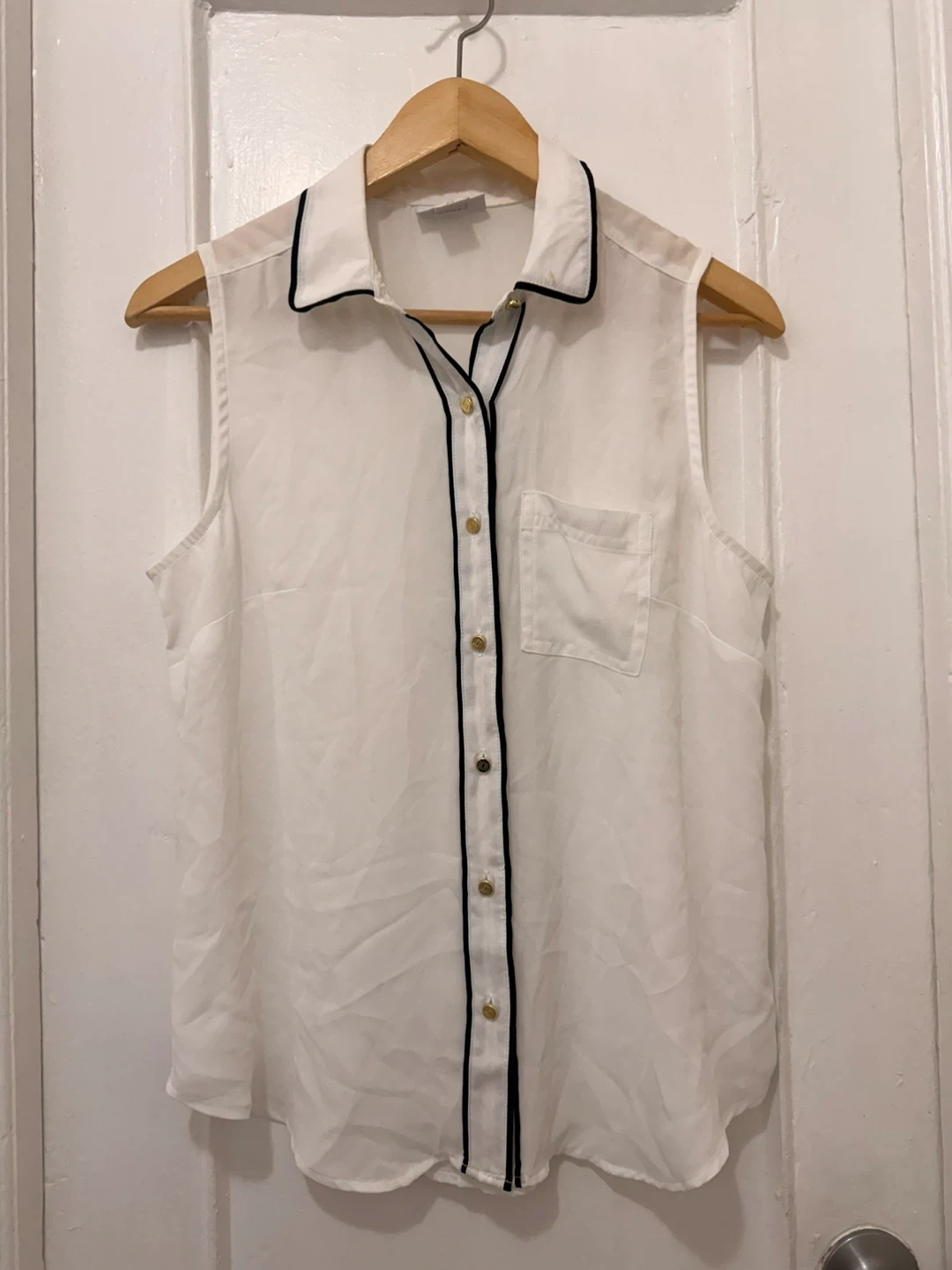 Liz Claiborne white sleeveless sheer blouse. Features black trim and gold-tone buttons. Size PS. Slight stain on collar, see photos. Be aware that the clothe won’t be washed, is not dirty but is used, check photos please.