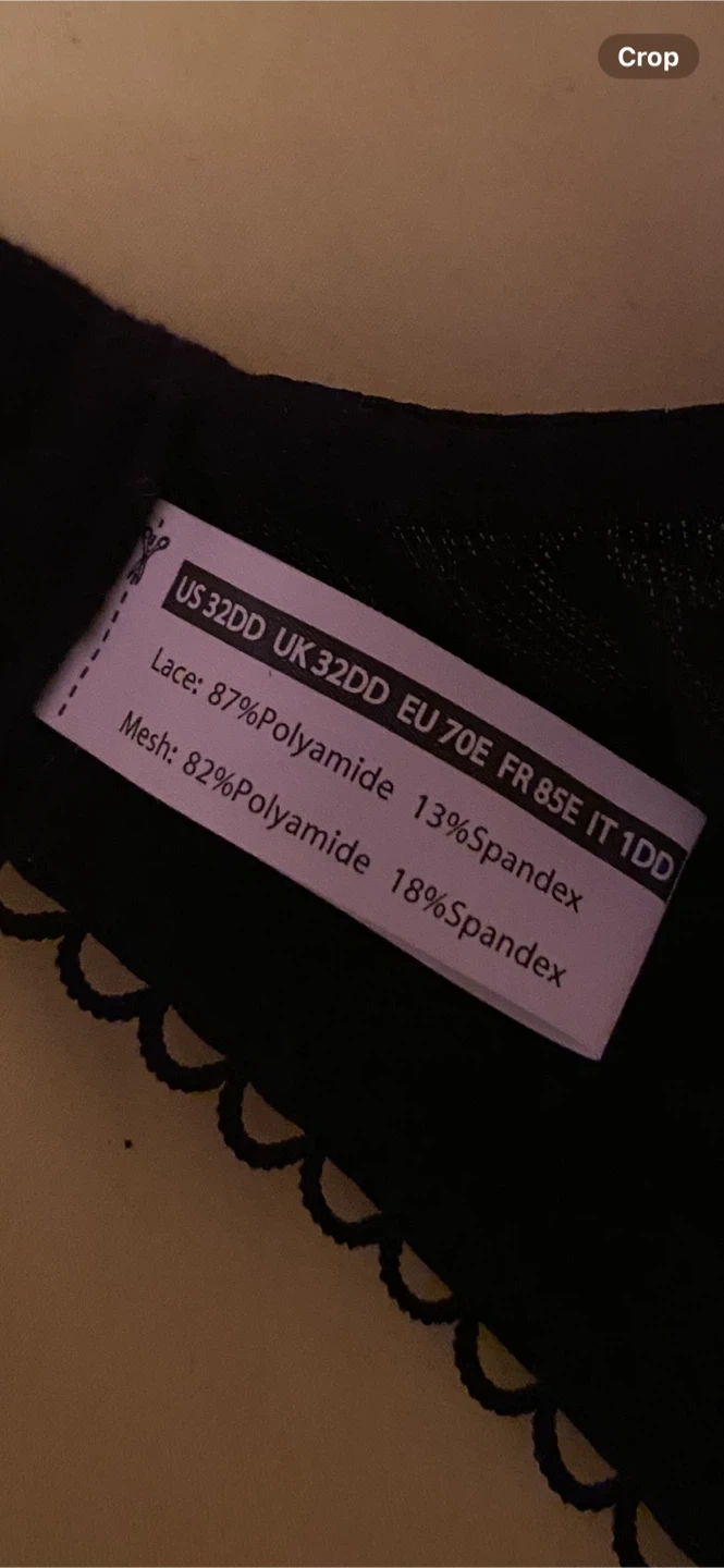 This black lace bra is a size 32DD. It's made with 87% polyamide and 13% spandex for the lace, and 82% polyamide with 18% spandex for the mesh. The delicate lace trim adds a touch of elegance.