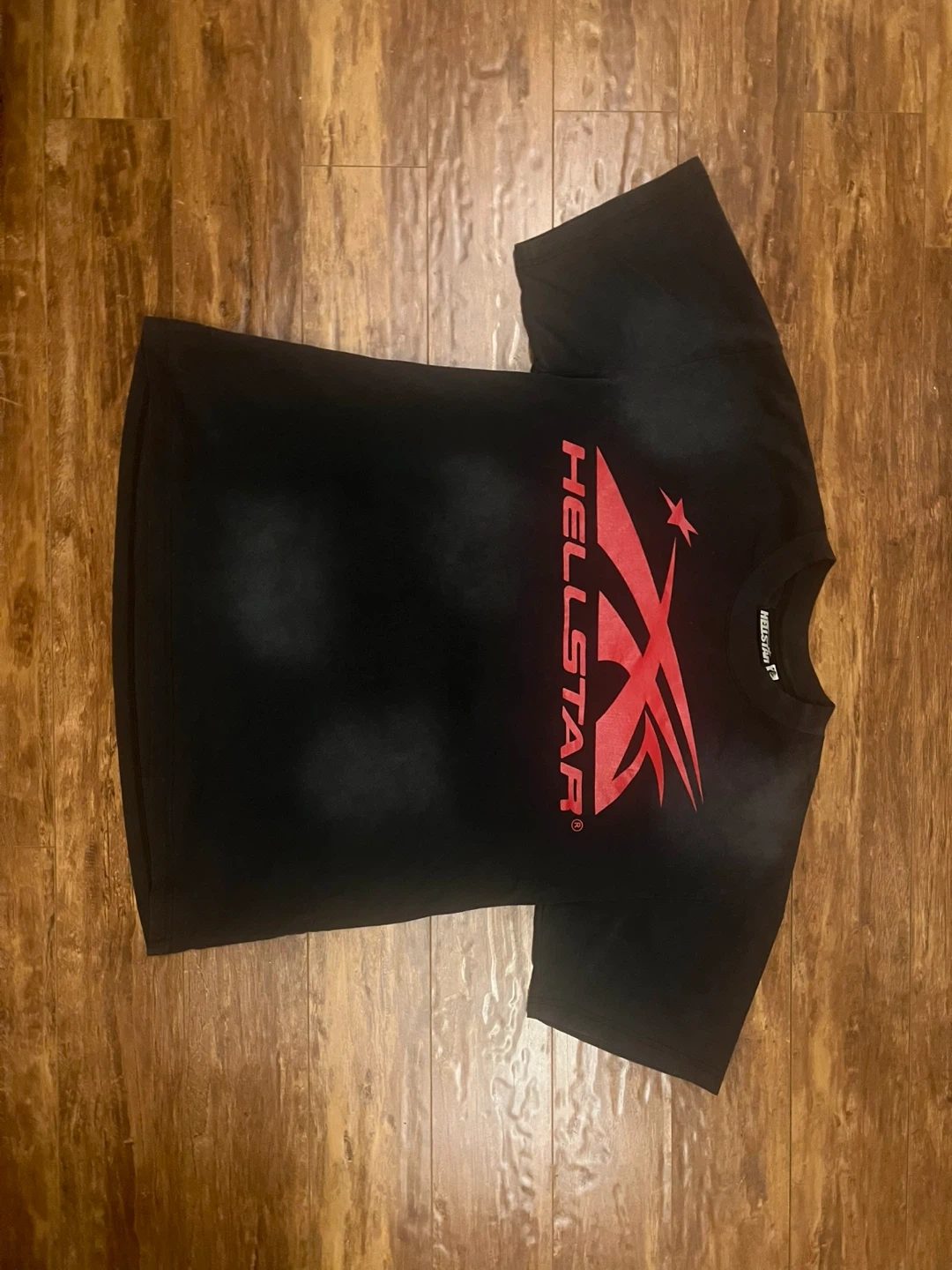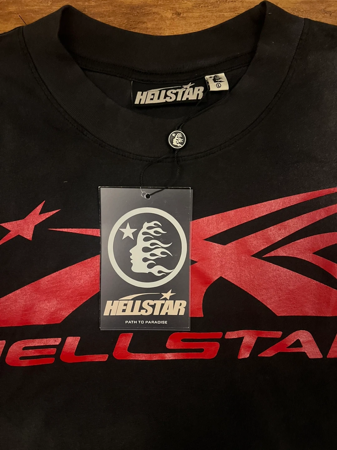 Black Hellstar t-shirt with a large red graphic logo on the front and back. Includes original tag attached. Made from comfortable fabric.