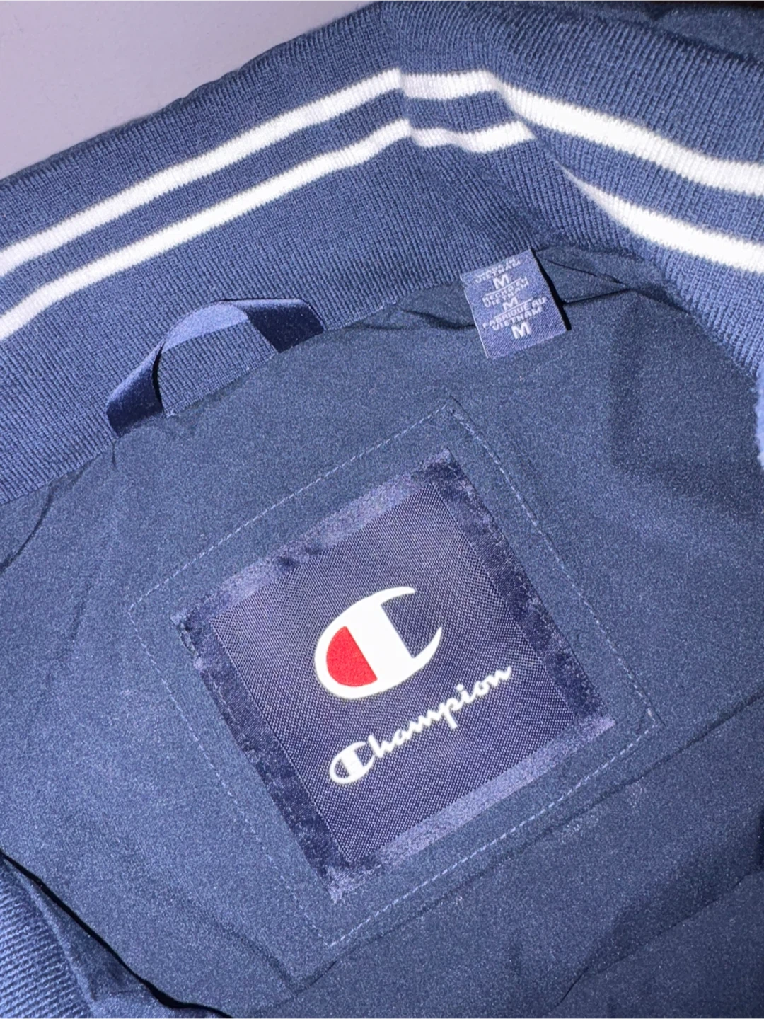 Champion puffer jacket in navy blue. It's a size medium. Features a full zip front and pockets.