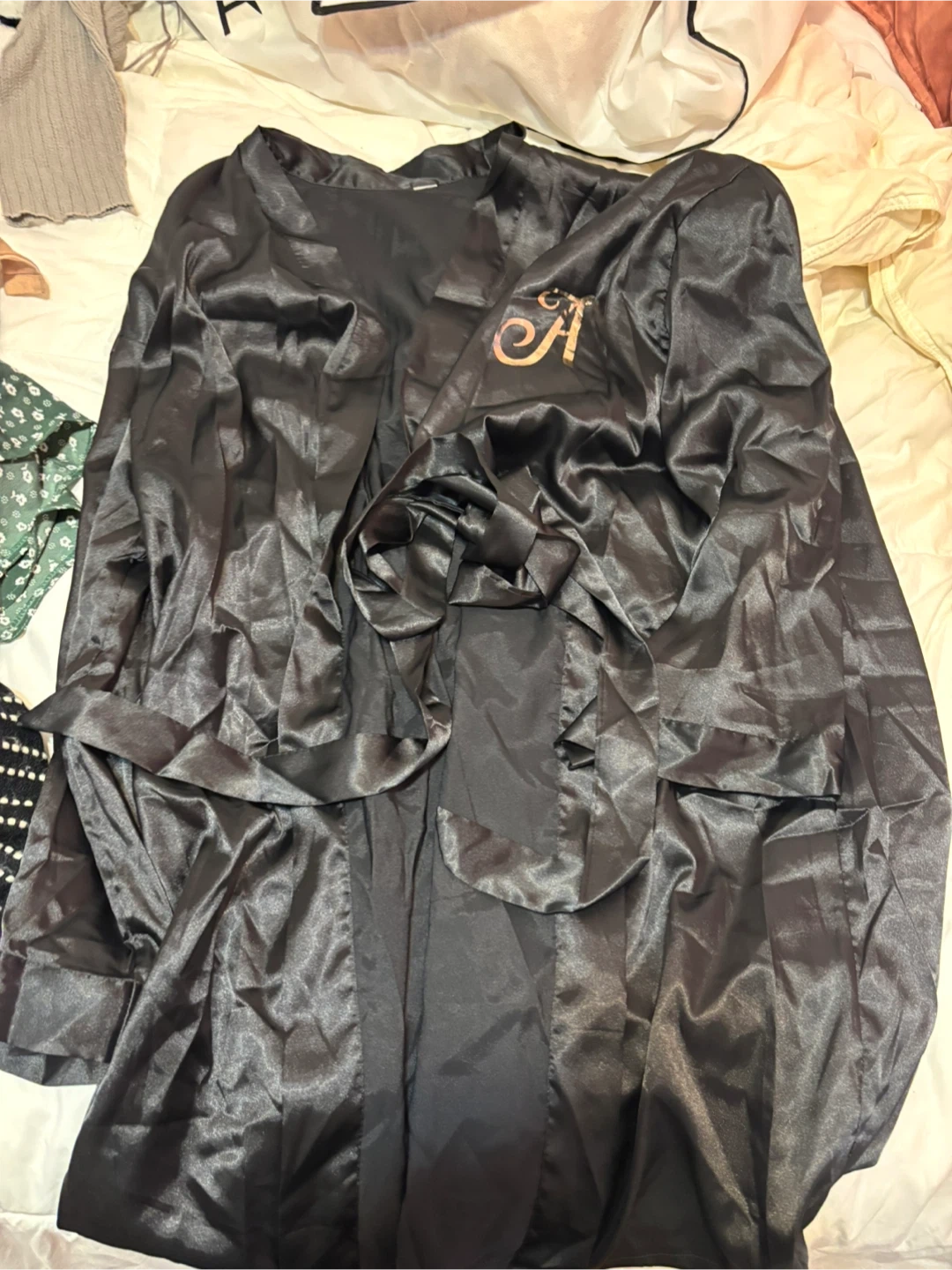 Black Satin Robe with Monogram 'A'