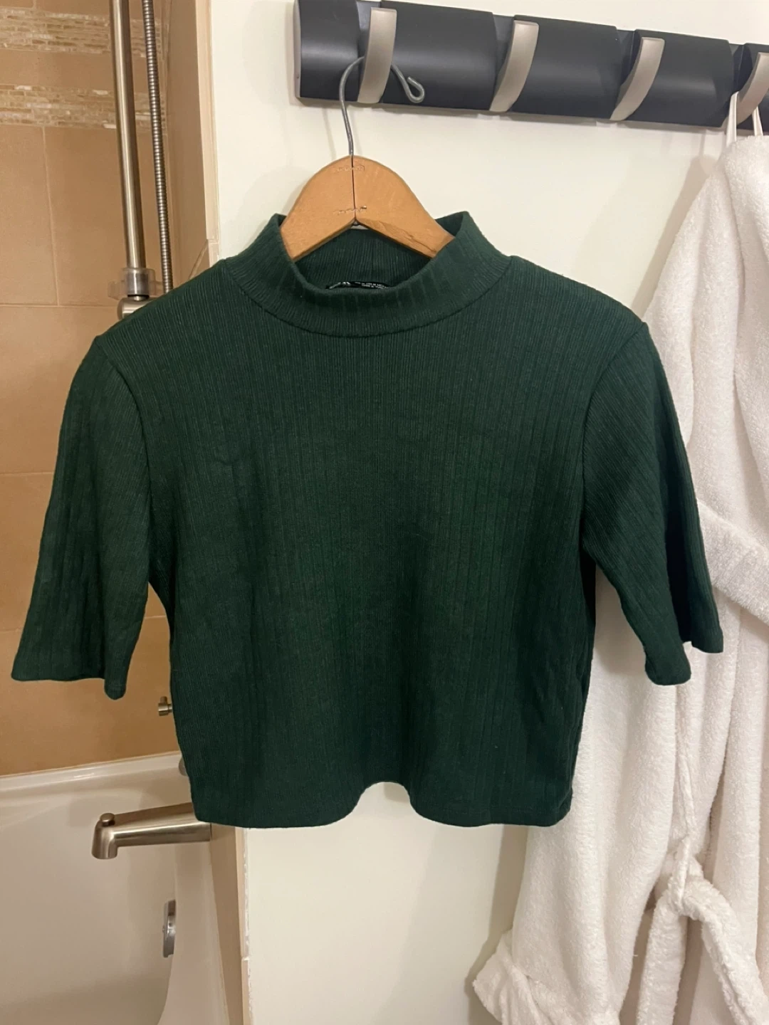 Dark green ribbed mock neck top from Zara. Cropped with short sleeves. Size medium. Good for layering or wearing on its own! Too short for me (I font like to show my belly button!).