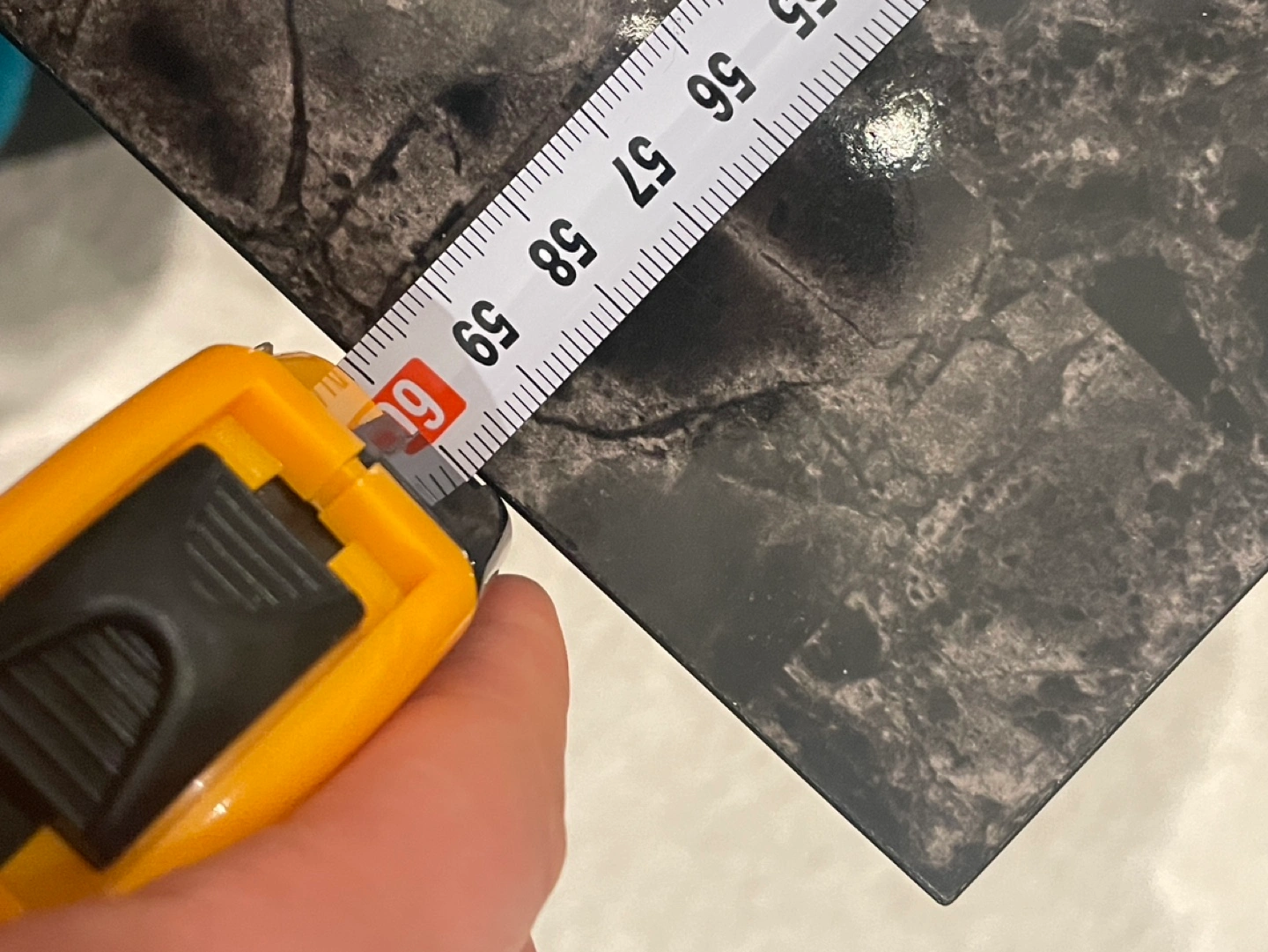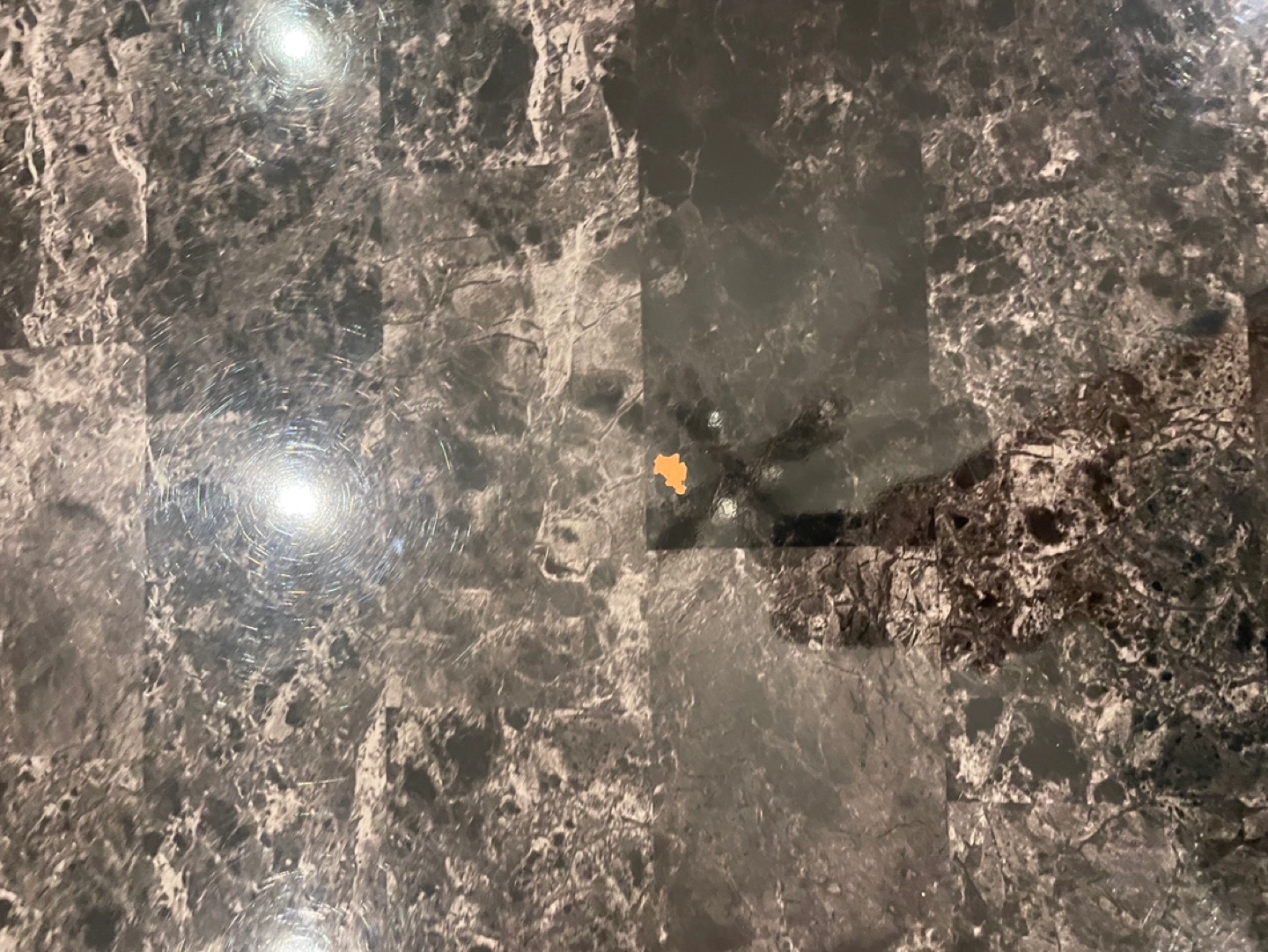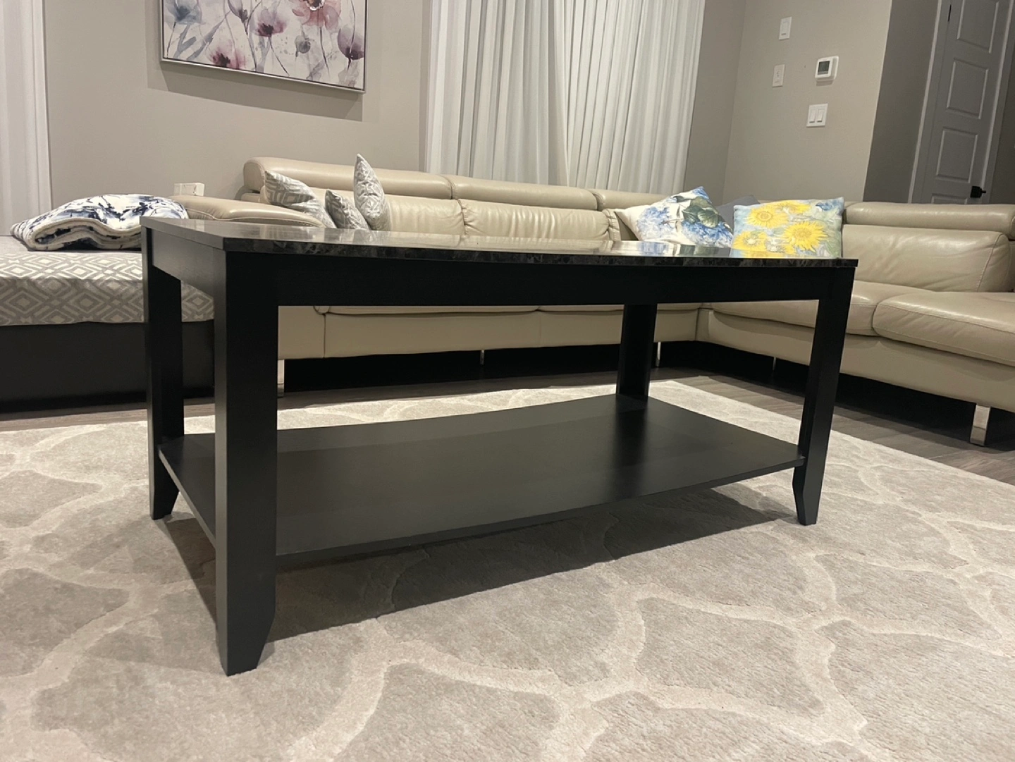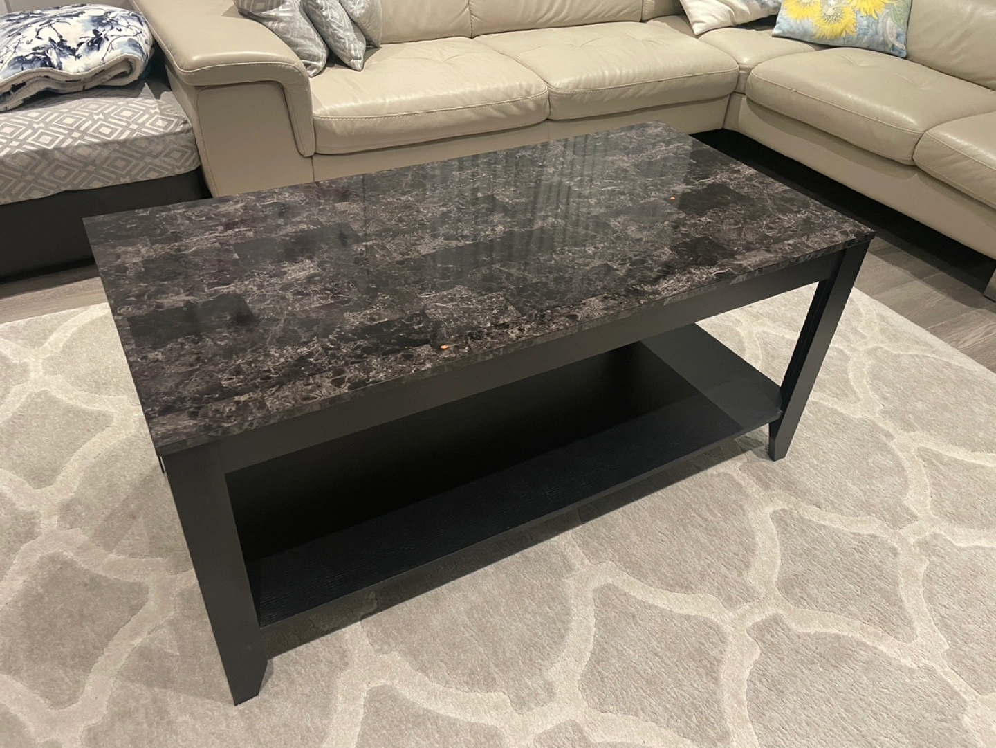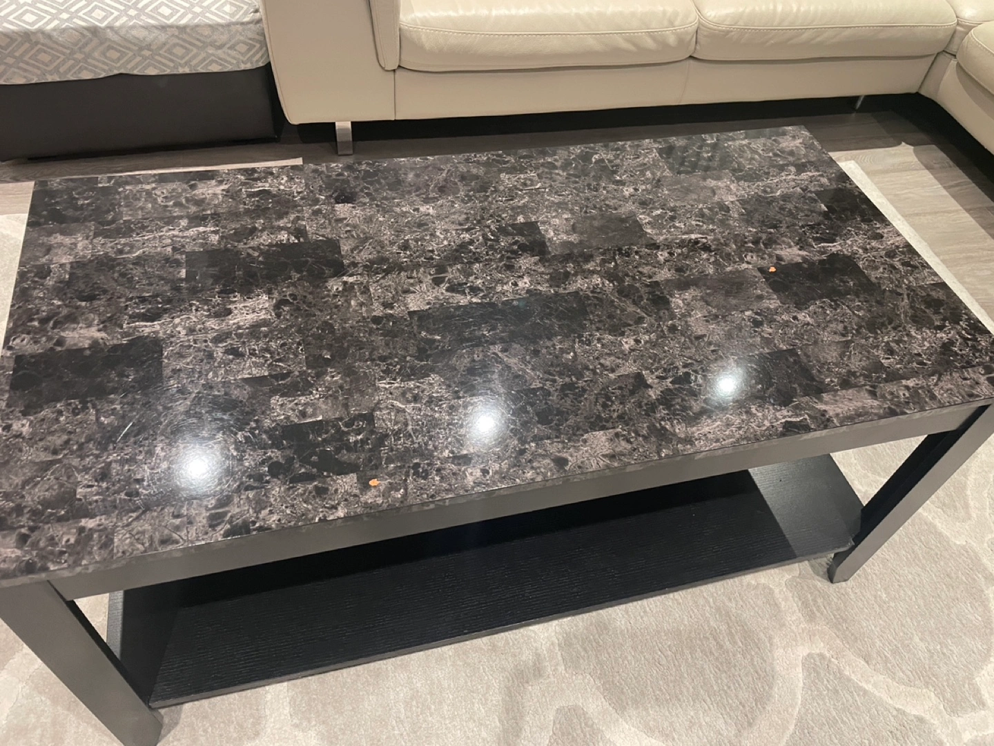 Can be used as TV stand or coffee table. Black frame, marble-look top. Lower shelf for storage. Minor imperfections on tabletop.