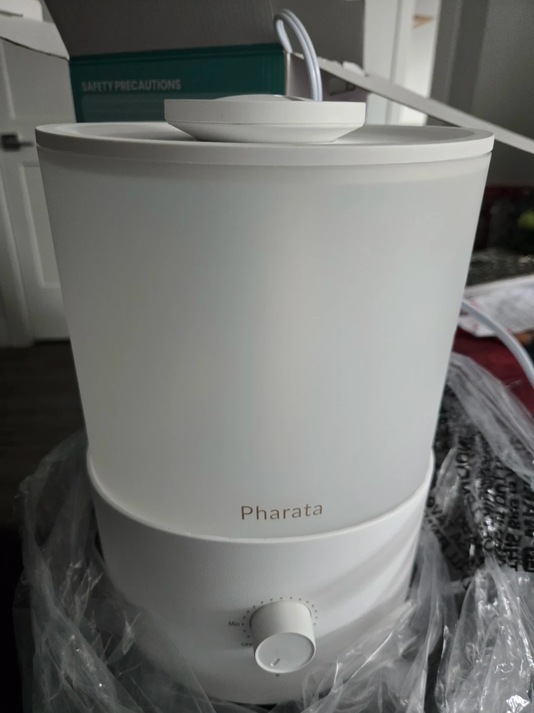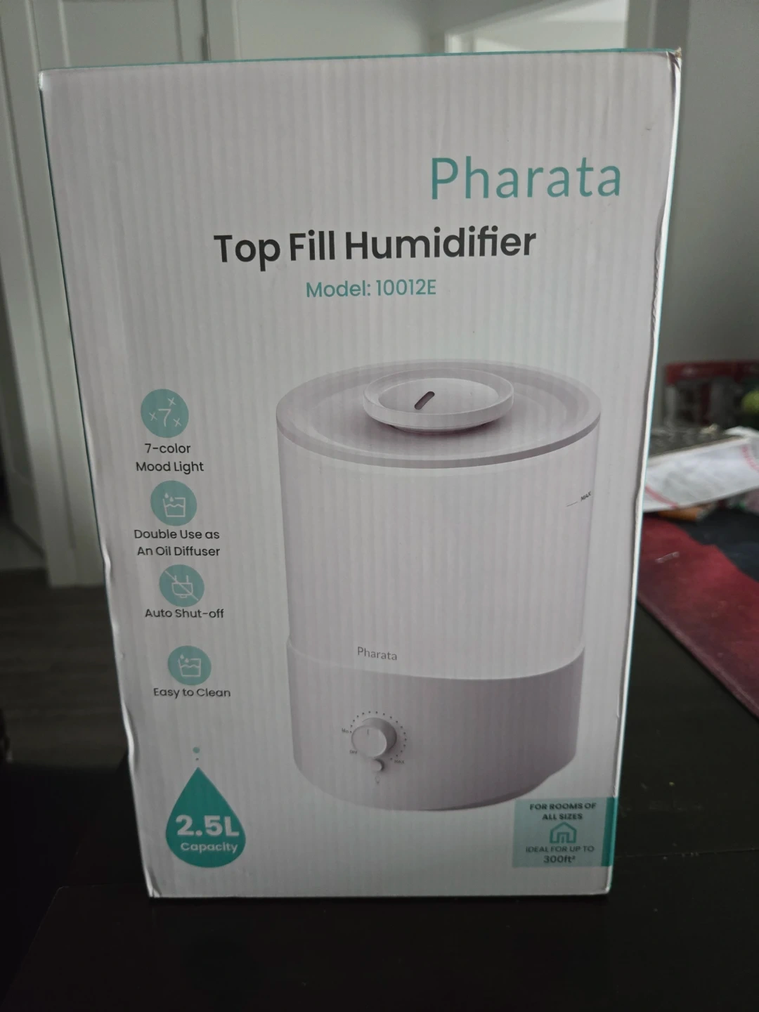 2.5l indoor humidifier. Has 7 color mood light, double use as an oil diffuser, and auto shut-off. It's easy to clean. Ideal for rooms up to 200 sq. ft.