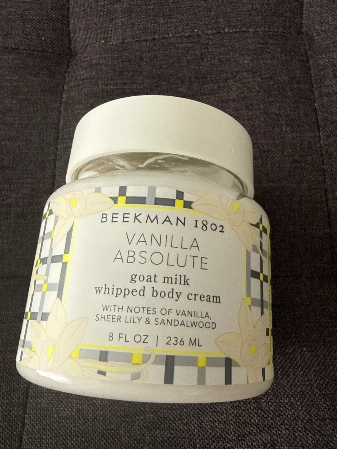*New, unopened* Beekman 1802 Pure Goat Milk Whipped Body Cream in Vanilla Absolute. The cream contains rich butters and premium botanical extracts, such as vanilla, sheer lily & sandalwood