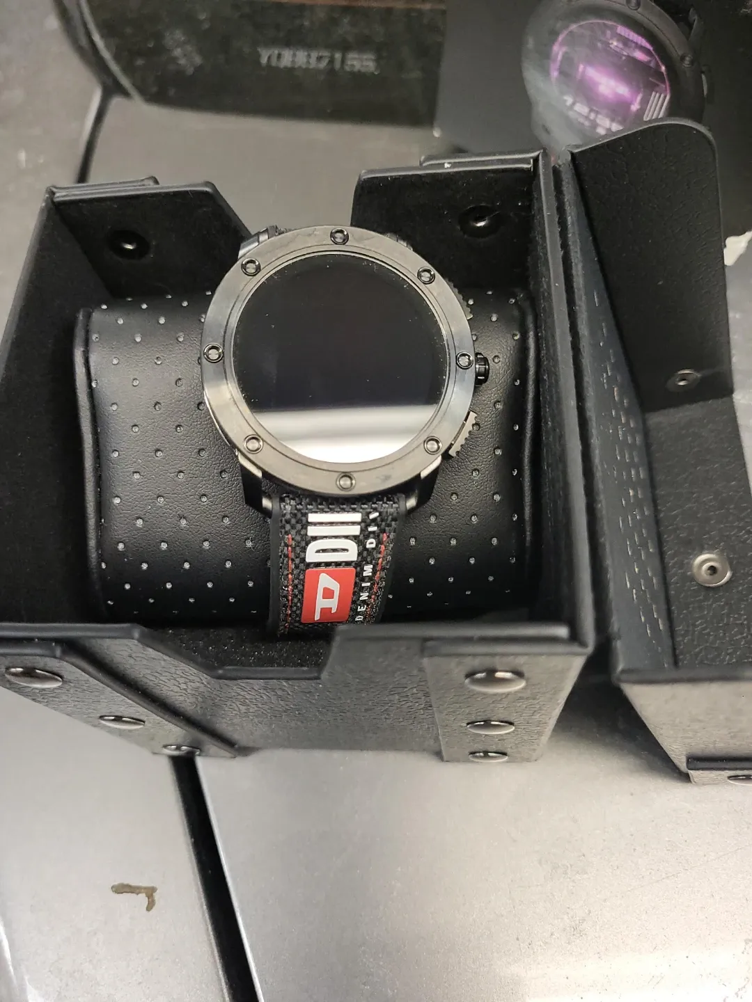 This is a black Diesel smartwatch. It's in its original box. The strap has "DIESEL DENIM DIVISION" printed on it. It's a stylish tech accessory.