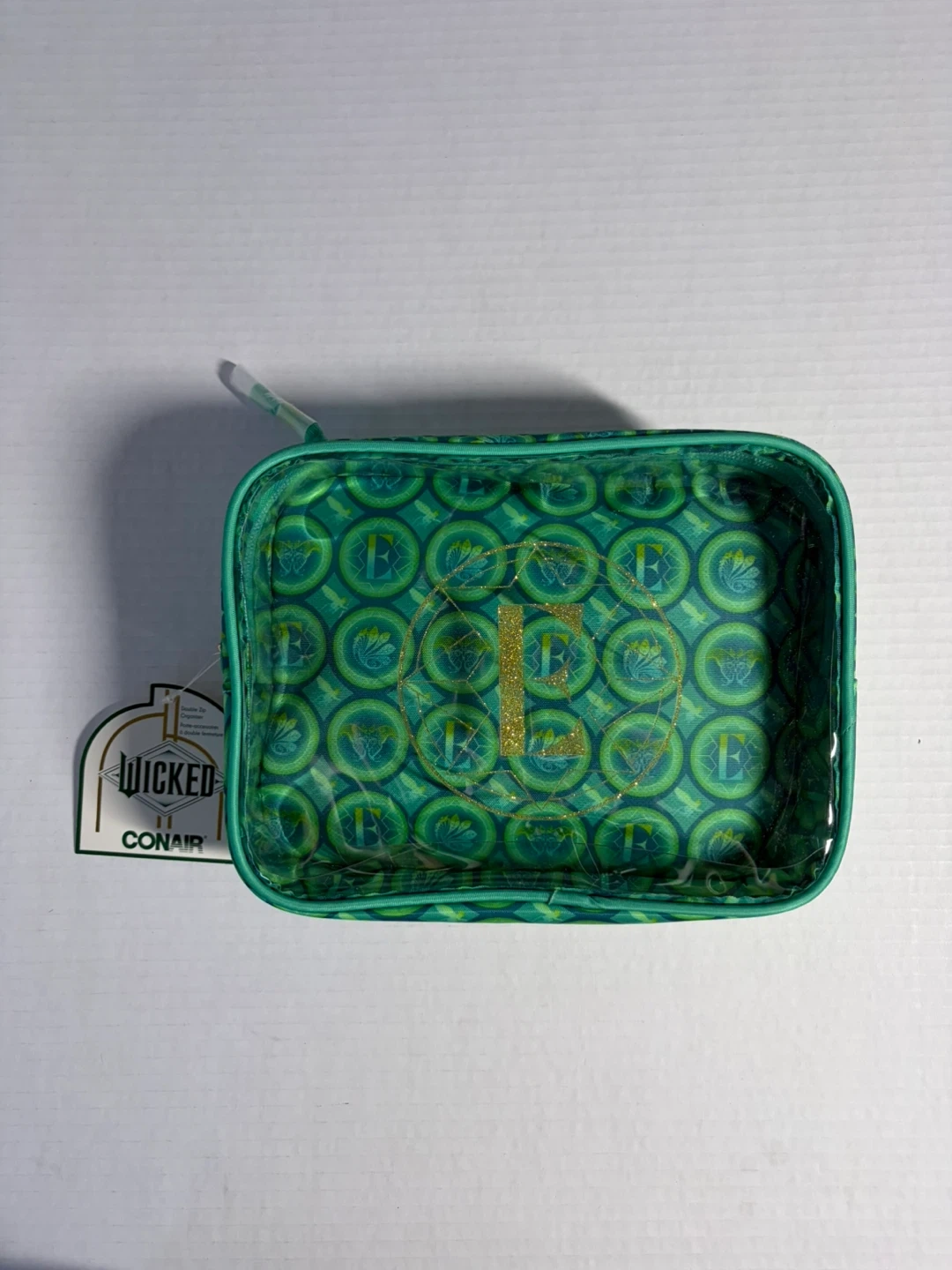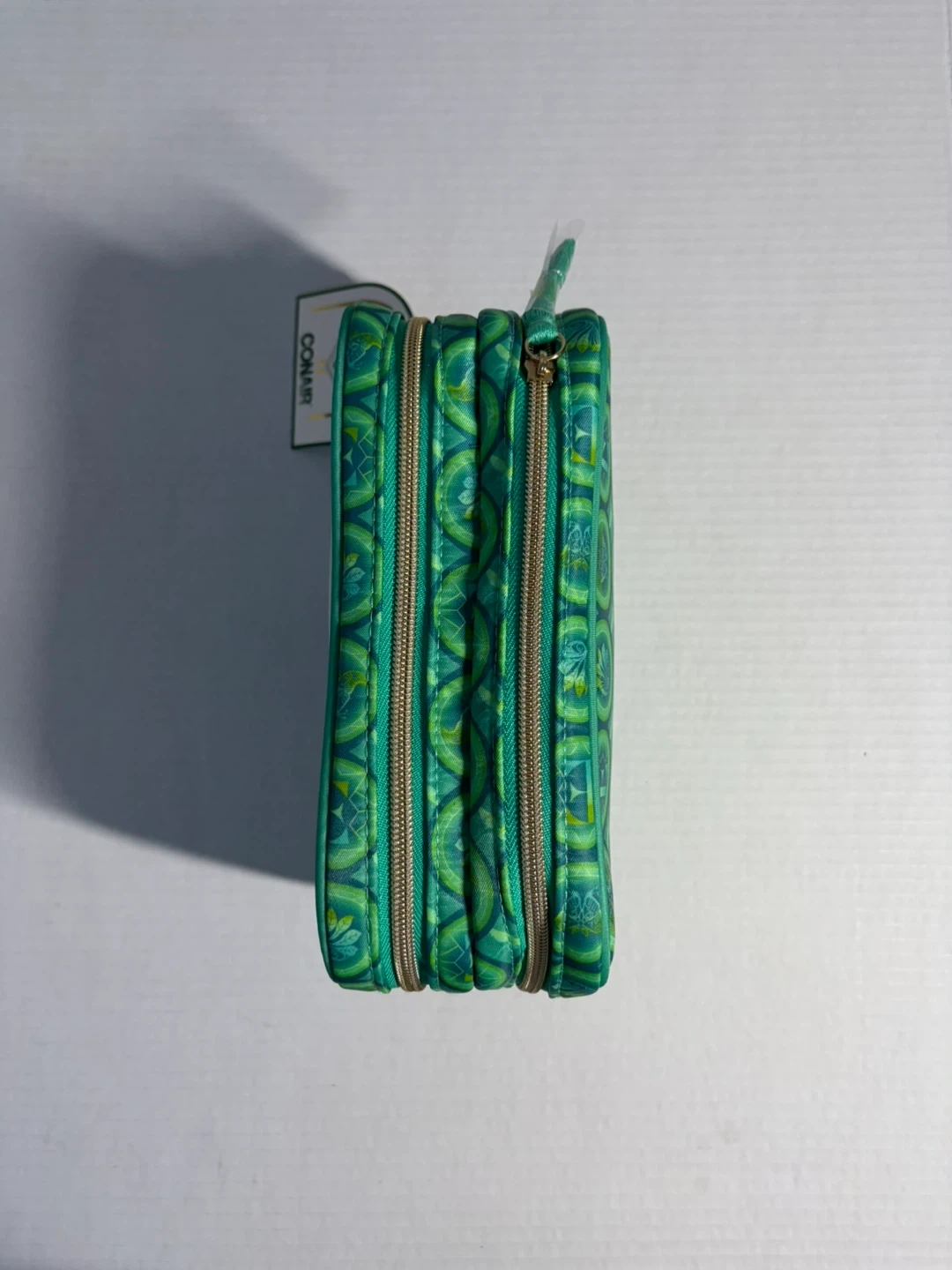 This Conair Wicked travel pouch is perfect for organizing small essentials. It features a vibrant green pattern with gold accents and a zippered closure. Measures approximately 6" x 4" x 3".