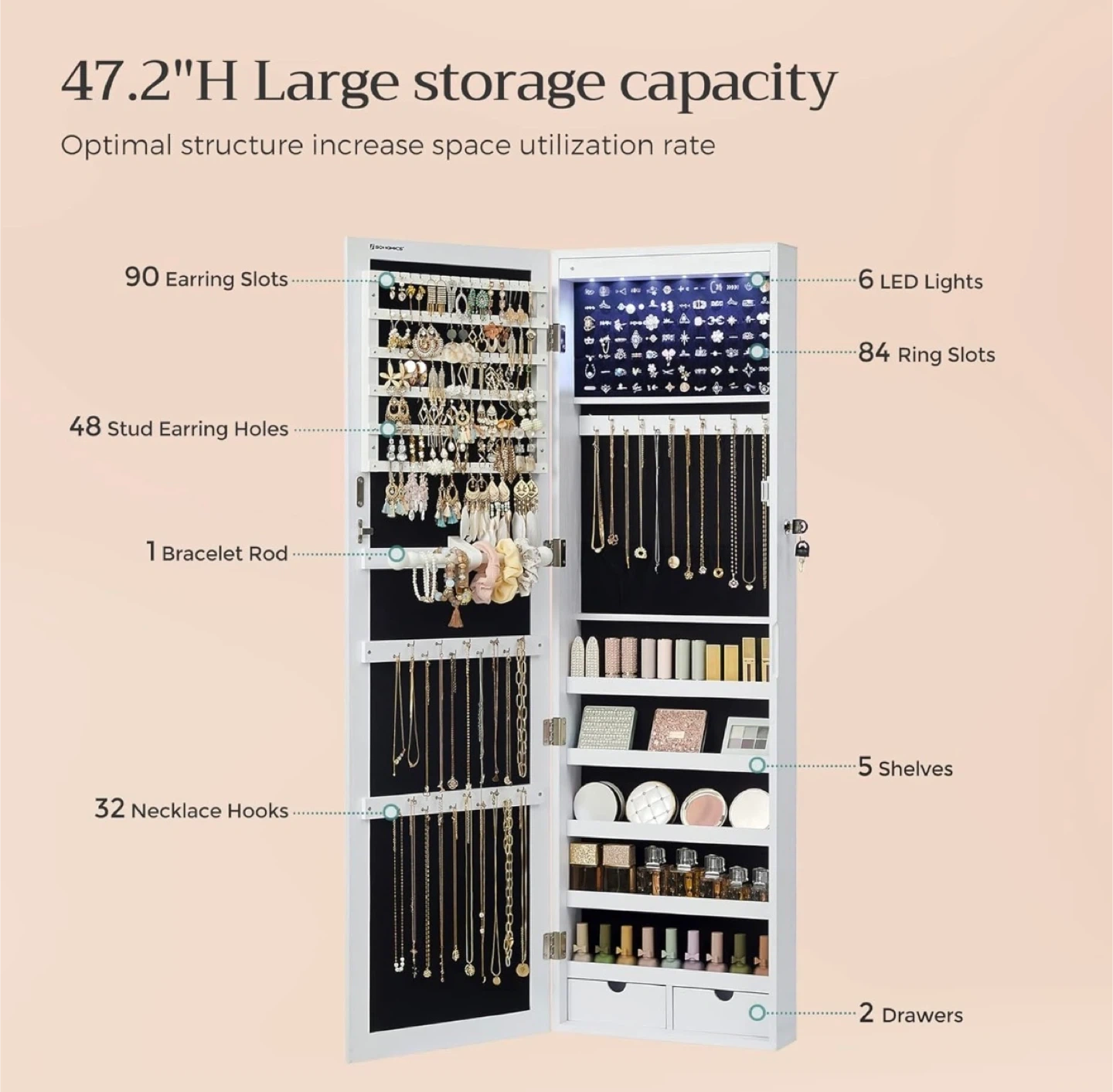LED Mirror Jewelry Cabinet 47.2” – Lockable Wall/Door Mounted