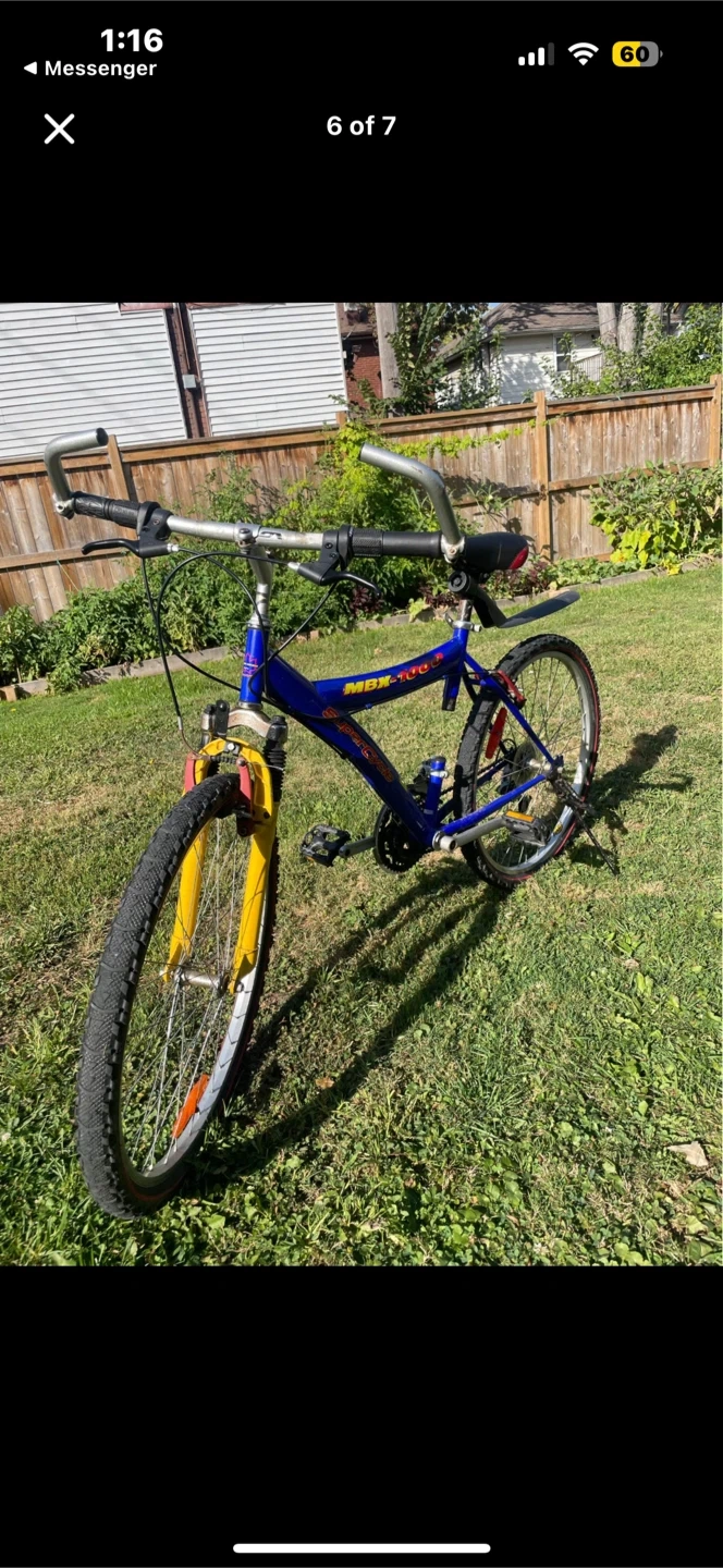 10Selling a blue and yellow MDX-1000 full suspension mountain bike. It's in good condition and ready for some outdoor adventures!