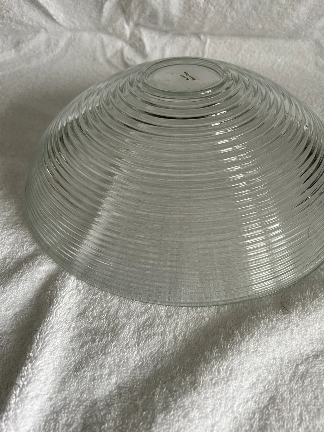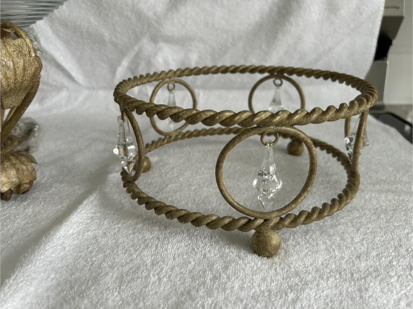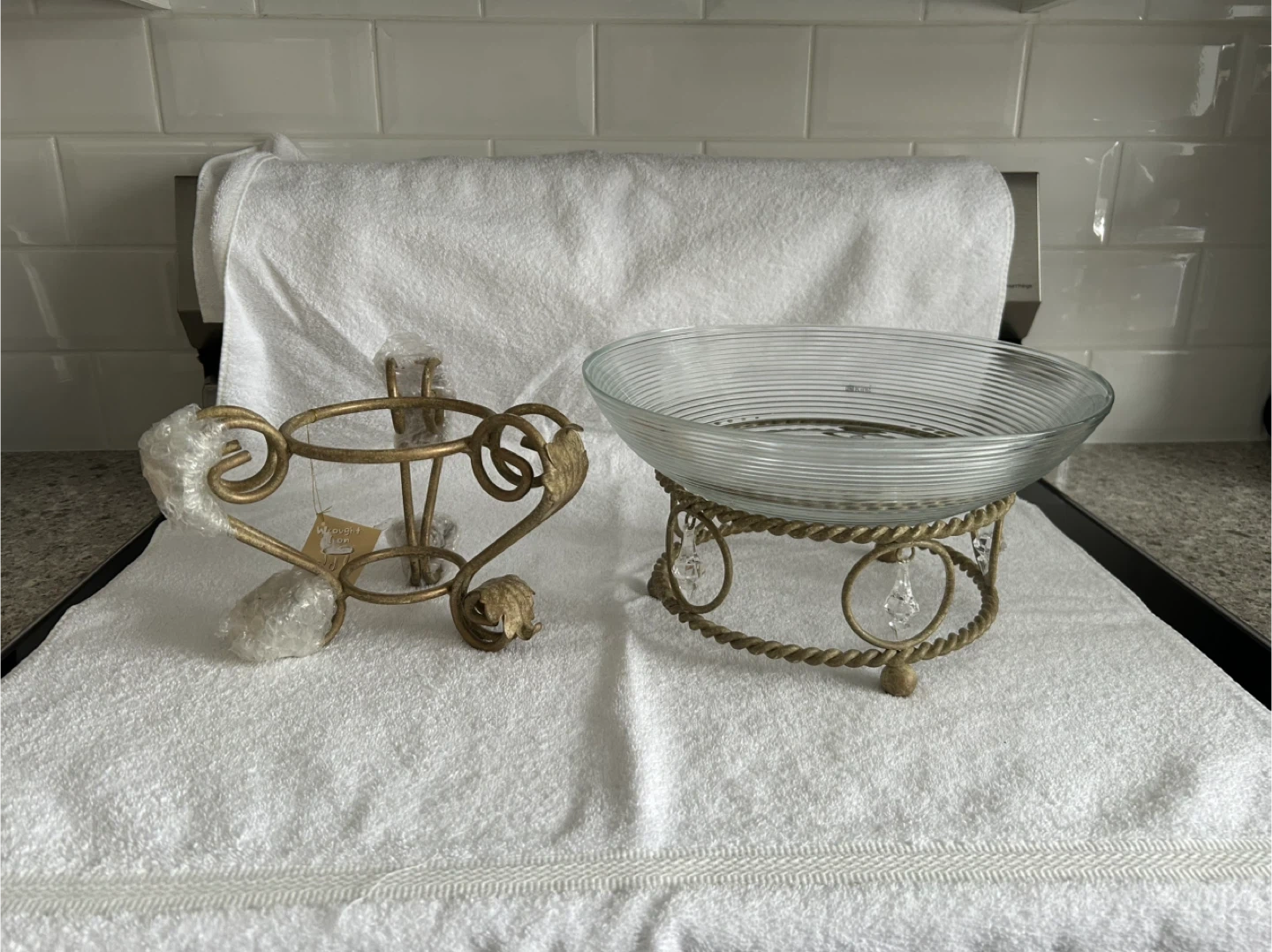 Never used. Create two different looks. 1 clear ribbed bowl, 2 metal bases. Wrought iron bases are light gold/ivory colour. Base with crystal-like hanging gems is 4” tall. Base with leaf accents is 6” tall. Bowl is 11” wide, 3.5” tall. Some bubble wrap still attached. 3 pieces for $25. Brampton, near Queen and Kennedy.