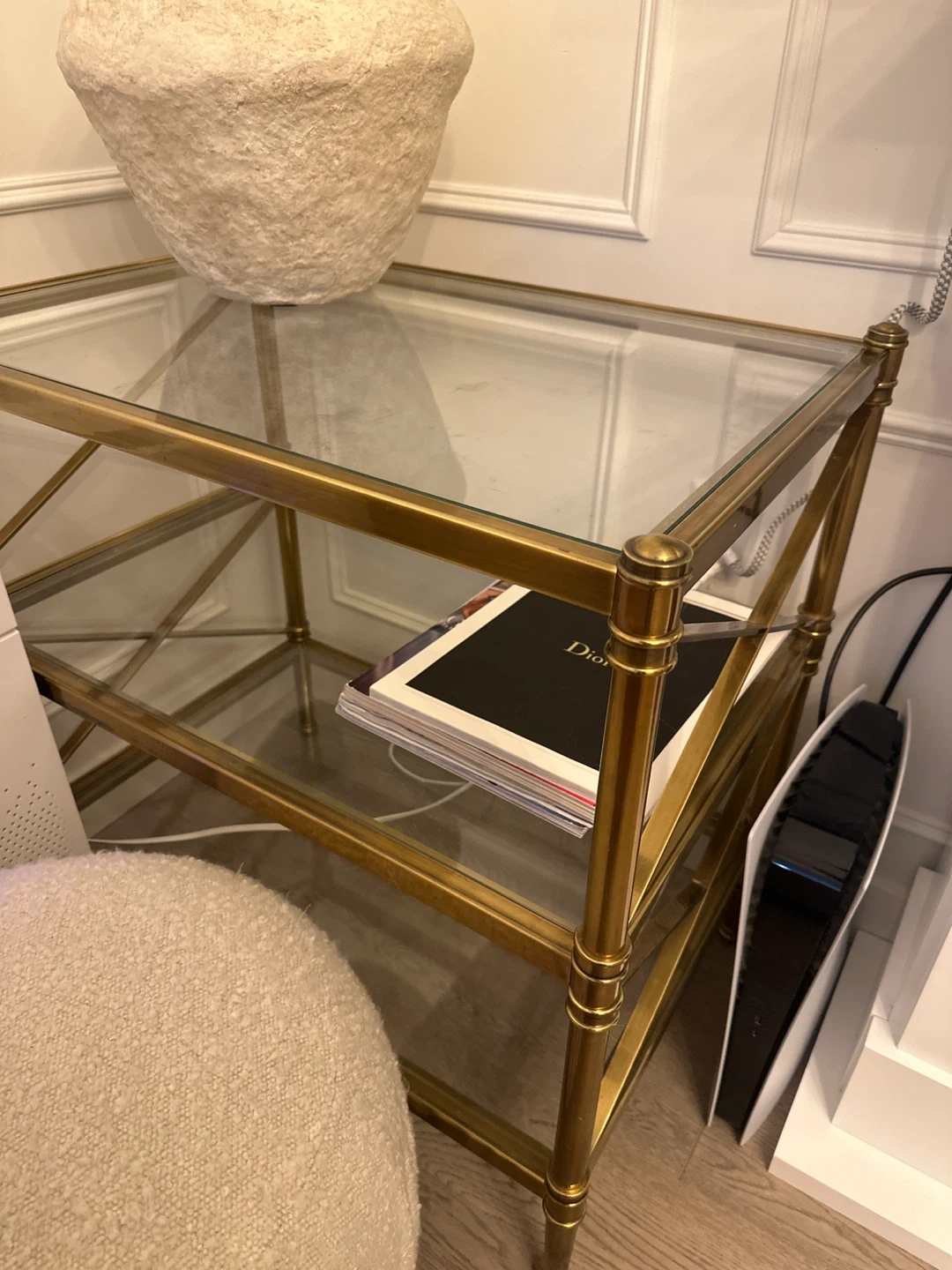 This is a stylish side table with a brass frame and glass shelves. It's perfect for placing beside a couch or bed. The table has a modern design and offers two tiers of storage.