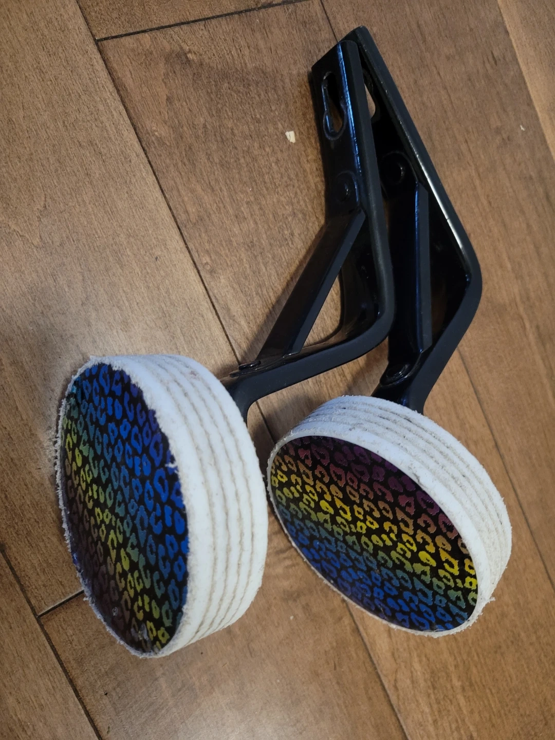 These are training wheels for a kids bicycle. They have a fun rainbow leopard print design on them. They're a great way to help a child learn to ride a bike!