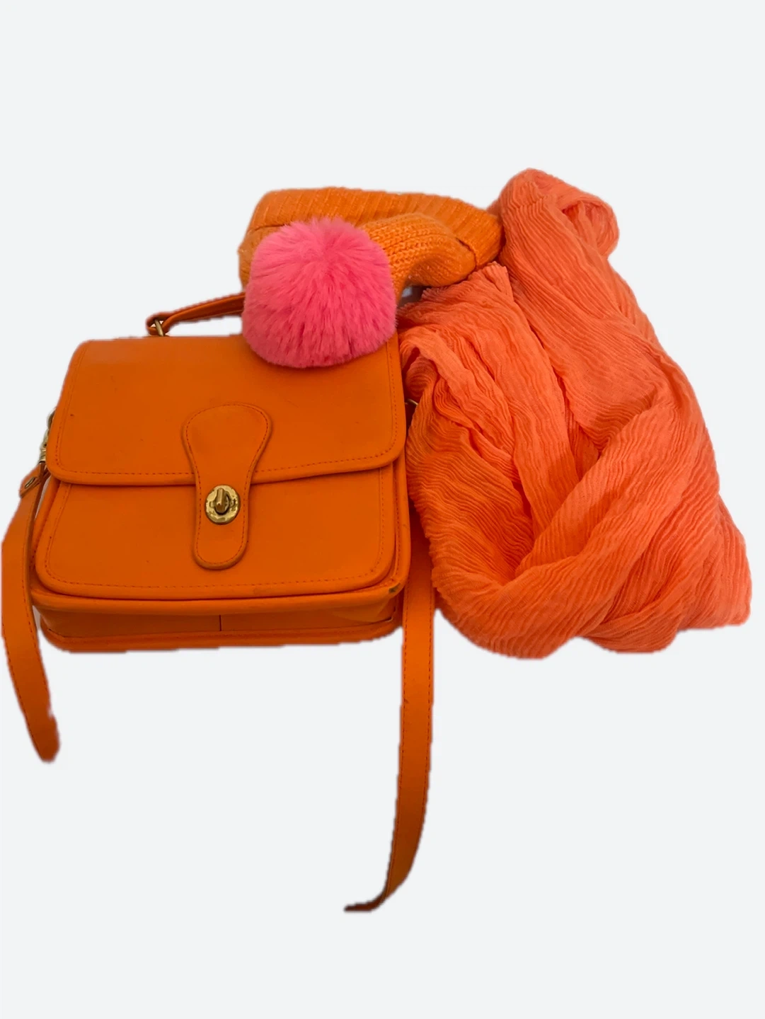 A vibrant orange leather crossbody handbag with a gold clasp closure. It's paired with a matching orange knit beanie hat featuring a pink pom-pom. The set also includes a lightweight crinkled orange scarf. Perfect for adding a pop of color to any outfit!