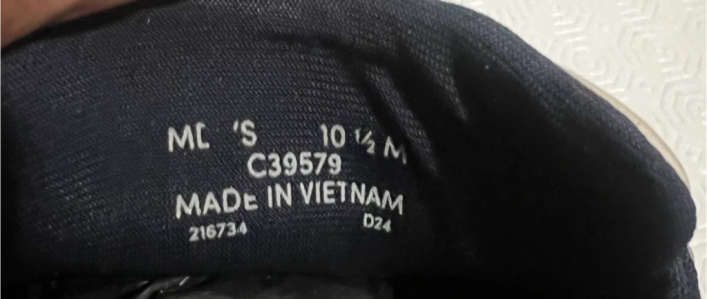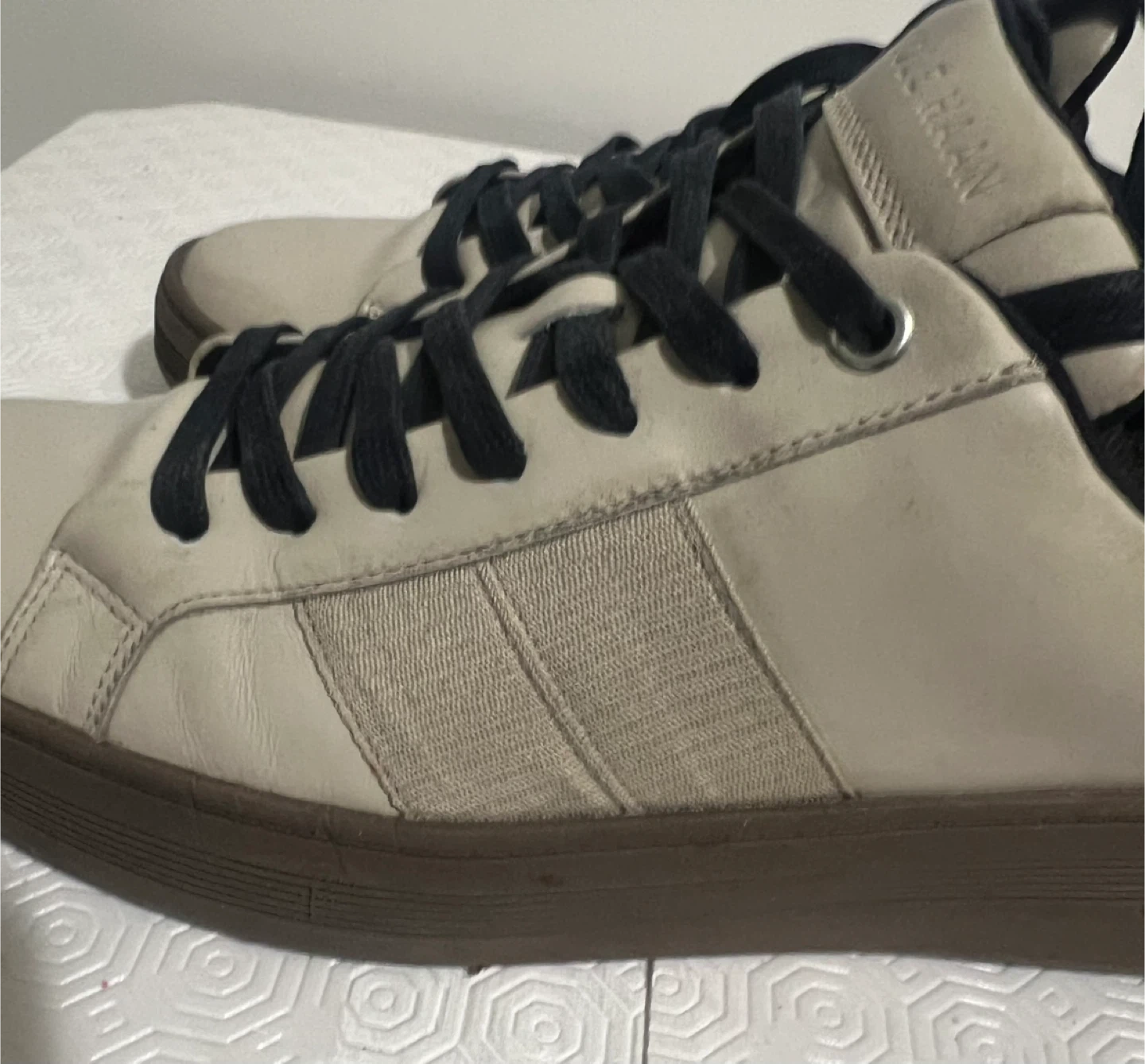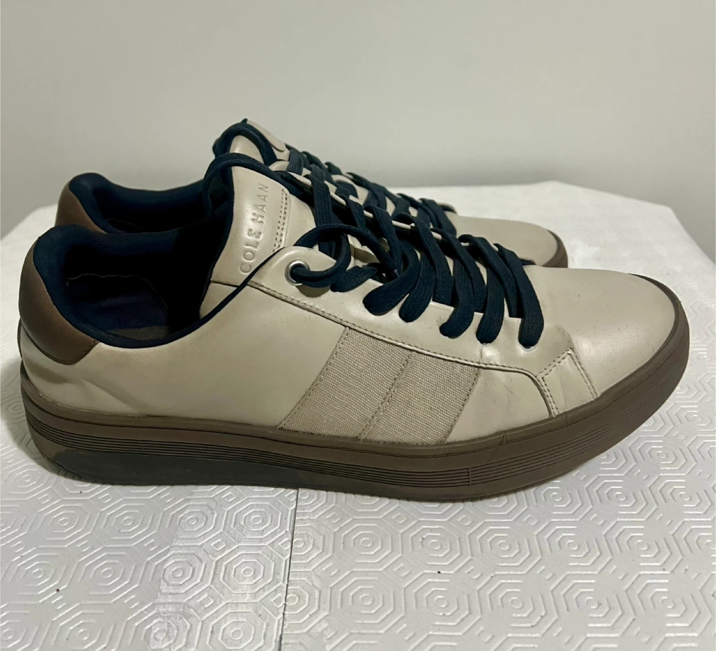 Cole Haan men's sneakers in a light beige colour. Features dark blue laces and trim with a brown sole. Made in Vietnam. Size is 10.5 men's.