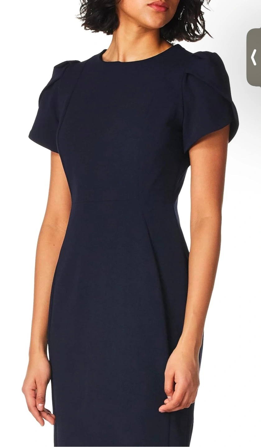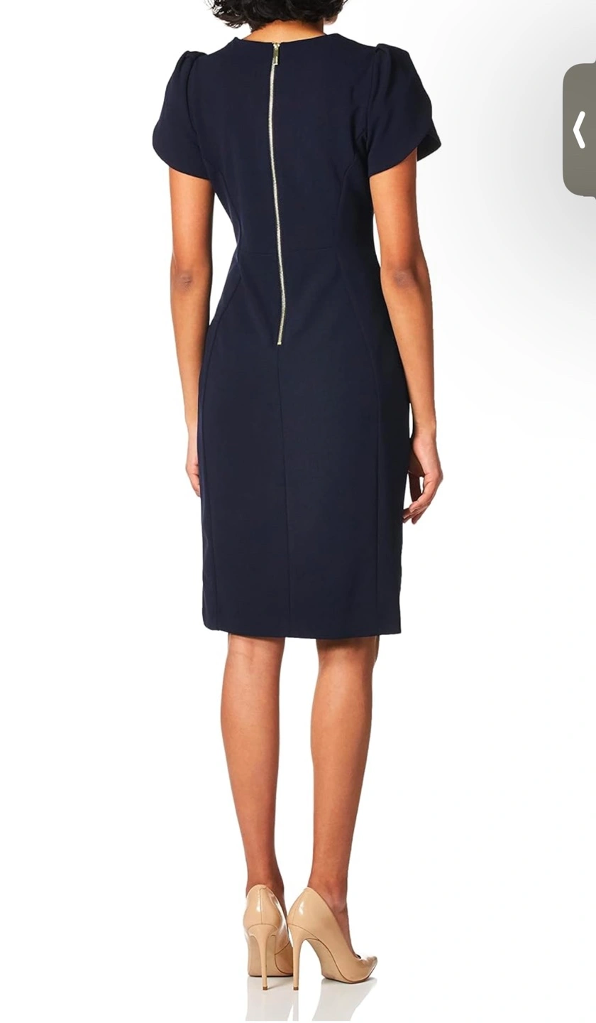 Navy blue fitted dress with short puff sleeves. Round neckline and back zipper. Fabric is a smooth, stretchy material. Used only once.
