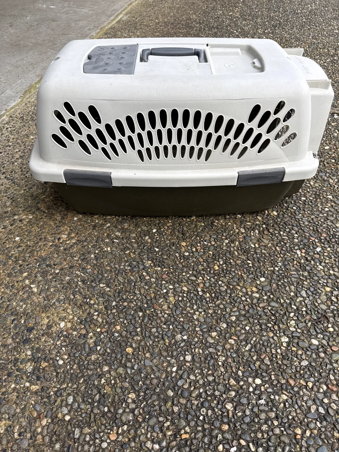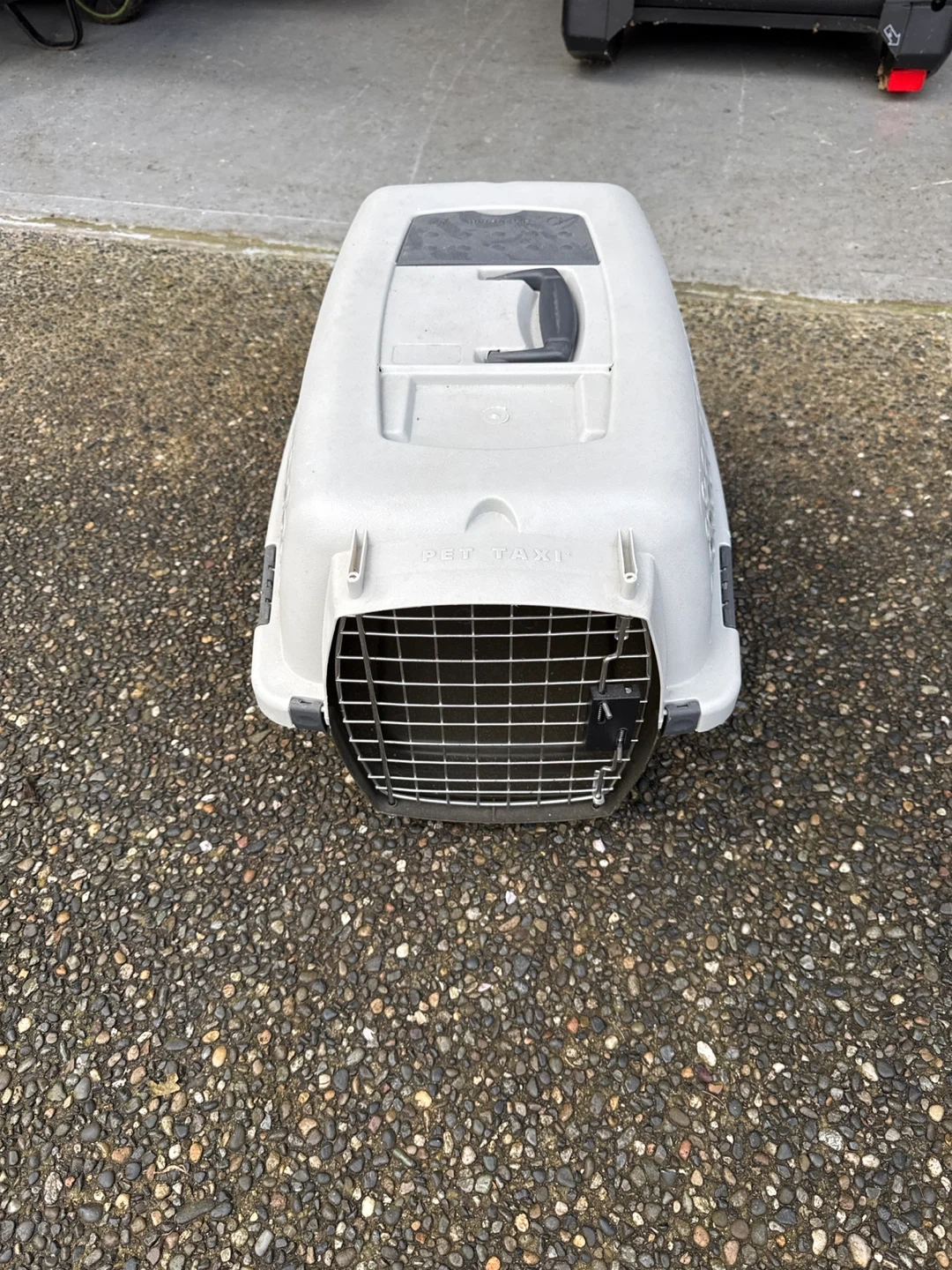 This is a Pet Taxi pet carrier, perfect for safely transporting your furry friend. It's made of durable plastic with a sturdy metal door. Ventilation slots ensure good airflow.