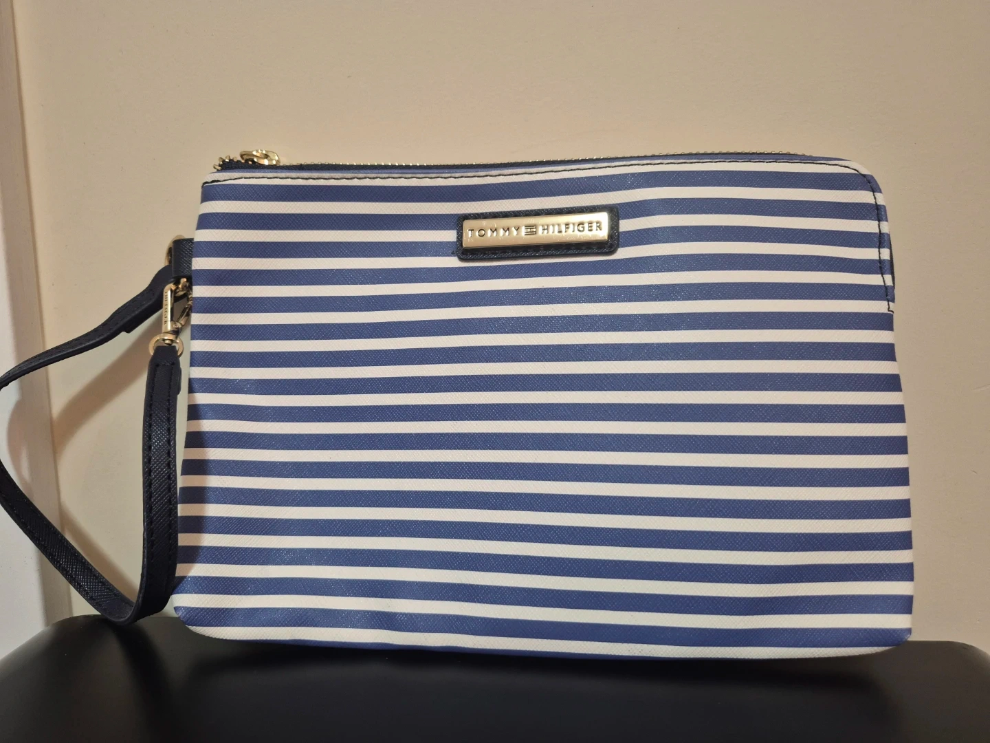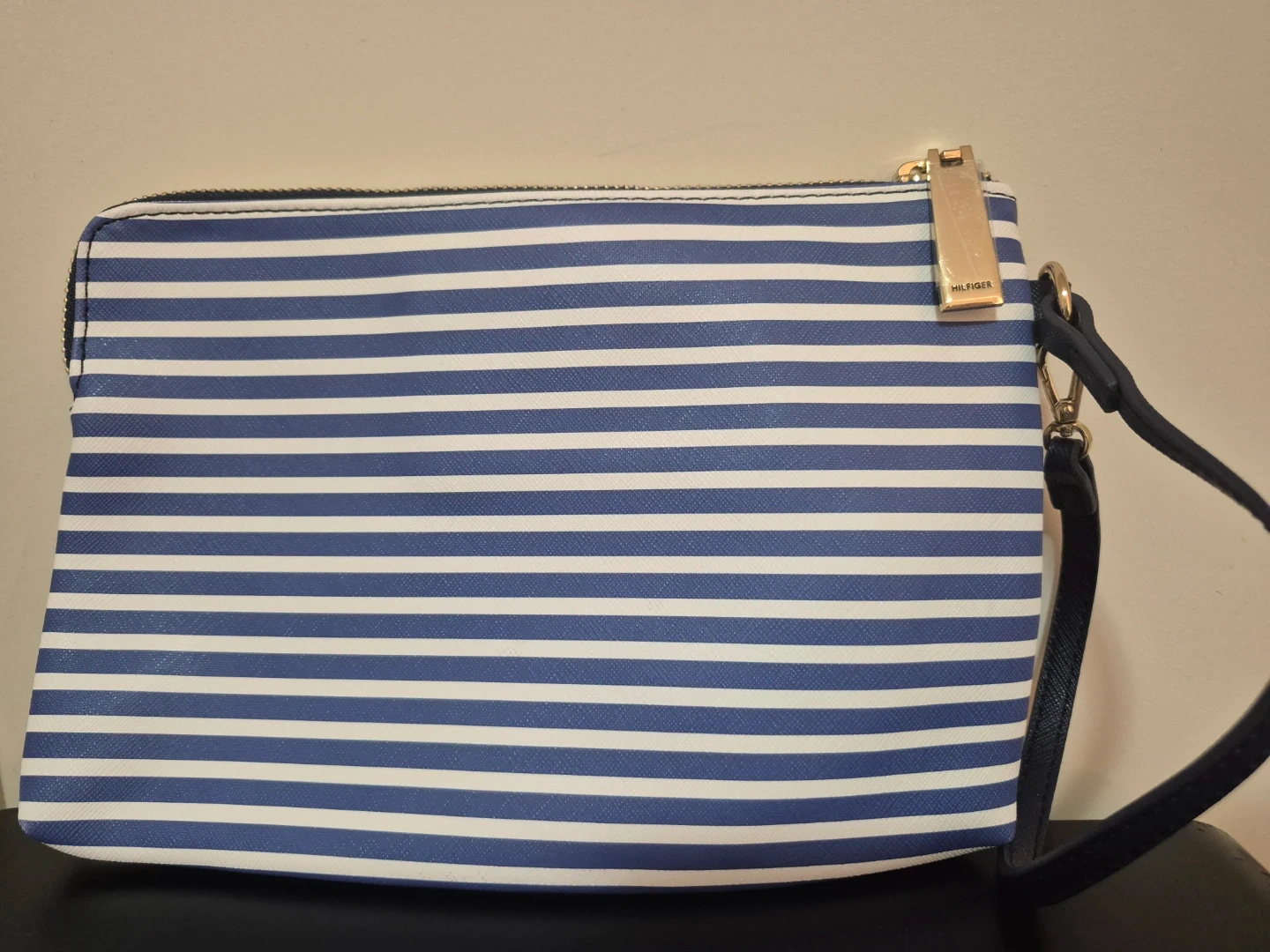 Tommy Hilfiger wristlet with a blue and white striped design. It's in great condition and perfect for carrying your essentials!