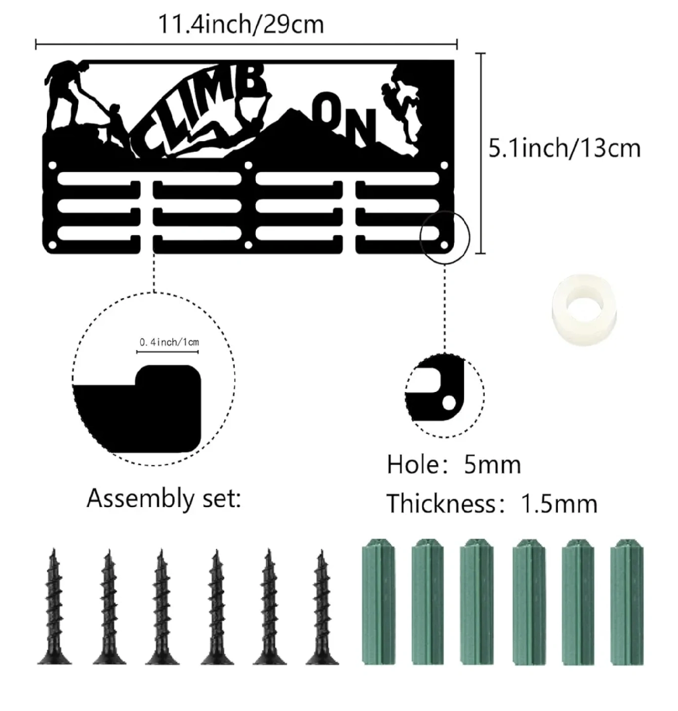 Keep your medals organized with this Climb On design medal hanger! It can hang more than 60 medals and has a super loading capacity of up to 5kg/11lb. - Intelligent non-slip stop block - Firm and smooth surface, no sharp edges - 3 separate hooks design, easy to hang up medals - Includes assembly hardware (6 anchors, 6 screws)