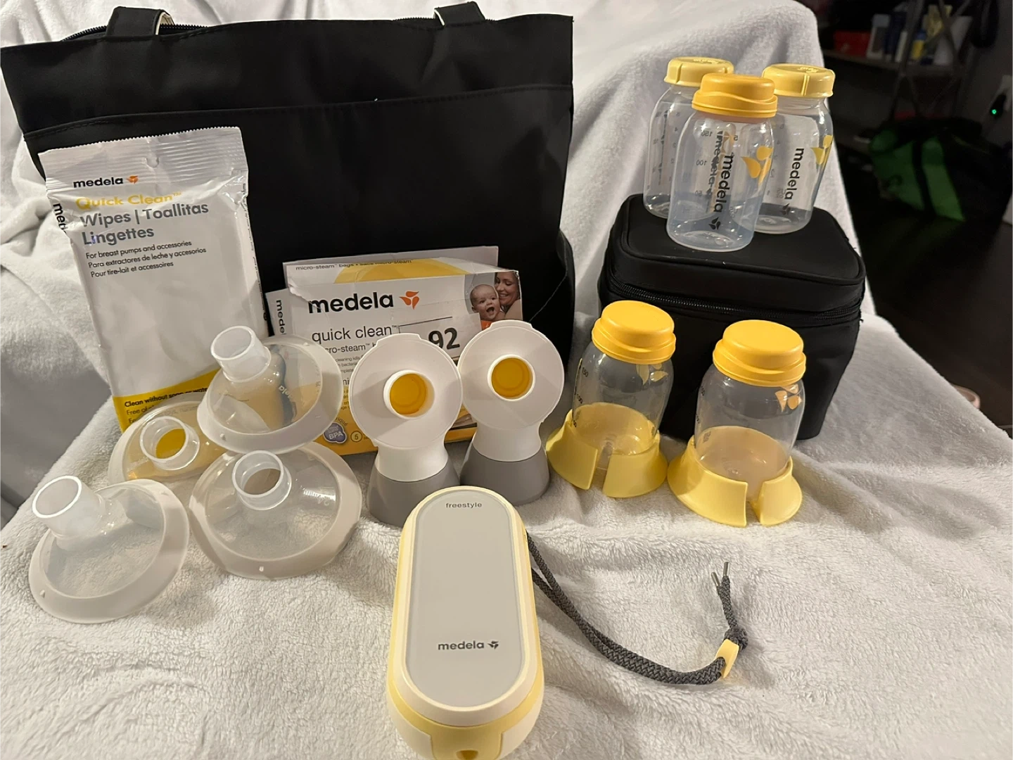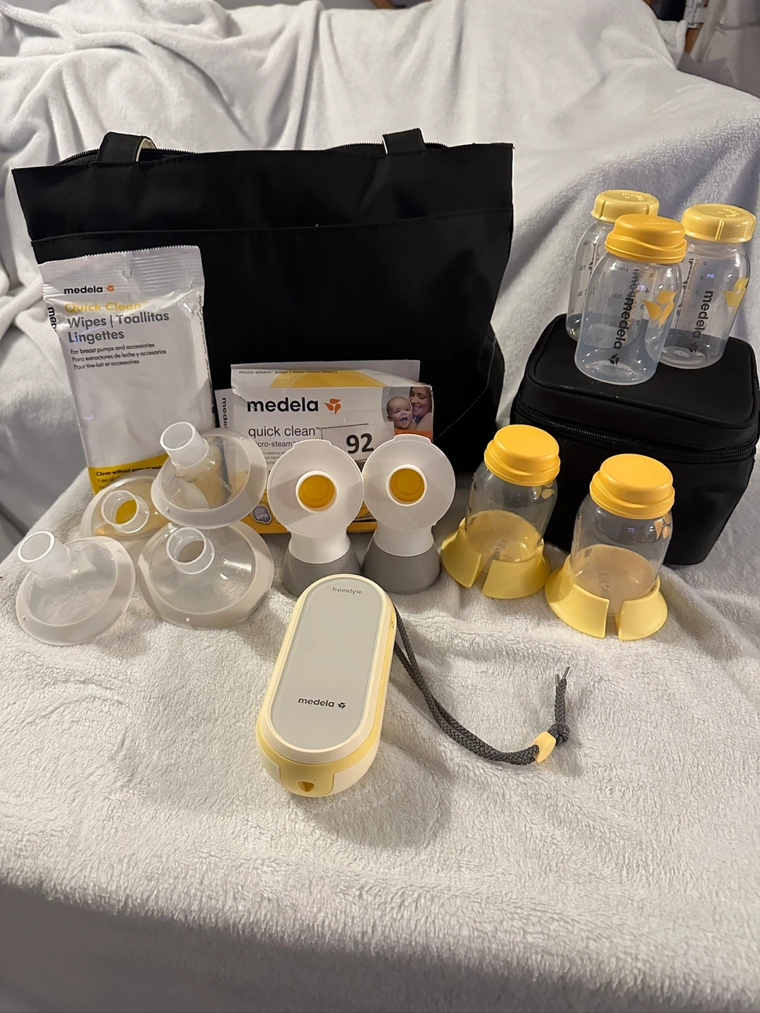18Selling a Medela Freestyle breast pump set. It comes with a variety of accessories, including bottles, breast shields, cleaning wipes, and a cooler bag. Everything you need to get started is included! Used for 1 month.