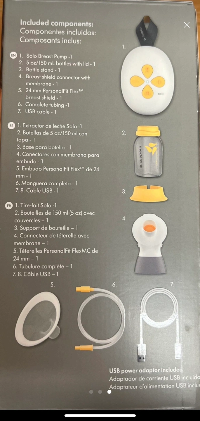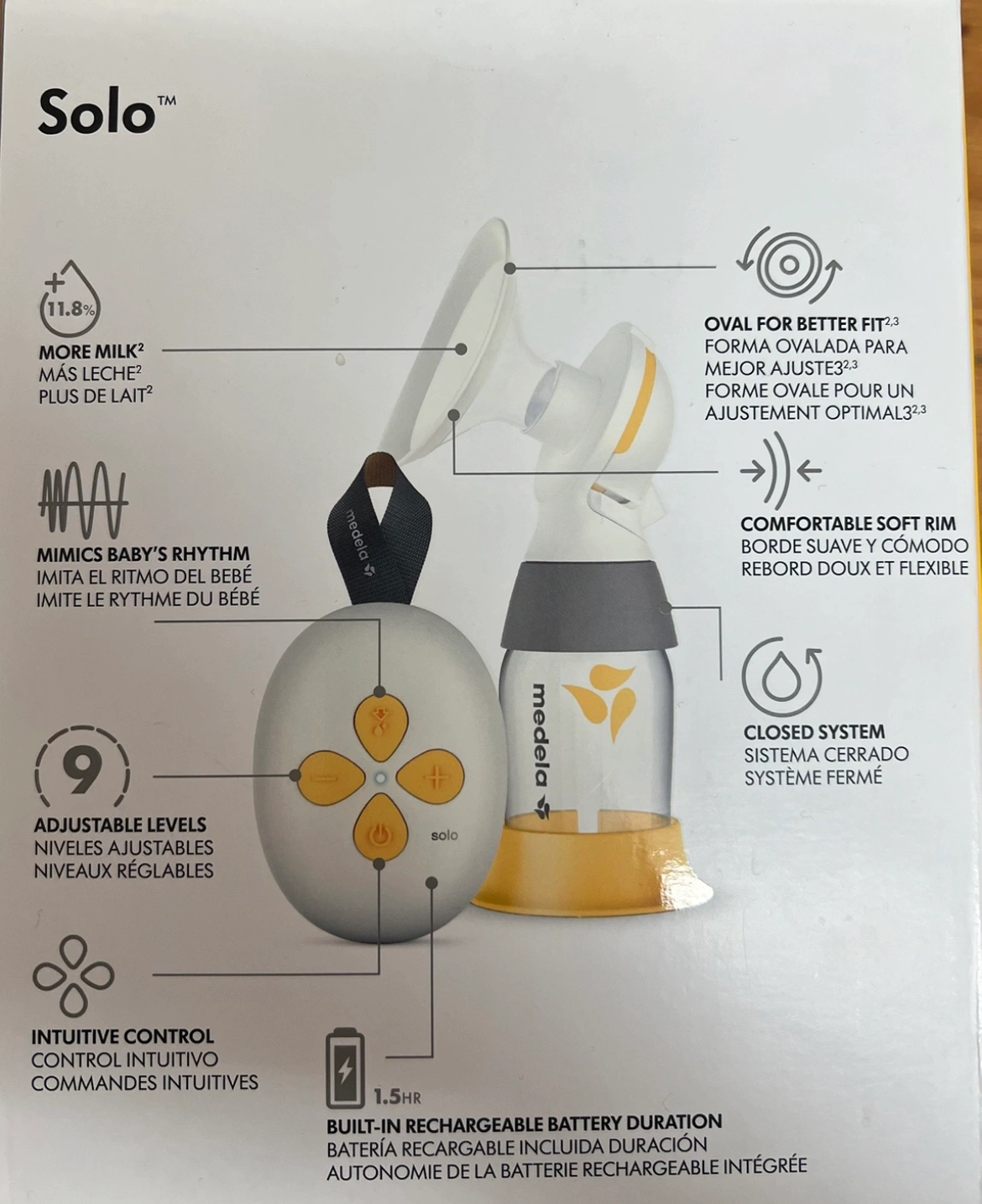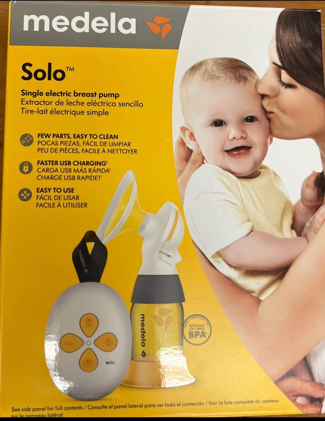 Brand new in box Medela solo. Compact, effective and easy to use single electric breast pump with rechargeable built-in battery for easy pumping on-the-go. Intuitive and hassle-free. Solo, the effortlessly easy pump to use. It has only a few parts making is easy to clean and assemble. With its intuitive 4-button interface and 9 pre-programmed settings this single electric breast pump is extremely easy to use. Pump wherever you are, even if no power outlet available. With the cutting-edge available USB type C connector on the Solo single electric breast pump, the built-in rechargeable battery charges faster compared to the micro USB port, lasting for up to six pumping sessions when fully charged. 2-Phase Expression technology. During a feeding session, babies start by using short, fast sucks to stimulate the Milk Ejection Reflex. Once the milk begins to flow, babies change to a slower, individual rhythm. Medela's 2-Phase Expression technology mimics baby's natural sucking rhythms - faster to stimulate milk flow, then slower to provide optimal milk flow. PersonalFit Flex breast shield. With a 105-degree opening angle, soft rim and oval shape for a better fit, the PersonalFit Flex breast shield puts less pressure on your milk ducts than traditional breast shields, resulting in a more effective and comfortable pumping experience. More comfort for you, up to 11.8% more milk for your baby - clinically proven. Closed system prevents breast milk from entering the tubing, overflowing and leaking into the pump mechanism. This helps ensure that your expressed milk stays safe and clean, but also that your pump's components are protected from potential damage. Retails for $199.99 +tax https://www.babiesrus.ca/en/Medela-Solo-Single-Electric-Breast-Pump/14F64A5F.html