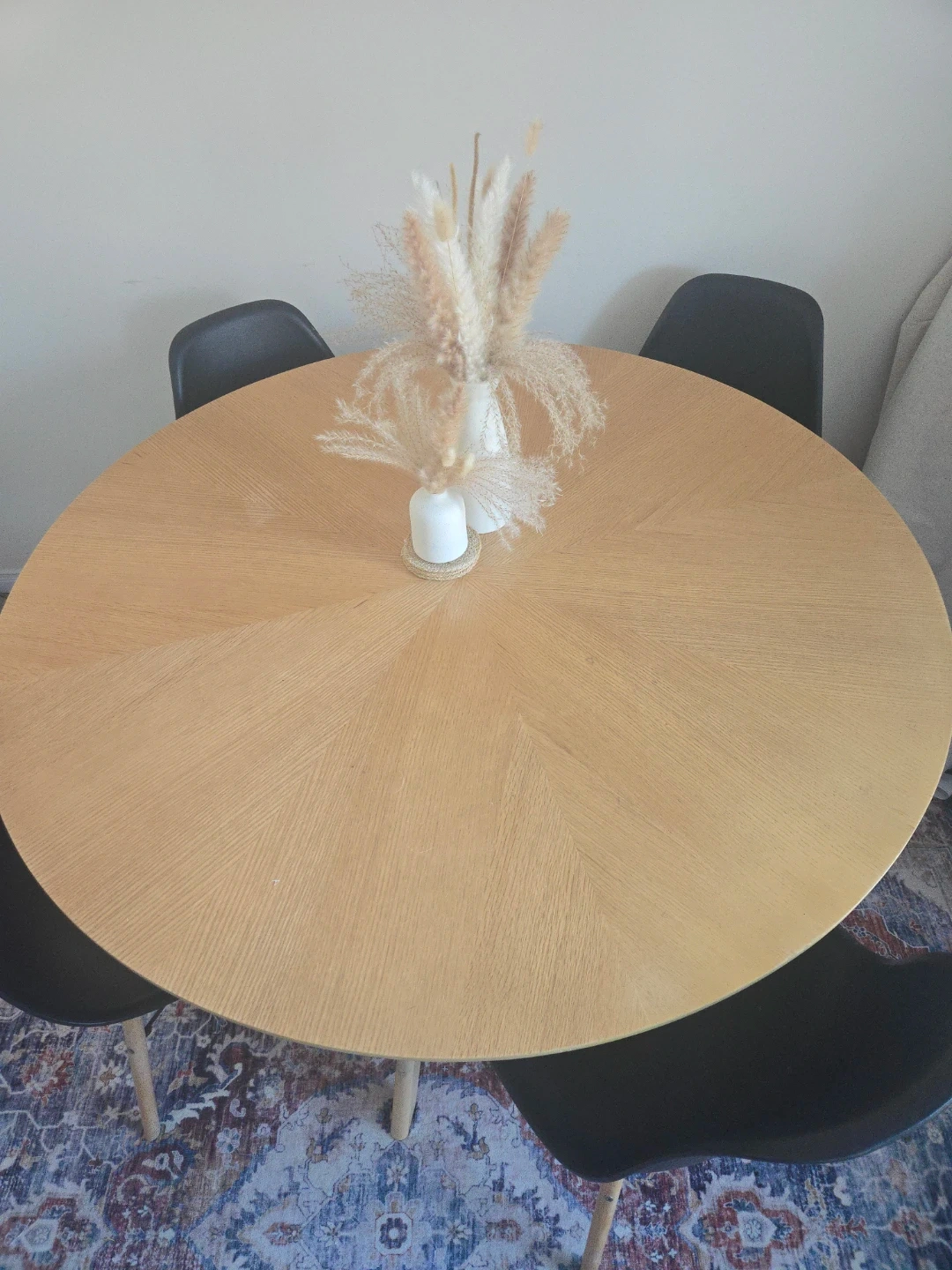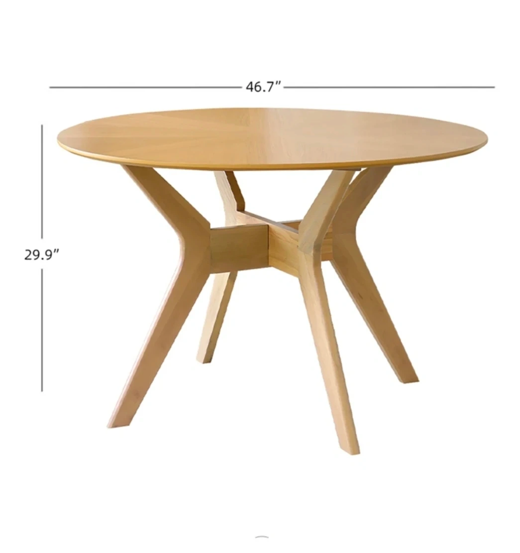 Round dining table with a light wood finish. Diameter is 46.7" and height is 29.9". Sturdy design with legs made of solid wood and a sunburst-patterned rubberwood veneer table top. Come with 4 chairs.