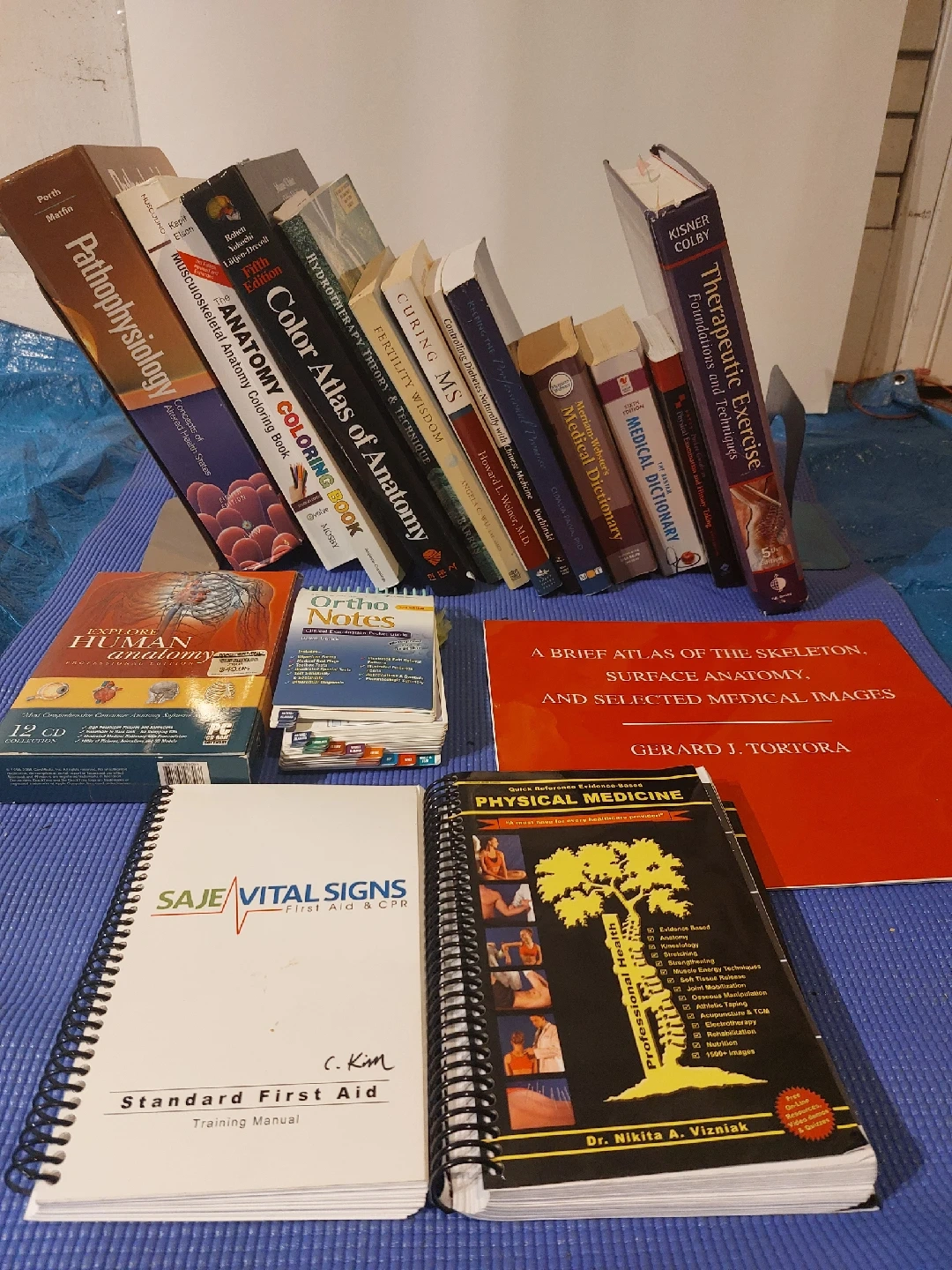69A collection of medical and first aid books, including titles on anatomy, physiology, therapeutic exercise, and more! Great for students or healthcare professionals looking to expand their library. Includes books like 'Pathophysiology', 'Anatomy Coloring Book', 'Therapeutic Exercise', and a 'Standard First Aid Training Manual'