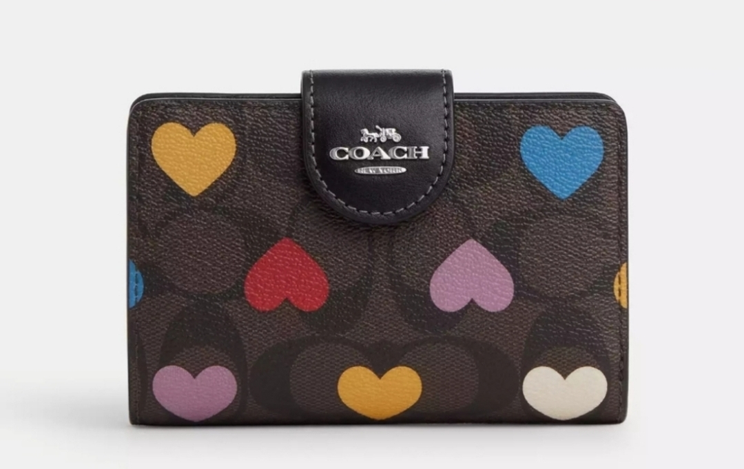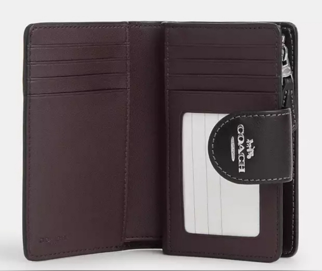 Measurements Length: 5.0" Height: 3.5" Width: 0.5" Materials Signature coated canvas and smooth leather Features Zip coin pocket Snap closure Bill compartment Seven credit card slots ID window
