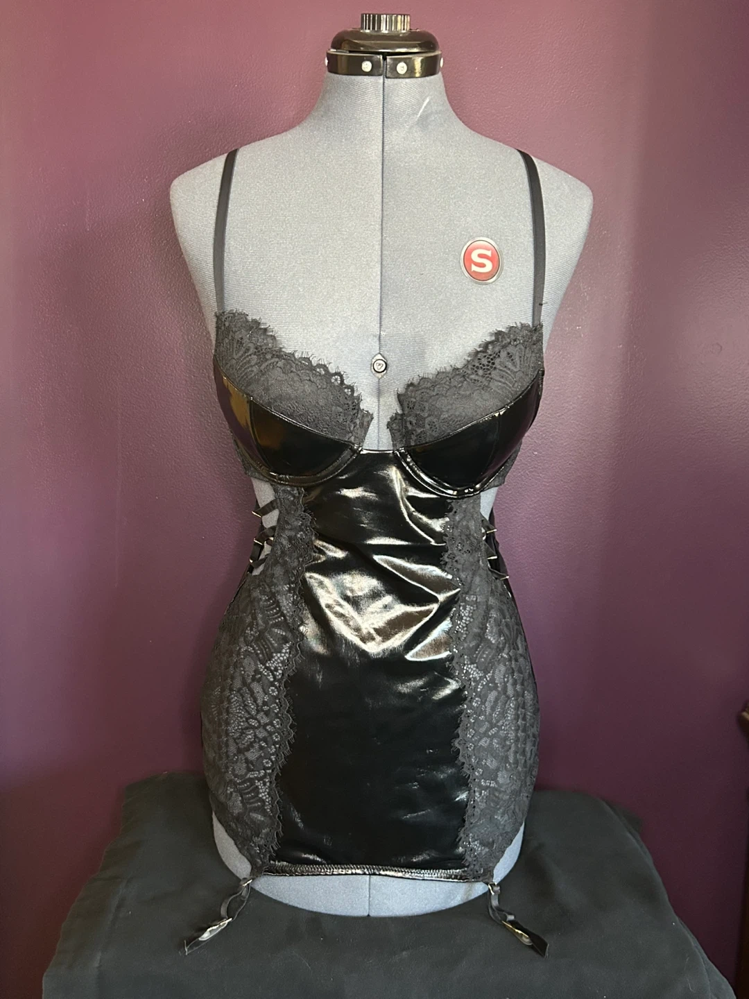293size medium super sexy black PVC & lace merry widow lingerie. adjustable shoulder straps, good amount of stretch throughout the body, adjustable stocking straps, adjustable back bra closure with ample push up, side open detail with lace. great for use as part of an adult costume or even paired with a skirt over it or for photo shoots!