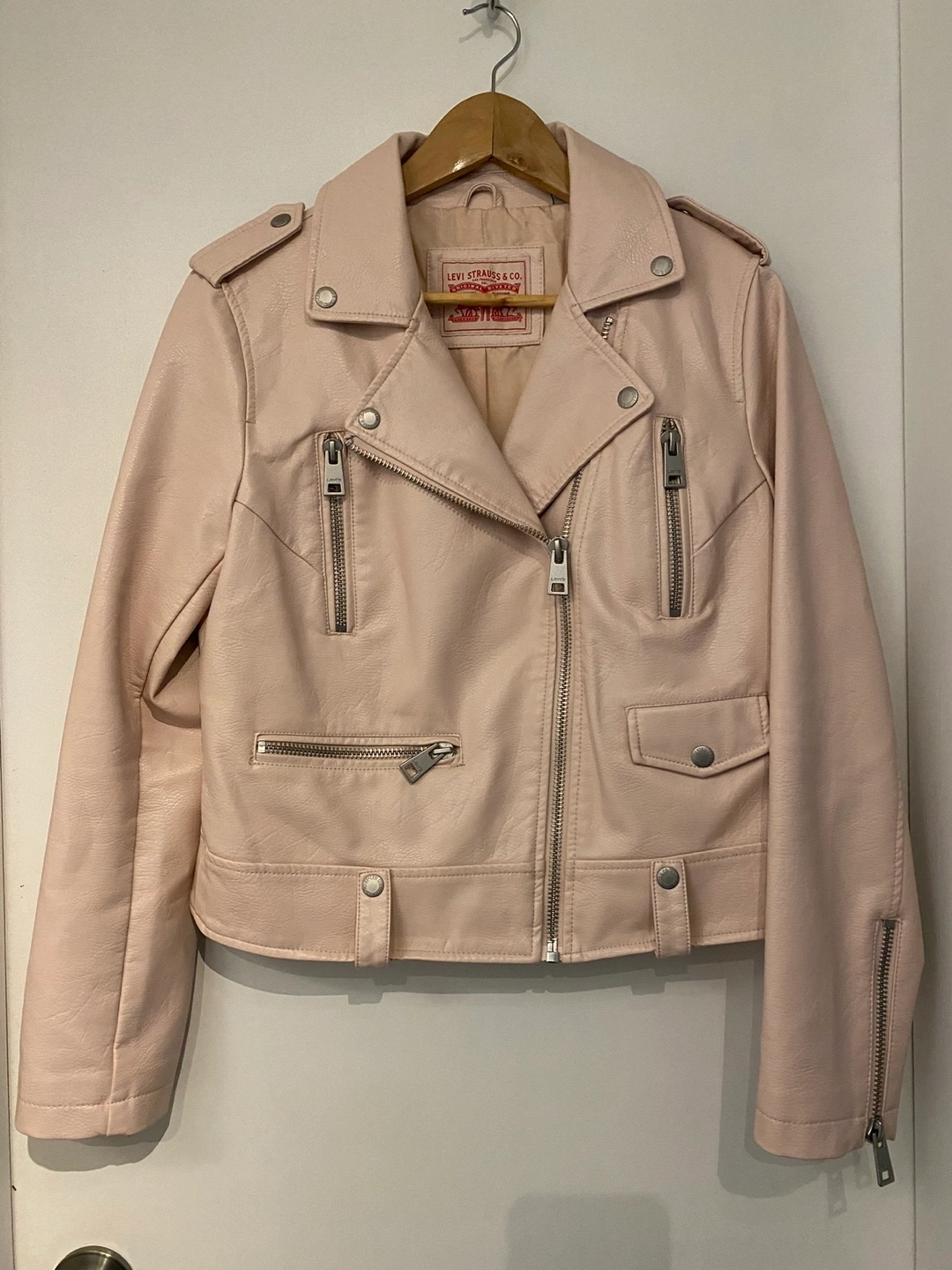 293Pink faux leather moto jacket. Asymmetrical zipper. Zippered pockets. Medium size. same style being sold on Amazon.ca for $130+ (pic included for reference). Super cute, worn once but no longer fits.