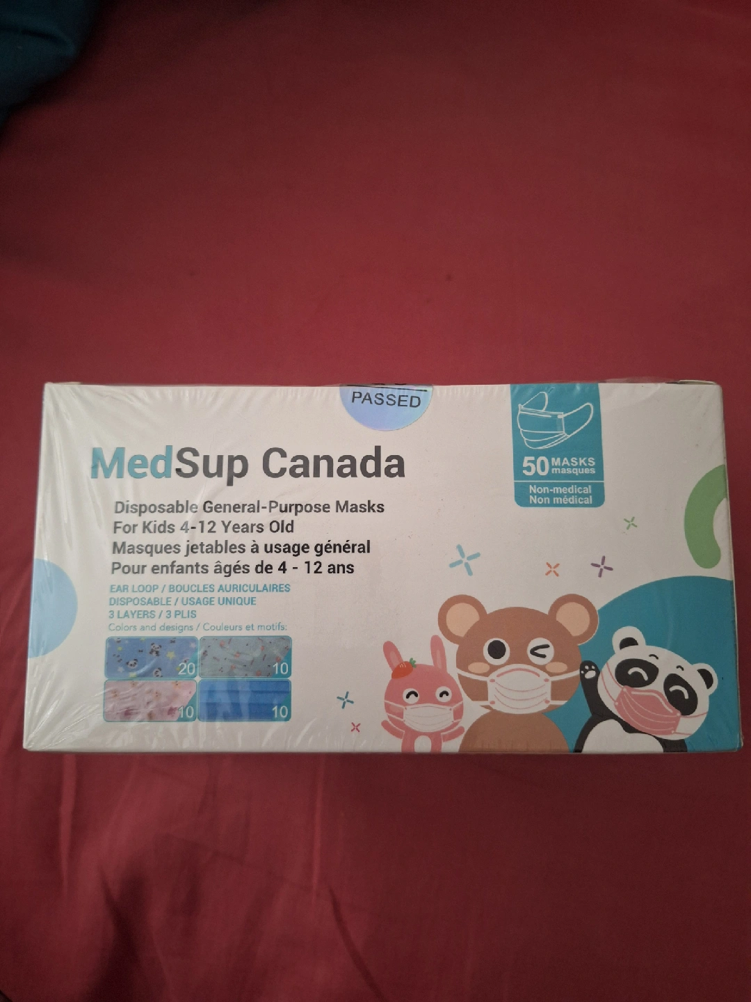 Selling a brand new, sealed box of MedSup Canada disposable masks for kids aged 4-12 years. The box contains 50 non-medical masks with ear loops and 3 layers for protection. They come in assorted colours and designs!