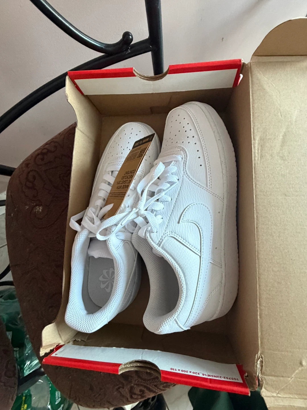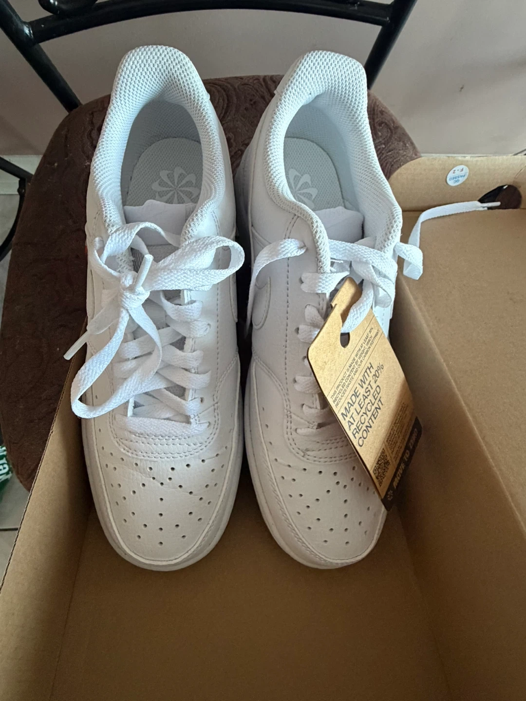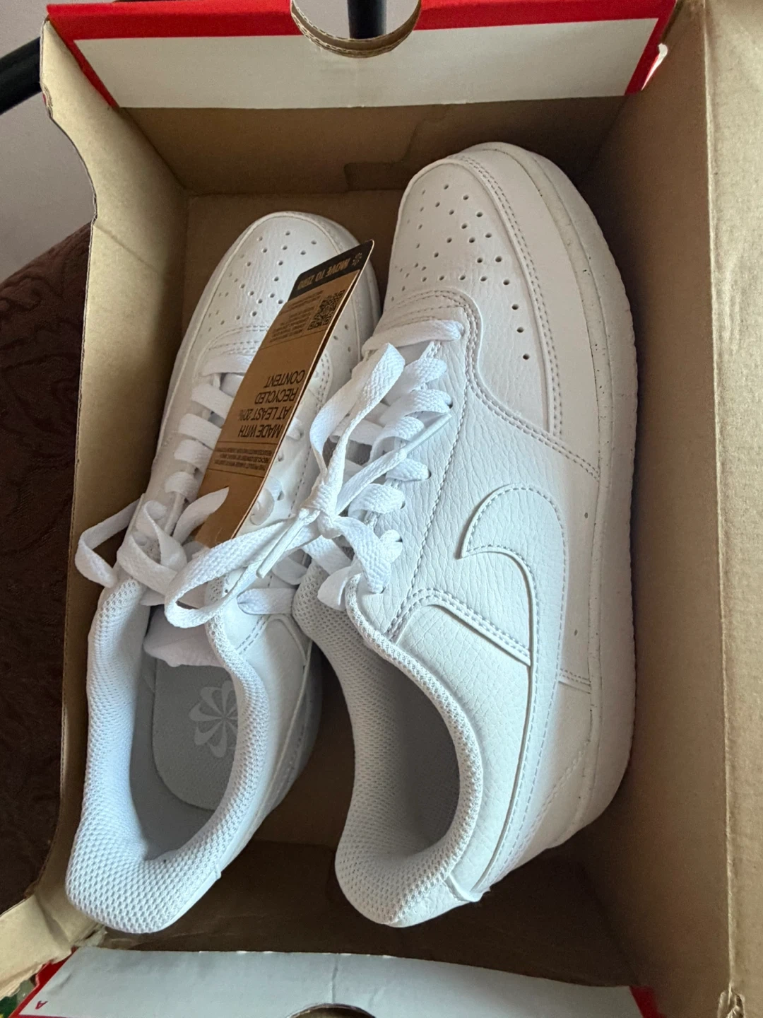 These white leather Nike Air Force 1 sneakers are a classic choice. They're made with at least 20% recycled content. These are great for everyday wear and a versatile addition to any wardrobe!