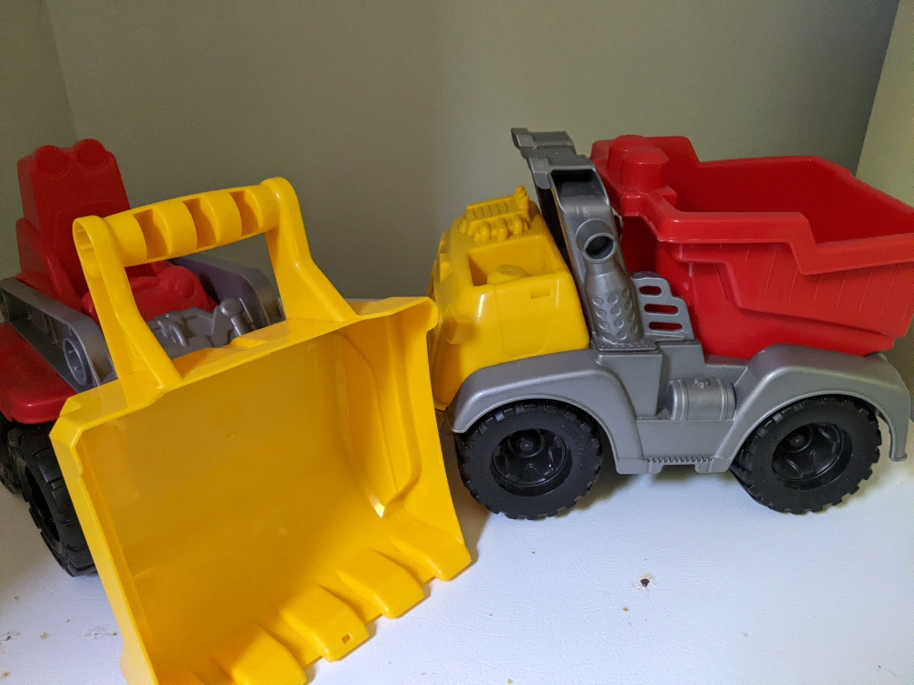 Two sturdy Mega bloks work trucks ready for some fun! One is primarily red and the other is yellow. Great for indoor or outdoor play! 12 inch approx - large/ plastic for the mega Bloks people $30 for two