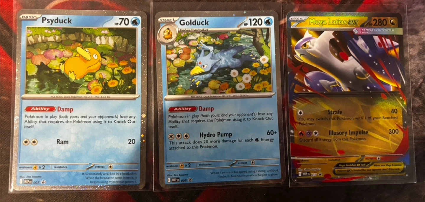 Selling three Pokemon cards: Psyduck, Golduck, and Mega Latias EX All cards are Near Mint. Cash & Pick up only