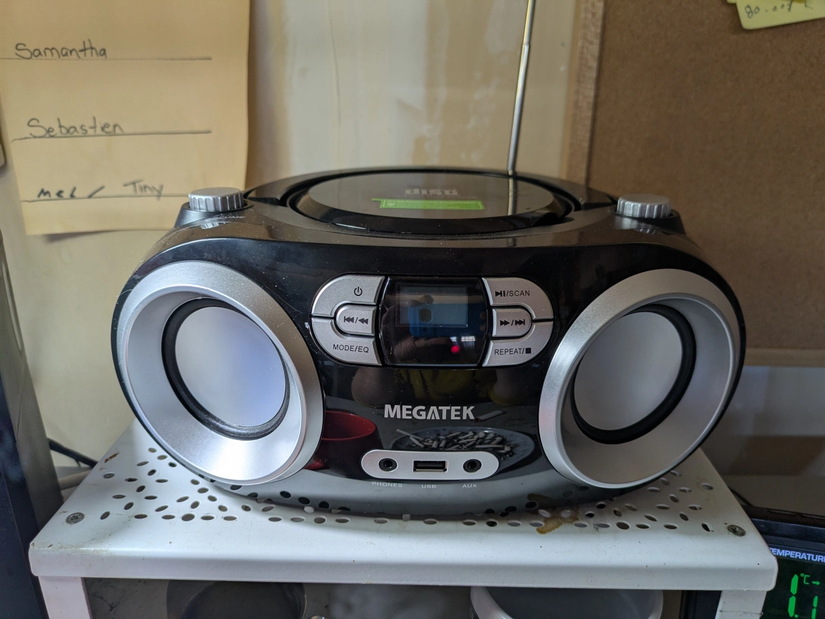 Selling a Megatek CD player. It's black and silver, with an antenna. Has a display screen and buttons for play, pause, repeat, and scan. There are also ports for headphones, USB, and AUX cables. Perfect for listening to your favourite tunes!