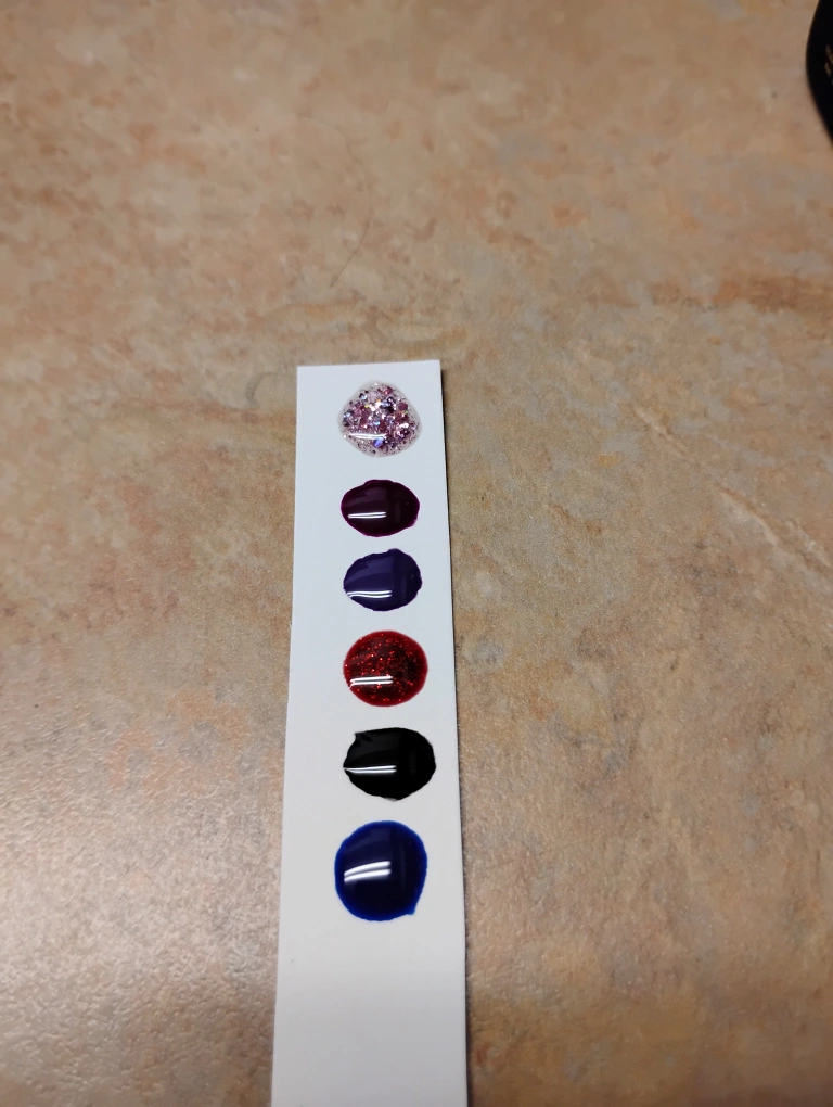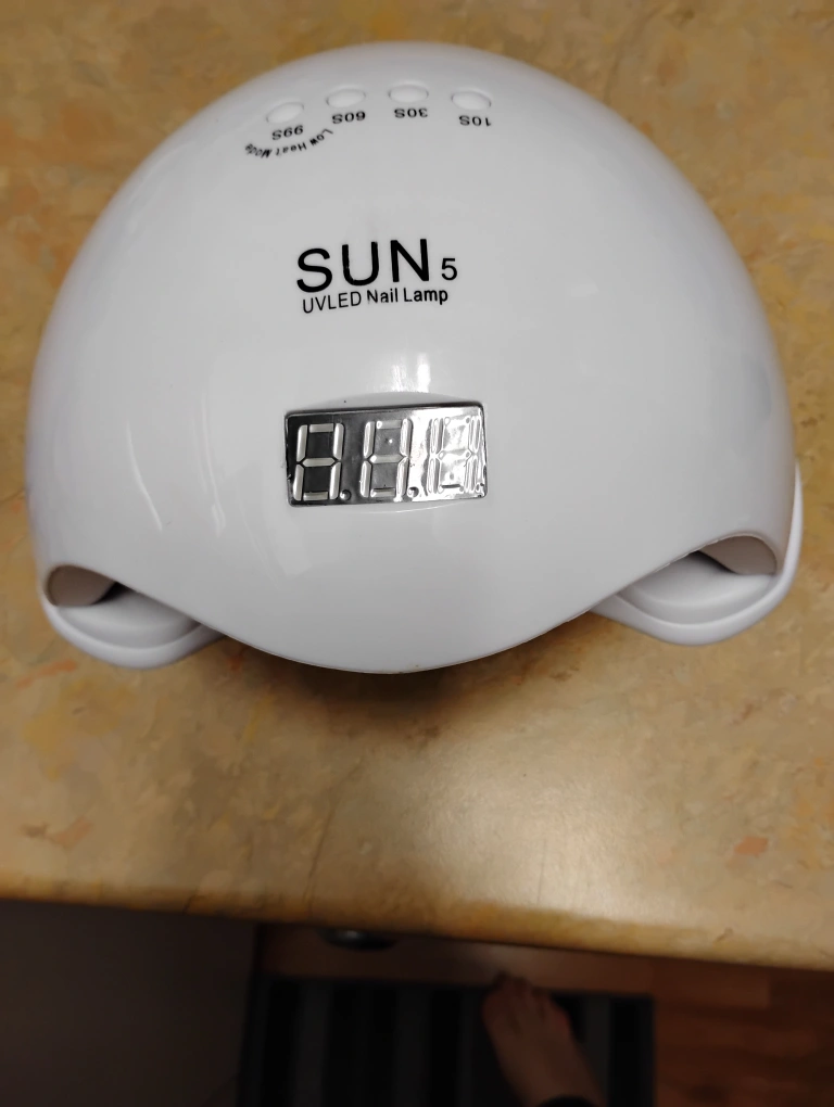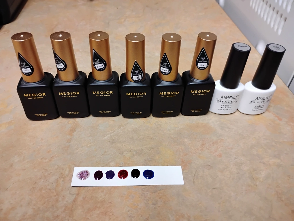 Selling a set of 6 Megior soak off UV gel nail polishes in the colors glitter rose, rose purple, purple, red glitter, black and blue. Also included is an AIMEILI soak off UV/LED base coat and no wipe top coat, and a SUN 5 UVLED nail lamp to complete the set! Perfect for doing your own manicures at home.