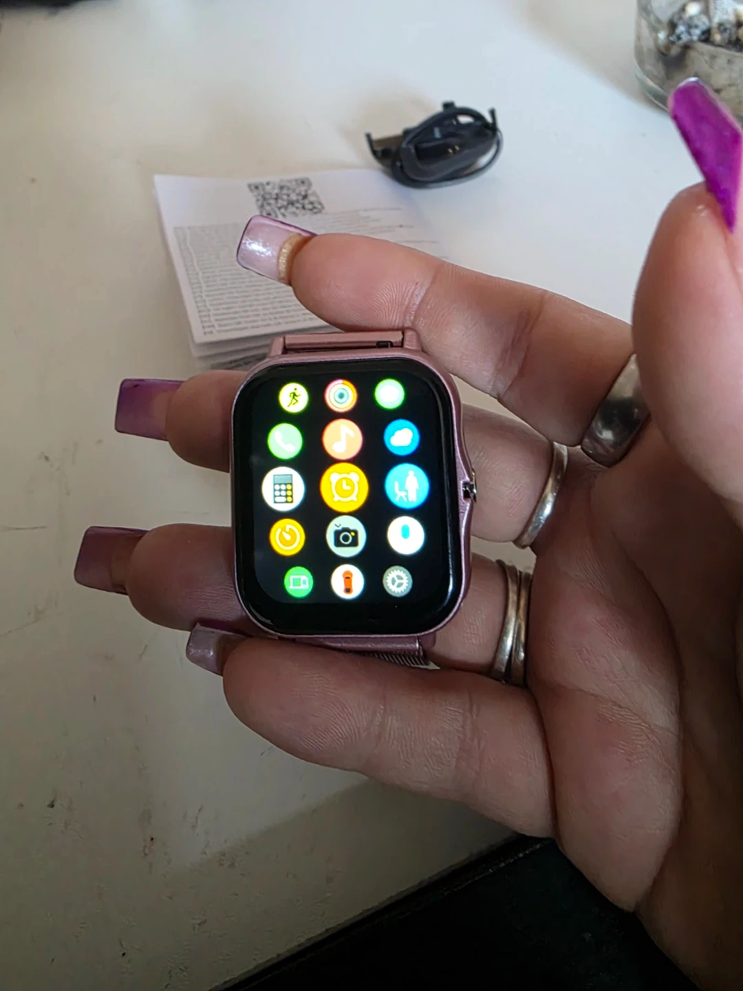 Smart watch in a rose gold colour. It comes with a charging cable. The watch displays time, date, steps, distance, and calories. It also has various app icons visible.